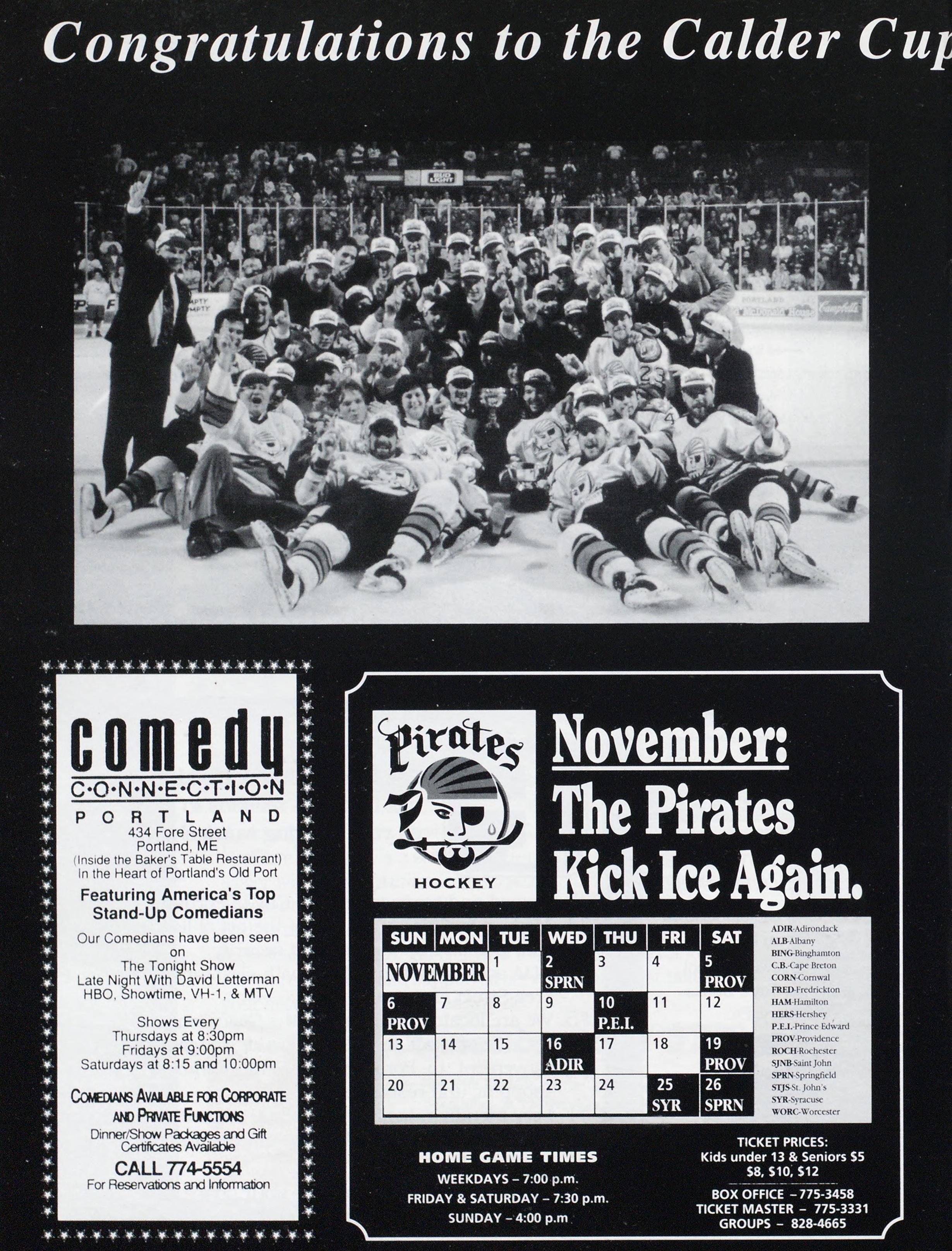 Next,wewentdownthestreetto anItalianrestaurantcalledthe Napoli.TheItaliandecorconsisted of some brightly colored vases placedinnichesaroundtheroom. Laterachangeinnichedecoration wasallittooktotransformthe restaurantfromItaliantoChinese. After lunch came the piece de resistance—anafternooninPort¬ land’smoviepalace,theStateThe¬ atre. Handsome Henry was but a preludetotheglamourwithin.The bersthetime“DickChadwick,one ofourbestdefensemen,parkedhis VWvanrightontheedgeoftheice beforeagame.Insteadofbacking upwhenitwastimetogo,hewent forward,rightovertheice,and wentrightin!Betteand1werecochairsoftheWaynfletePTA(where B.D.,BetteandGary’sdaughter, was a student), which doesn’t sound very hockey-like, but it was."Heremembersnooathsdur¬ inggamesfromBetteorGary“that areprintable,buttheylovedithere inPortland,theyreallydid."The photo above shows Gary, in his trademarkkiltandtam-o-shanter, maneuvering for a shot against Dexter “Wig" Hunnean. Merrill, who had attended Bowdoin and TrinityCollegesandisbestknown forhisrolesin“12O’clockHigh" and“AllAboutEve,"wascaptainof the hockey team at Loomis prep schoolinHartfordandhadplayed inanamateurleaguethatroamed to games from New Haven to Springfield.BeyondPorteous,oth¬ erlocalplayersincludedbusiness¬ menHankPayson,BobJurgenson, Sonny Morrill. Robinson Cooke, JohnRobinson,andParkerPoole. “Iwastheonlygypsy,"wroteMer¬ rillinhisveryfine1988autobiog¬ raphy Bette,Rita,andtheRestof