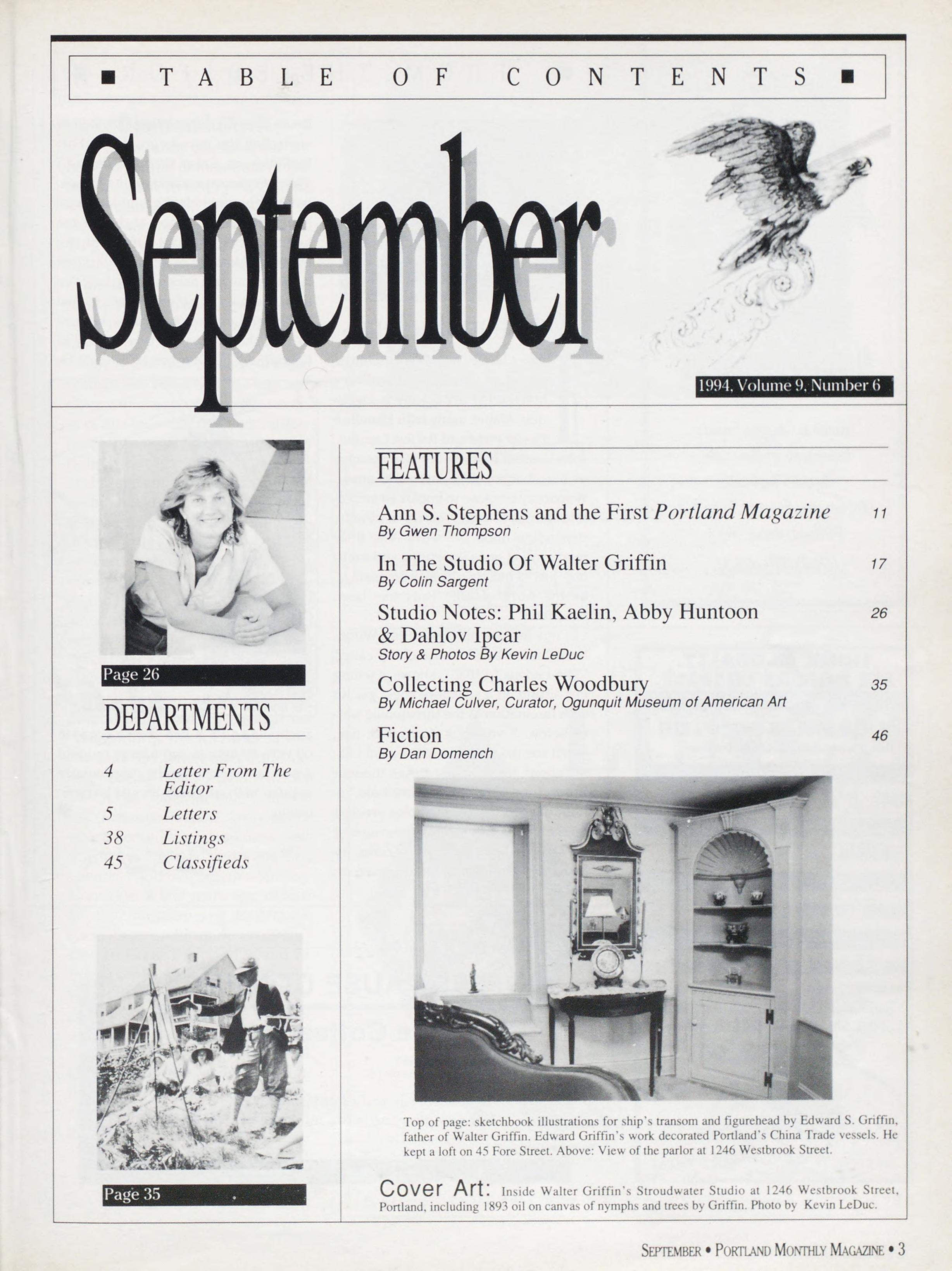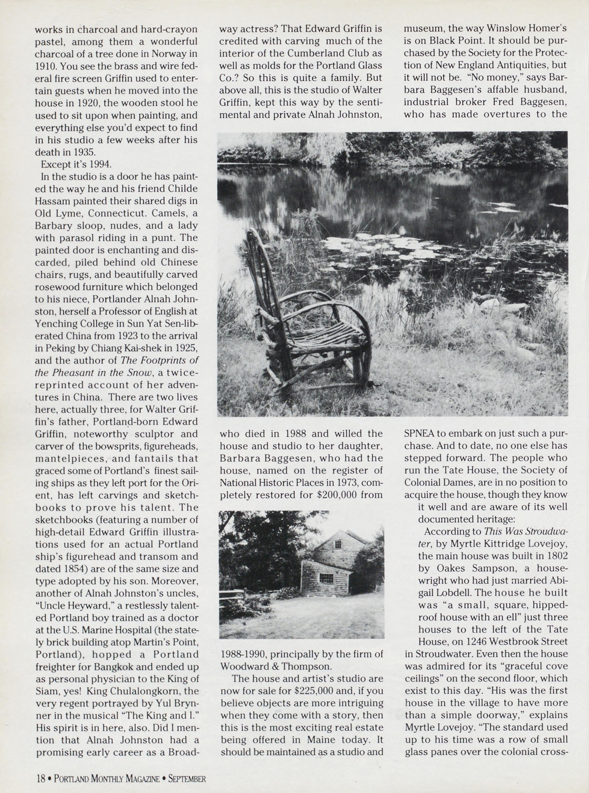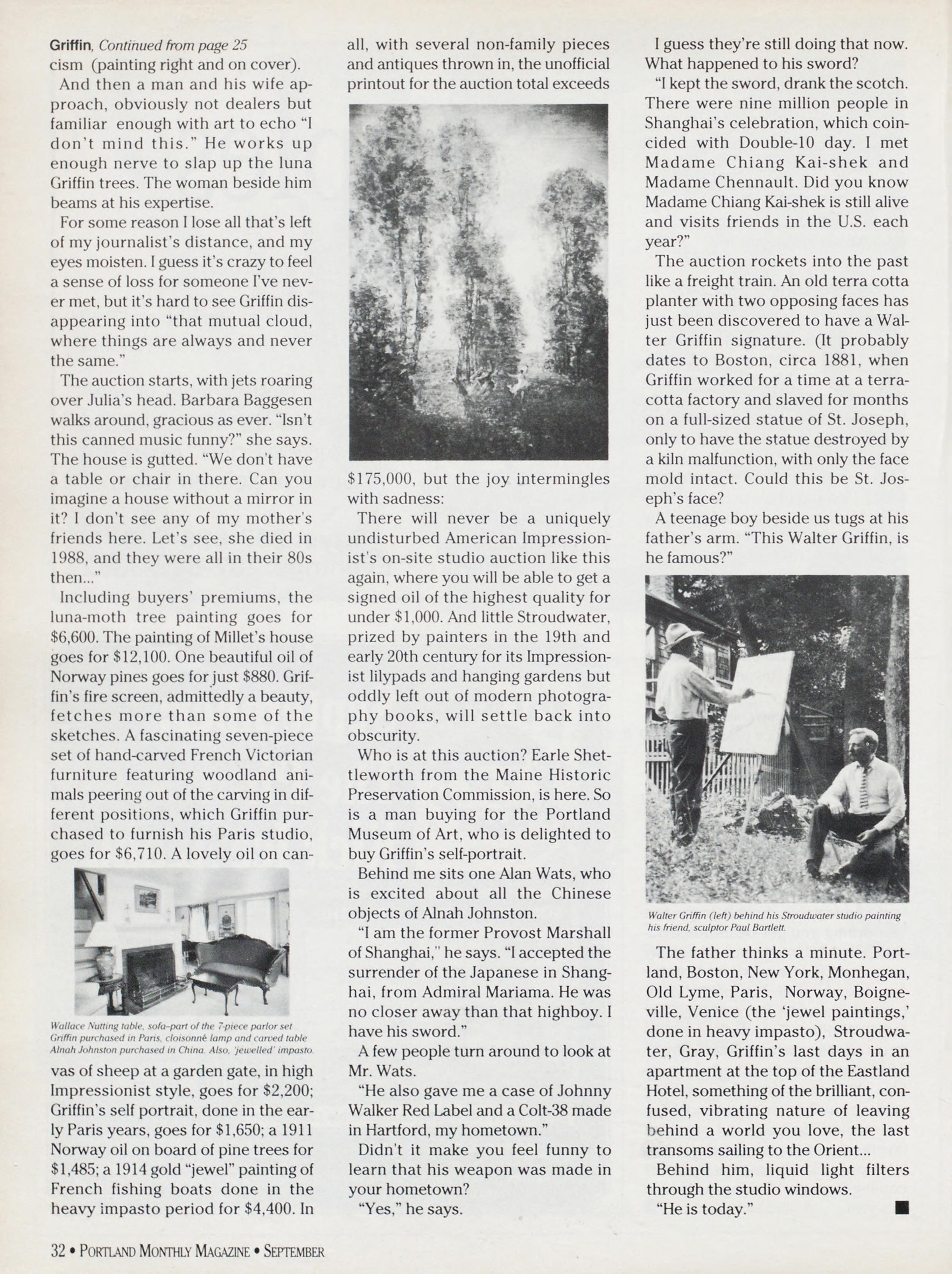 Inthestudioisadoorhehaspaint¬ edthewayheandhisfriendChilde Hassampaintedtheirshareddigsin Old Lyme, Connecticut. Camels, a Barbary sloop, nudes, and a lady withparasolridinginapunt.The painteddoorisenchantinganddis¬ carded, piled behind old Chinese chairs,rugs,andbeautifullycarved rosewood furniture which belonged tohisniece,PortlanderAlnahJohn¬ ston,herselfaProfessorofEnglishat YenchingCollegeinSunYatSen-lib¬ eratedChinafrom1923tothearrival inPekingbyChiangKai-shekin1925, and the author of The Footprints of the Pheasant in the Snow, a twicereprinted account of her adven¬ turesinChina.Therearetwolives here,actuallythree,forWalterGrif¬ fin’sfather,Portland-bornEdward Griffin, noteworthy sculptor and carverofthebowsprits,figureheads, mantelpieces, and fantails that gracedsomeofPortland’sfinestsail¬ ingshipsastheyleftportfortheOri¬ ent, has left carvings and sketch¬ books to prove his talent. The sketchbooks(featuringanumberof high-detailEdwardGriffinillustra¬ tions used for an actual Portland ship’s figurehead and transom and dated1854)areofthesamesizeand typeadoptedbyhisson.Moreover, anotherofAlnahJohnston’suncles, “UncleHeyward,”arestlesslytalent¬ edPortlandboytrainedasadoctor attheU.S.MarineHospital(thestate¬ lybrickbuildingatopMartin’sPoint, Portland), hopped a Portland freighterforBangkokandendedup aspersonalphysiciantotheKingof Siam,yes!KingChulalongkorn,the veryregentportrayedbyYulBrynnerinthemusical“TheKingand1.” Hisspiritisinhere,also.Did1men¬ tion that Alnah Johnston had a promisingearlycareerasaBroad¬
