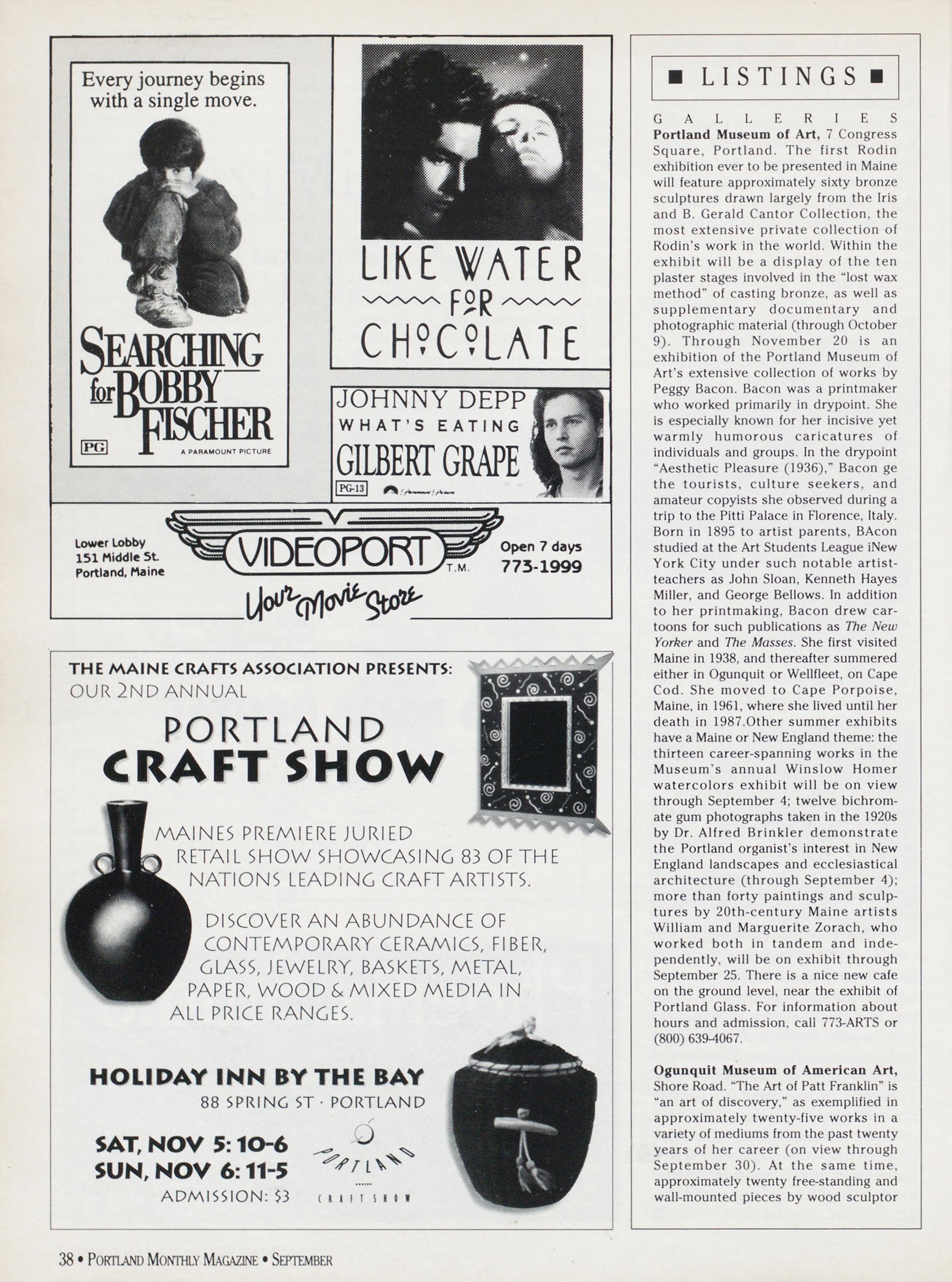 GALLERIES PortlandMuseumofArt, 7 Congress Square, Portland. The first Rodin exhibitionevertobepresentedinMaine willfeatureapproximatelysixtybronze sculpturesdrawnlargelyfromtheIris andB.GeraldCantorCollection,the mostextensiveprivatecollectionof Rodin’sworkintheworld.Withinthe exhibitwillbeadisplayoftheten plasterstagesinvolvedinthe“lostwax method”ofcastingbronze,aswellas supplementary documentary and photographicmaterial(throughOctober 9). Through November 20 is an exhibitionofthePortlandMuseumof Art’sextensivecollectionofworksby Peggy Bacon. Bacon was a printmaker whoworkedprimarilyindrypoint.She isespeciallyknownforherincisiveyet warmly humorous caricatures of individualsandgroups.Inthedrypoint “AestheticPleasure(1936),"Baconge the tourists, culture seekers, and amateurcopyistssheobservedduringa triptothePittiPalaceinFlorence,Italy. Bornin1895toartistparents,BAcon studiedattheArtStudentsLeagueiNew YorkCityundersuchnotableartist¬ teachersasJohnSloan,KennethHayes Miller,andGeorgeBellows.Inaddition to her printmaking, Bacon drew car¬ toonsforsuchpublicationsas The New Yorker and The Masses. Shefirstvisited Mainein1938,andthereaftersummered eitherinOgunquitorWellfleet,onCape Cod. She moved to Cape Porpoise, Maine,in1961,wheresheliveduntilher death in 1987.Other summer exhibits haveaMaineorNewEnglandtheme:the thirteencareer-spanningworksinthe Museum’s annual Winslow Homer watercolors exhibit will be on view throughSeptember4;twelvebichrom¬ ategumphotographstakeninthe1920s by Dr. Alfred Brinkler demonstrate thePortlandorganist'sinterestinNew Englandlandscapesandecclesiastical architecture (through September 4); morethanfortypaintingsandsculp¬ tures by 20th-century Maine artists William and Marguerite Zorach, who worked both in tandem and inde¬ pendently,willbeonexhibitthrough September25.Thereisanicenewcafe onthegroundlevel,neartheexhibitof PortlandGlass.Forinformationabout hoursandadmission,call773-ARTSor (800)639-4067.