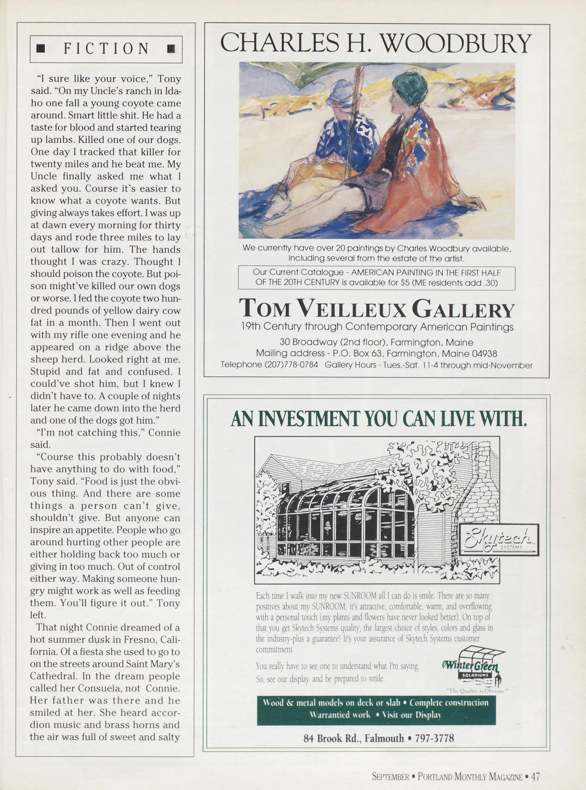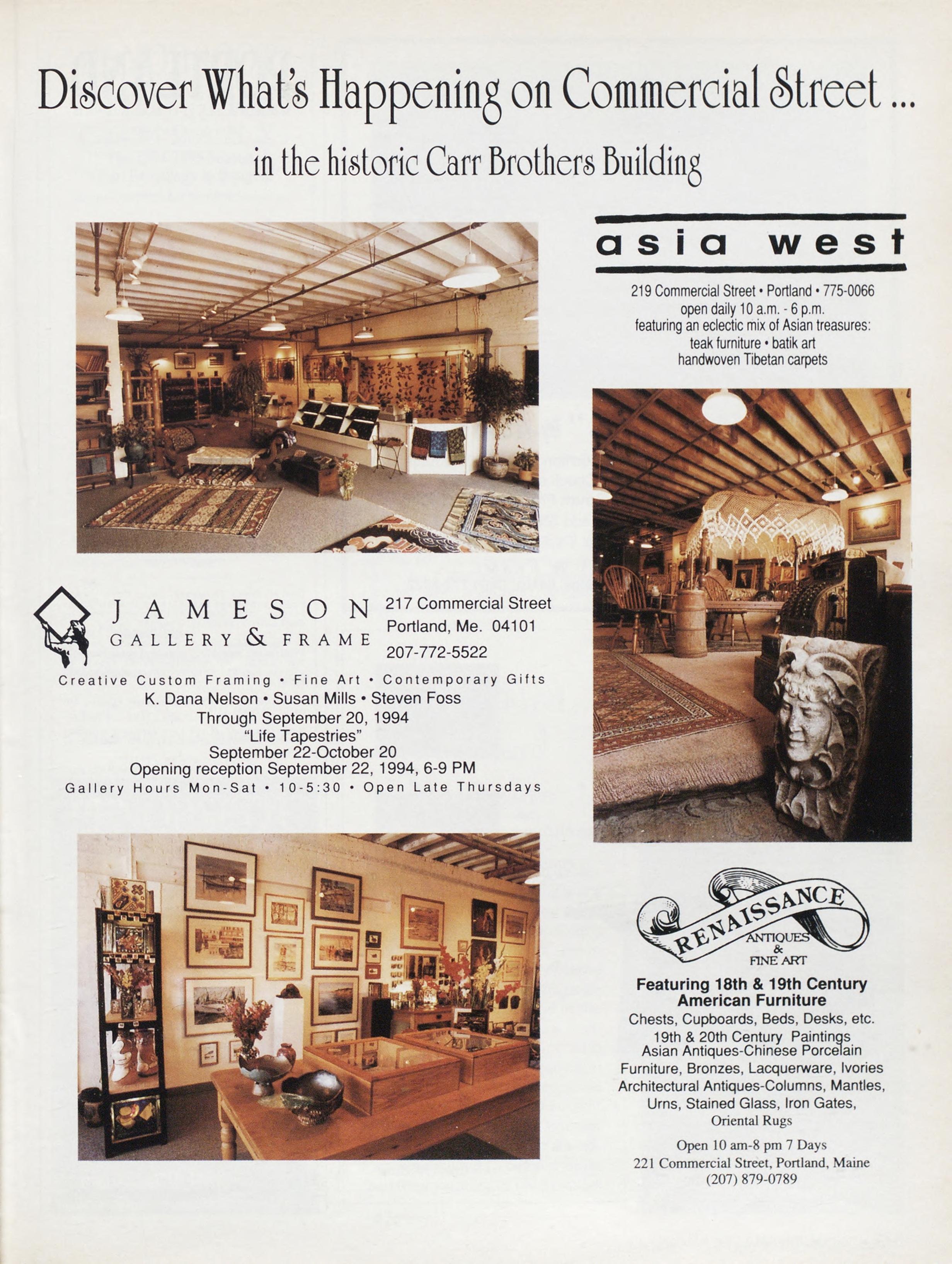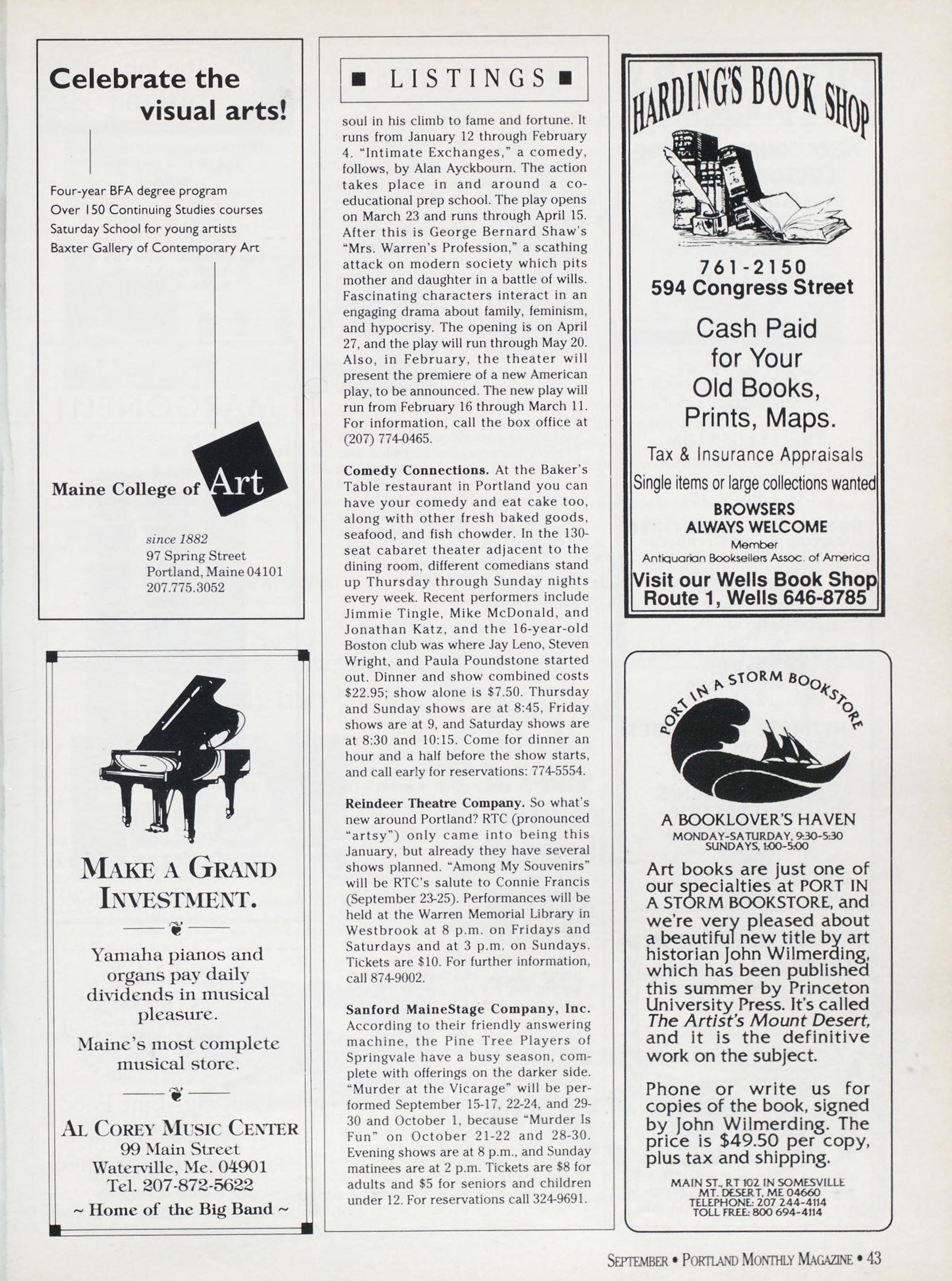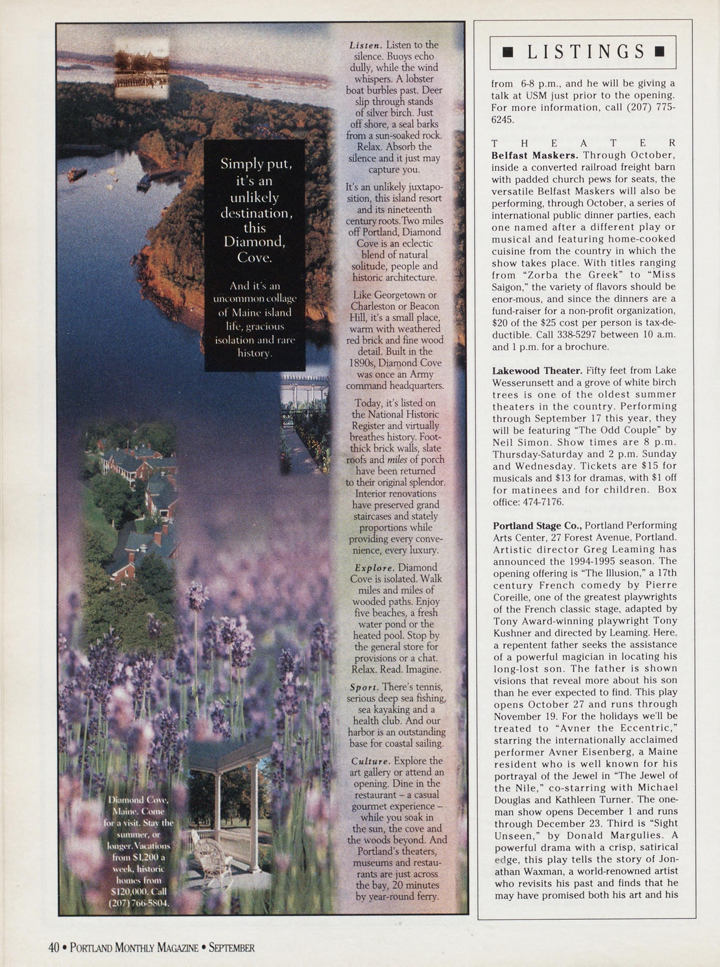 Newsstand Cover Date: September 1994. pub¬ lished August 1994. Vol. 9. No. 6. copyright 1994. Portland Monthly Magazine is mailed at third-class mail rales in Portland. ME 04101 (ISSN: 0887-5340). Opinions expressed in articles are those of authors and do not represent editorial portions of Portland Magazine. Re¬ sponsible only for that portion of any adver¬ tisement which is printed incorrectly, and as compensation we will run a correction in the following issue. Nothing in this issue ma) be reprinted in whole or in part without written permission from the publishers. Submissions welcome, but we take no responsibility for unsolicited materials.