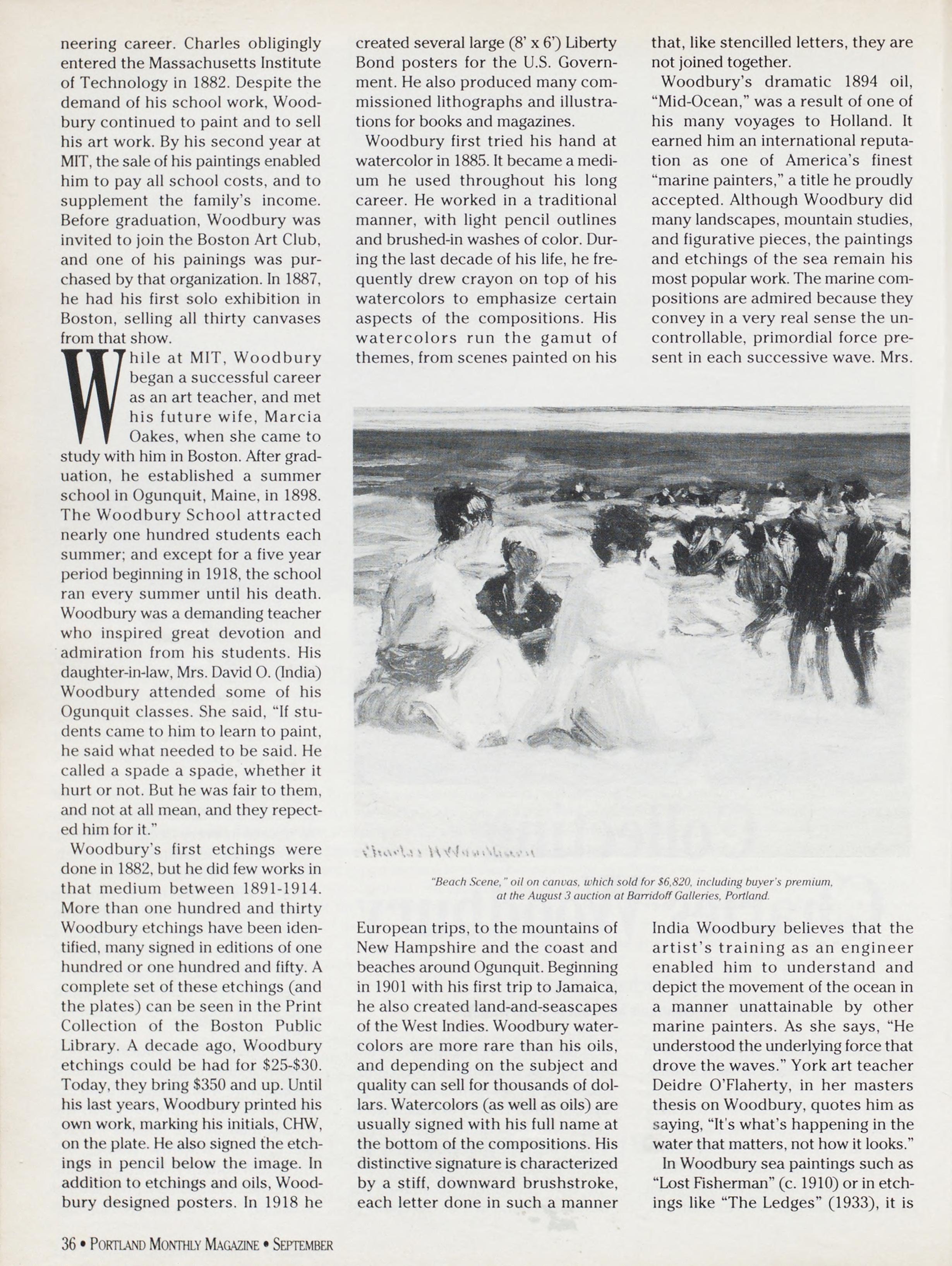InspiteofWoodbury’ssuccesses, the years between 1940 and 1988 werenotkindtohismemory-an“art world” occurrence that would not havesurprisedthepractical,no-non¬ senseYankeeartist.Itwouldsurely have delighted him, however, that nearlyfiftyyearsafterhisdeathcol¬ lectors of American art have once again “discovered” Charles Wood¬ bury,NationalAcademy,andthathis re-emergenceislargelytheresultofa 1988retrospectiveheldathisalma mater, MIT. The man who thought $2,000afairpriceforoneofhisbest paintings would have been even moreastonishedtolearnthatrecent¬ lyhisoil“VictoryParade,”soldin New York City for approximately $80,000. And that one of his much sought-after“beachscene”paintings isnowreportedlybeingofferedfor $150,000.Sostrong,infact,isthe renewedinterestinhiswork,thata non-profit “Woodbury Society” has recentlybeenformedinOgunquitby anavidWoodburycollector.