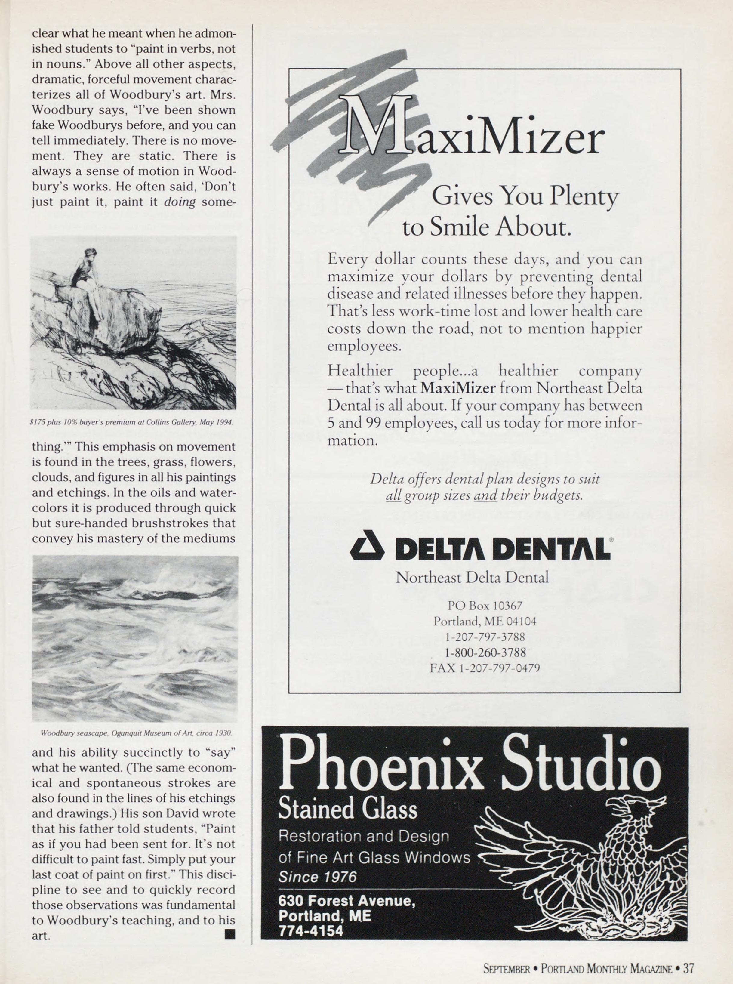 The Woodbury School attracted nearly one hundred students each summer;andexceptforafiveyear periodbeginningin1918,theschool ran every summer until his death. Woodbury was a demanding teacher who inspired great devotion and admiration from his students. His daughter-in-law,Mrs.David0.(India) Woodbury attended some of his Ogunquitclasses.Shesaid,“Ifstu¬ dentscametohimtolearntopaint, hesaidwhatneededtobesaid.He calledaspadeaspade,whetherit hurtornot.Buthewasfairtothem, andnotatallmean,andtheyrepectedhimforit.”