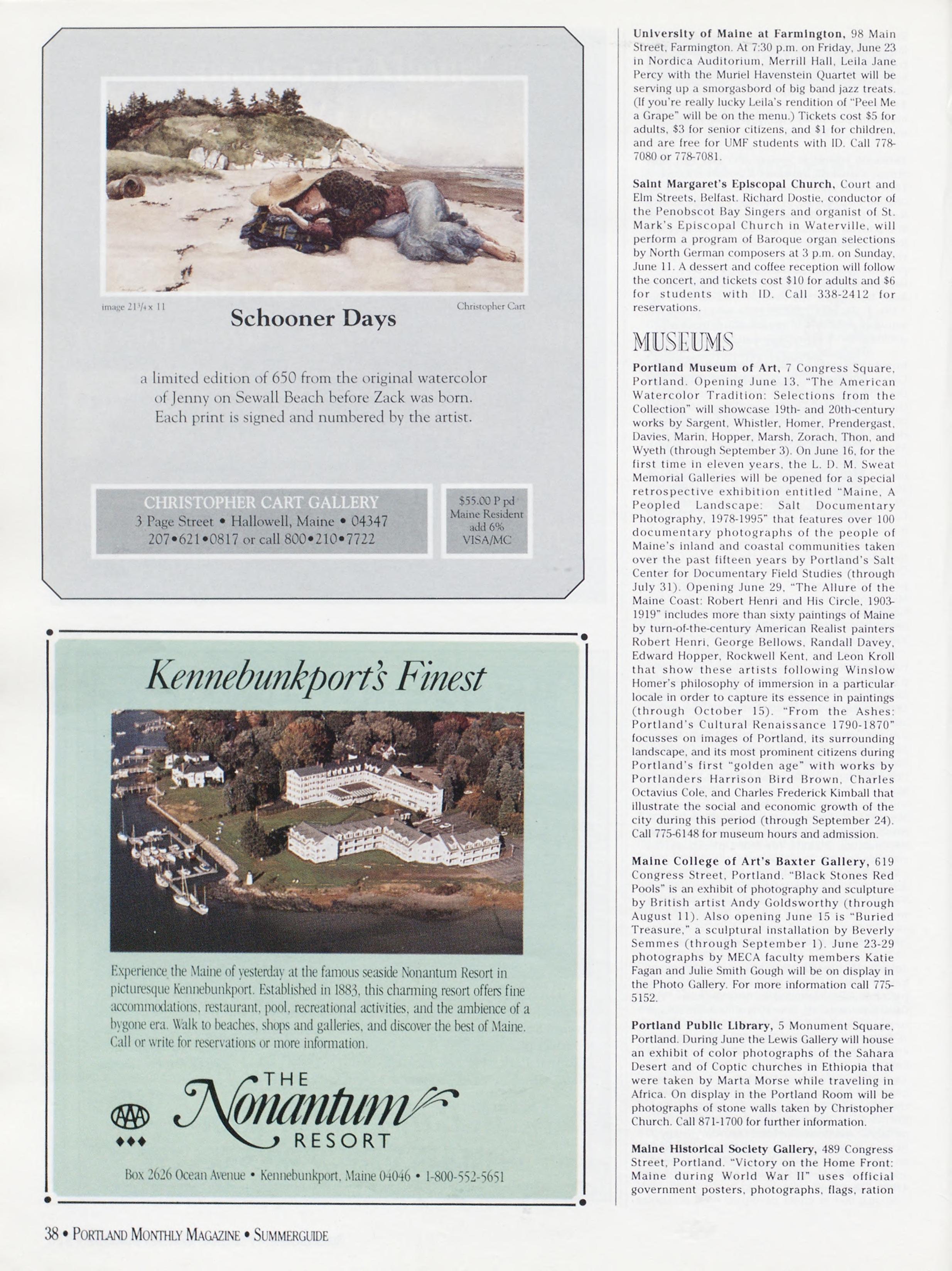 Portland Museum of Art, 7CongressSquare. Portland. Opening June 13. “The American WatercolorTradition:Selectionsfromthe Collection”willshowcase19th-and20th-century worksbySargent.Whistler.Homer.Prendergast. Davies.Marin.Hopper.Marsh.Zorach,Thon,and Wyeth(throughSeptember3).OnJune16.forthe firsttimeinelevenyears,theL.D.M.Sweat MemorialGallerieswillbeopenedforaspecial retrospectiveexhibitionentitled“Maine.A Peopled Landscape: Salt Documentary Photography,1978-1995”thatfeaturesover100 documentary photographs of the people of Maine'sinlandandcoastalcommunitiestaken overthepastfifteenyearsbyPortland’sSalt CenterforDocumentaryFieldStudies(through July31).OpeningJune29.“TheAllureofthe MaineCoast:RobertHenriandHisCircle.19031919"includesmorethansixtypaintingsofMaine byturn-of-the-centuryAmericanRealistpainters RobertHenri.GeorgeBellows.RandallDavey. EdwardHopper.RockwellKent,andLeonKroll thatshowtheseartistsfollowingWinslow Homer’sphilosophyofimmersioninaparticular localeinordertocaptureitsessenceinpaintings (through October 15). “From the Ashes: Portland’sCulturalRenaissance1790-1870” focussesonimagesofPortland,itssurrounding landscape,anditsmostprominentcitizensduring Portland’sfirst“goldenage"withworksby Portlanders Harrison Bird Brown. Charles OctaviusCole,andCharlesFrederickKimballthat illustratethesocialandeconomicgrowthofthe cityduringthisperiod(throughSeptember24). Call775-6148formuseumhoursandadmission.