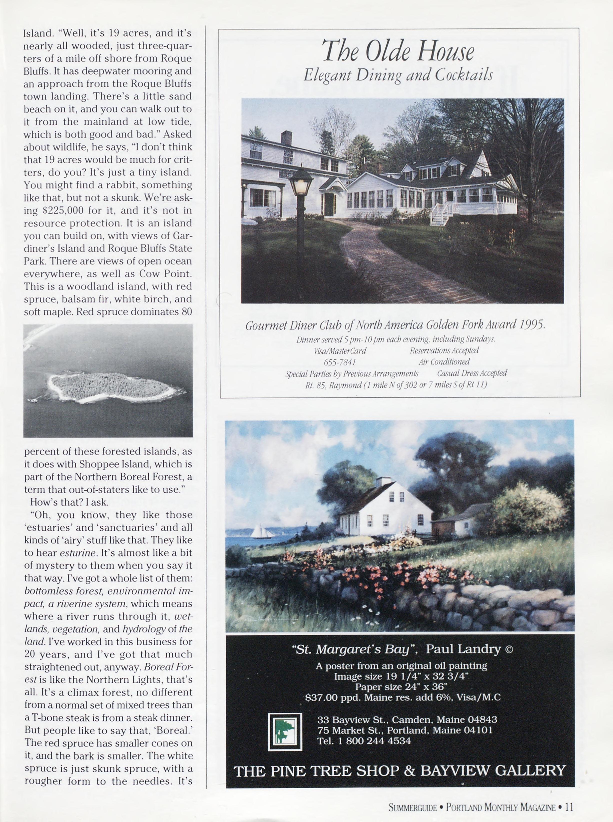 you’re familiar with the Bowdoin PinesinBrunswick,butyougetthe samefeelingonthisislandlookingup atthesetrees.Outtowardtheocean, youcanseespindleswherethereare allkindsofrocksorledges.This islandhappenstobeoneoftheis¬ landsontheIslandTrailAssociation. Itwillbeontheirtrailthissummer, wherepeoplekayakingorsailingcan stayandspendtime,picnicandso on.There’sawonderfulspotwhere you can look way, way acrossthe bay.IalwaystakemyGermanShep¬ herdontheislandwhenIcomehere, tokeepalookout.Therearedeer hereallthetime.Thereareosprey andtheusualseabirds,lobsterbu¬ oyswashingupontheshore,good clammingtowardthepoint.Several old rock foundations from Colo¬ nialtimesarehere,too.Intheear¬ lydays,therewerethreeorfour familieslivingontheisland.There aresomeoldstonewallsandapad¬ dock,wheretheymusthavekeptani¬ mals.Overatthesouthend,there areshellheapswhereIndianswould get clams and oysters and throw them on the shore summer after summer.Theshellheapshavebeen covered up over the years by the earth,though,andpineneedles.At nightyoucanseetheP-3Orionair¬ craftofBrunswickNavalAirStation circlingoverheadallthetime,be¬ causetheislandisonlyfivemilesor sofromtherunways.Taxesareap¬ proximately$1,800peryear.1haven’t kickedaboutit.Inthemiddleofthe island,therealtip-toppartofthe island,youfindyourselfabout40feet abovesealevel.Toseetheisland fromtheshore,startingattheNew MeadowsInnbyWestBath,youdri¬ vesouth,taketheMountainRoad, takethetailendofit,andturnintoa drivewaythattakesyouwithin110 feetoftheisland,becauseit’svery closetothispointthatIown.”
