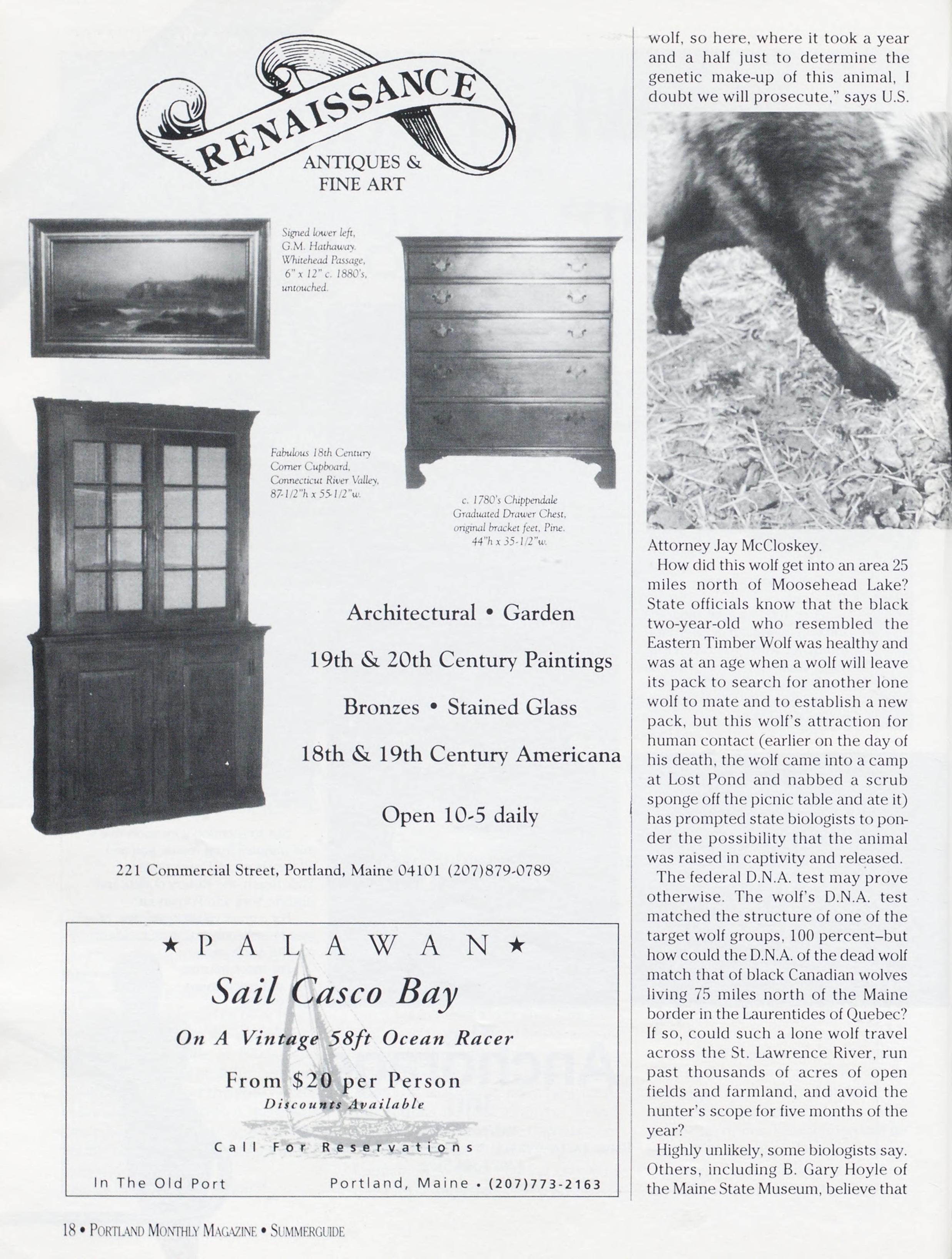 Thisdog-likeanimal,shotinSep¬ tember,1993,isknowninMaineFish &GamecirclesasWolf1.Insubstan¬ tialsightingsofIonewolveshadbeen increasingoverthepastfewyears, butitwasn’tuntilGroftshotthisani¬ mal that the public debate about wolvesinMainetookoff.