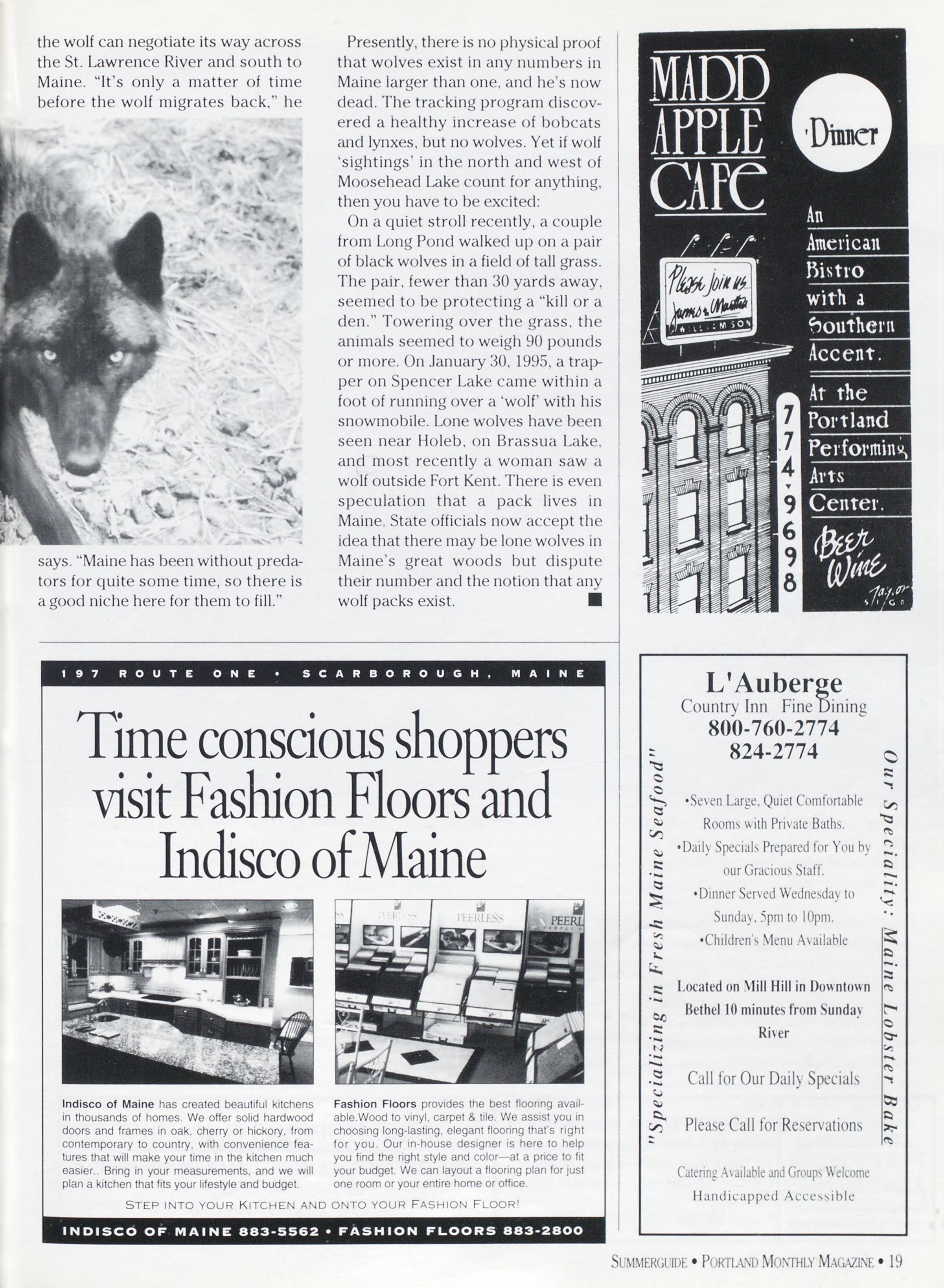Presently,thereisnophysicalproof thatwolvesexistinanynumbersin Mainelargerthanone.andhe’snow dead.Thetrackingprogramdiscov¬ eredahealthyincreaseofbobcats andlynxes,butnowolves.Yetifwolf ‘sightings’inthenorthandwestof MooseheadLakecountforanything, thenyouhavetobeexcited: Onaquietstrollrecently,acouple fromLongPondwalkeduponapair ofblackwolvesinafieldoftallgrass. Thepair,fewerthan30yardsaway, seemedtobeprotectinga“killora den."Toweringoverthegrass,the animalsseemedtoweigh90pounds ormore.OnJanuary30.1995,atrap¬ peronSpencerLakecamewithina footofrunningovera‘wolfwithhis snowmobile.Lonewolveshavebeen seennearHoleb,onBrassuaLake, and most recently a woman saw a wolfoutsideFortKent.Thereiseven speculation that a pack lives in Maine.Stateofficialsnowacceptthe ideathattheremaybelonewolvesin Maine’s great woods but dispute theirnumberandthenotionthatany wolfpacksexist.