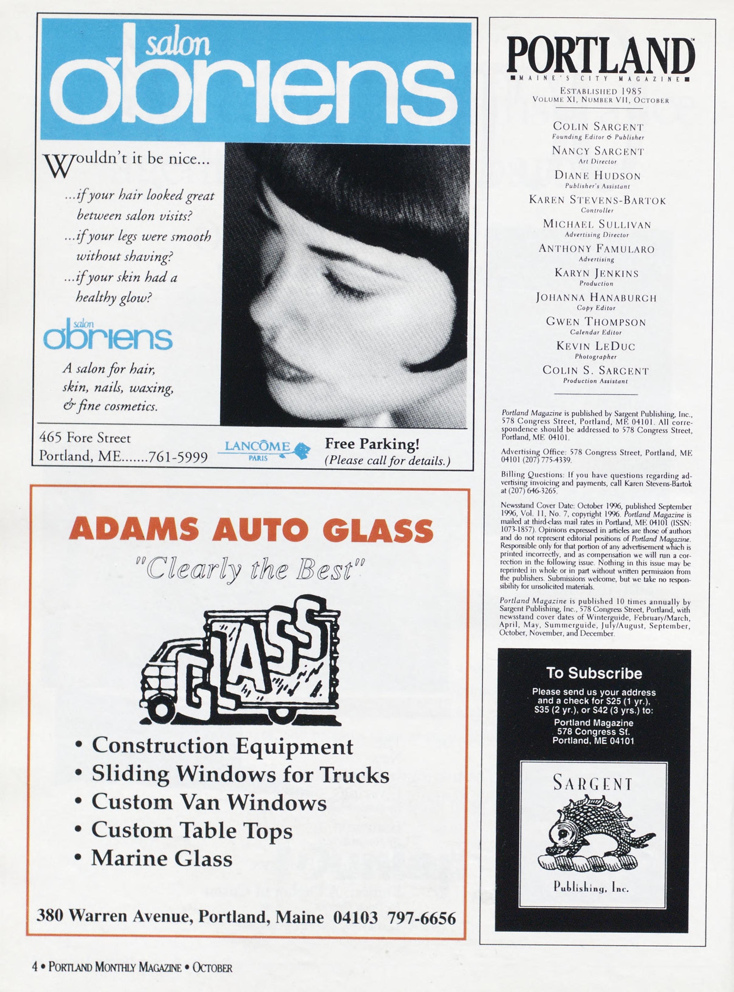 Newsstand Cover Date: October 1996, published September 1996, Vol. 11, No. 7, copyright 1996. Portland Magazineis mailedatthird-classmailratesinPortland,ME04101(ISSN: 1073-1857).Opinionsexpressedinarticlesarethoseofauthors anddonotrepresenteditorialpositionsofPortland Magazine. Responsibleonlyfortliatportionofanyadvertisementwtiichis printed incorrectly, and as compensation we will run a cor¬ rection in the following issue. Nothing in this issue may be reprintedinwholeorinpartwithoutwrittenpermissionfrom die publishers. Submissions welcome, but we take no respon¬ sibilityforunsolicitedmaterials.