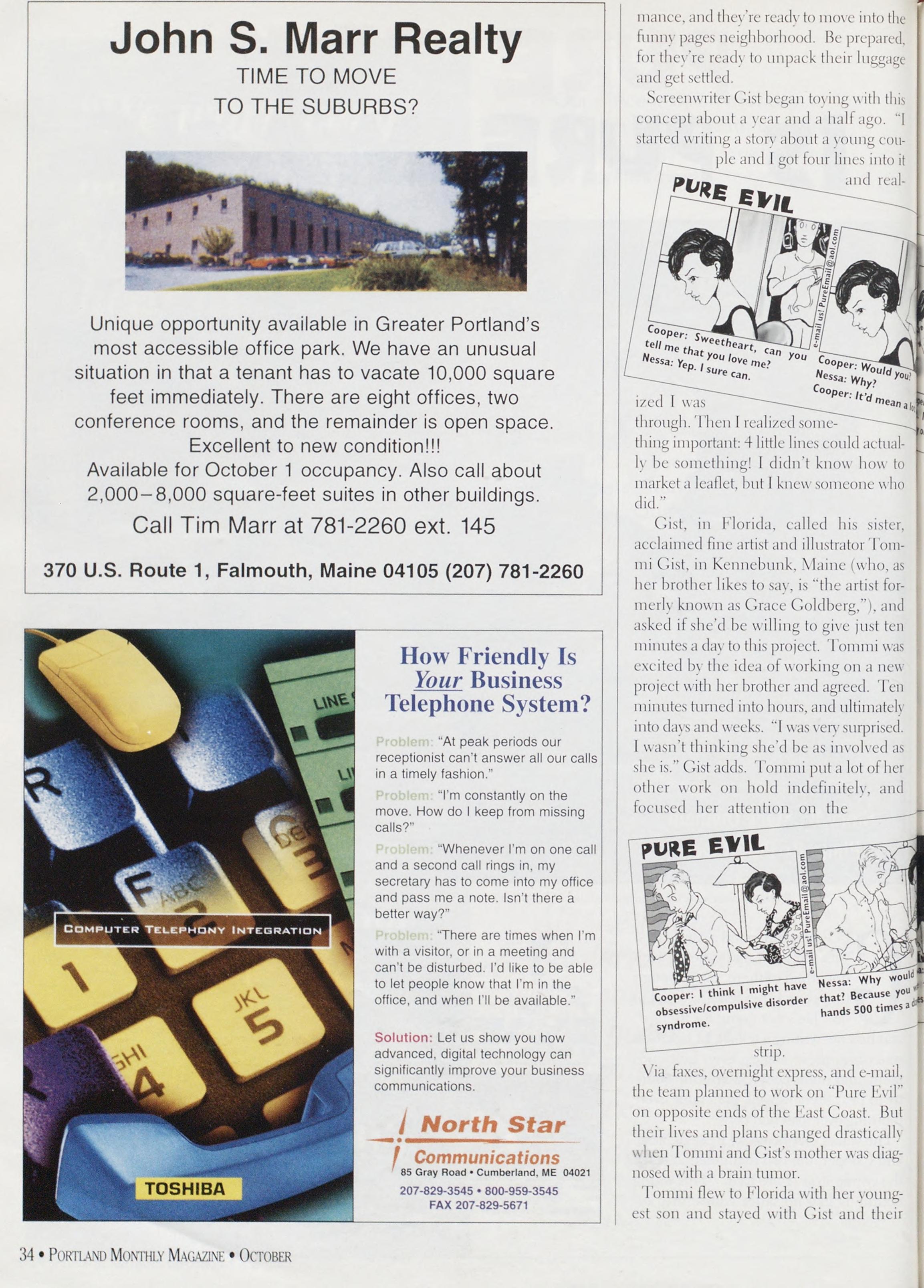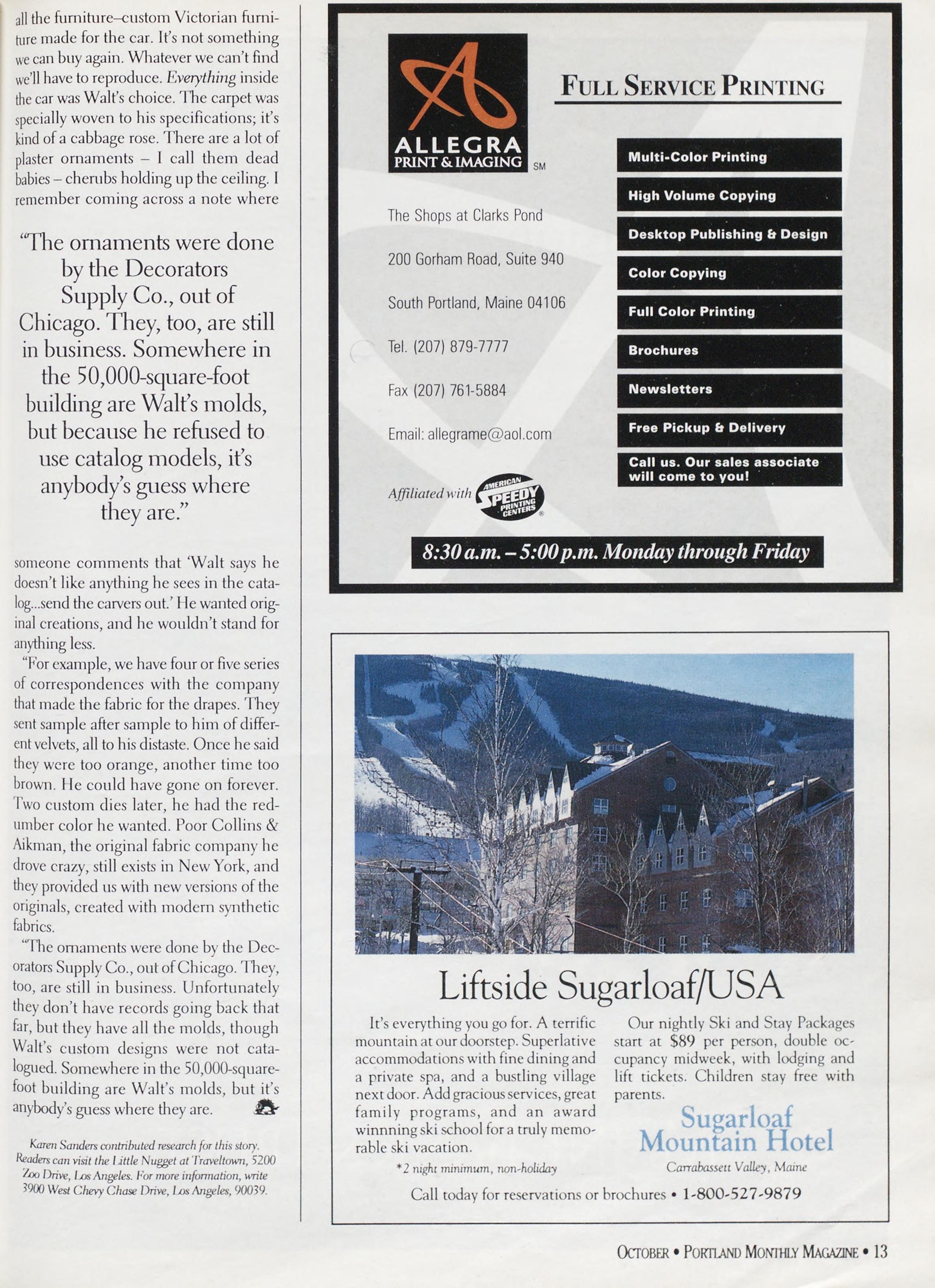 Newsstand Cover Date October 1997. published August 1997, Vol 12, No. 7, copyright 1997 PortlandMagazine ismailedal third-class mad rates in Portland. ME 04101 (ISSN 10731857). Opinions expressed in articles arc those* of autlron and do not represent editorial positions of PortlandMagazine. letters to the editor arc welcome and will be treated as un¬ conditionally aligned for publication and copyright purposes and as subject to PortlandMagazine’s unrestrictedrighttoedit arid comment editorially. Responsible only for that portion of any advertisement which is printed incorrectly Advertisers arc responsible for copynghts of materials they submit Nothing in this issue may lx? reprinted in whole or in part without written permission from the publishers. Submissions arc welcome, but wetakenorcsponsibilitvforunsolicitedmaterials.