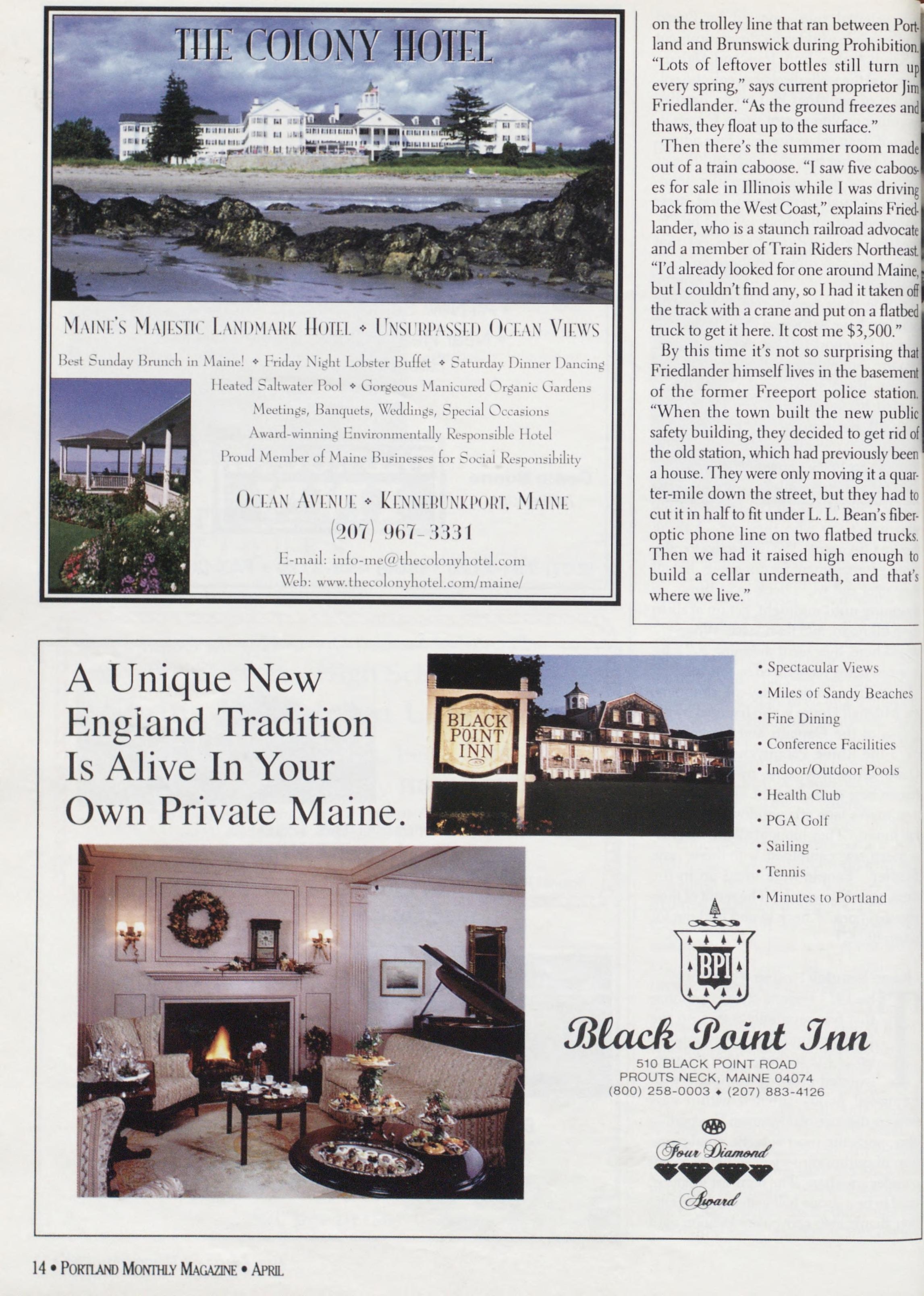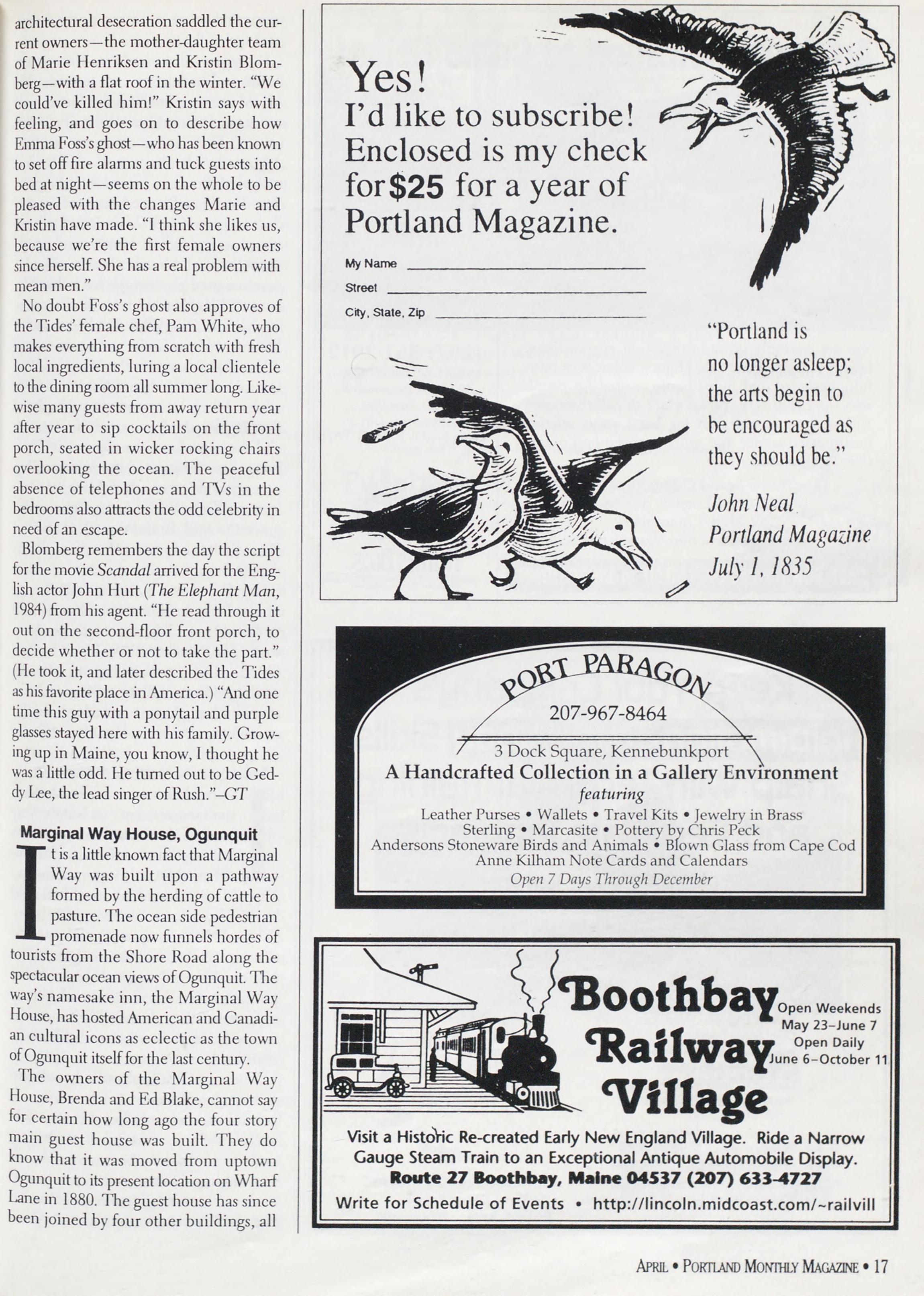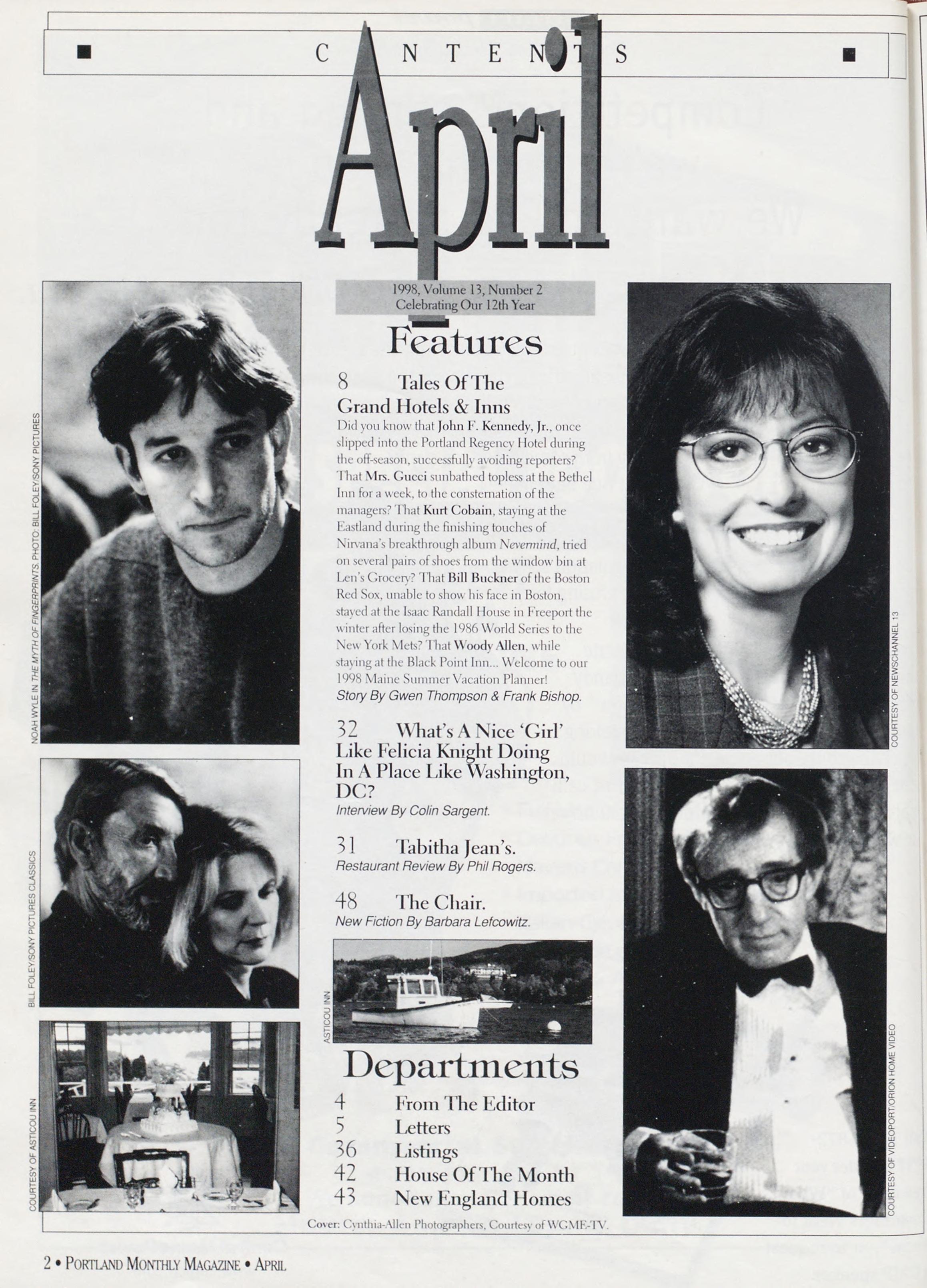 Newsstand Cover Date: April 1998, published March 1998, Vol 13. No. 2, copyright 1998. Portland Magazine ismailedat thud-class mail rates in Portland. ME 04101 (ISSN: 10731857). Opinions expressed in articles arc those of authors and do not represent editorial positions ofPortland Magazine. letters to the editor arc welcome and will be treated as un¬ conditionally assigned for publication and copyright purposes and as subjart toPortland Magazine’s unrestrictedrighttoedit and comment editorially. Responsible only for that portion of any advertisement which is printed incorrectly. Advertisers are responsible copyrights of matenals they submit Nothing in this issue may be reprinted in whole or in part williout written permission from the publishers. Submissions welcome, but we takenorcsponsbilityforunsolicitedmaterials.