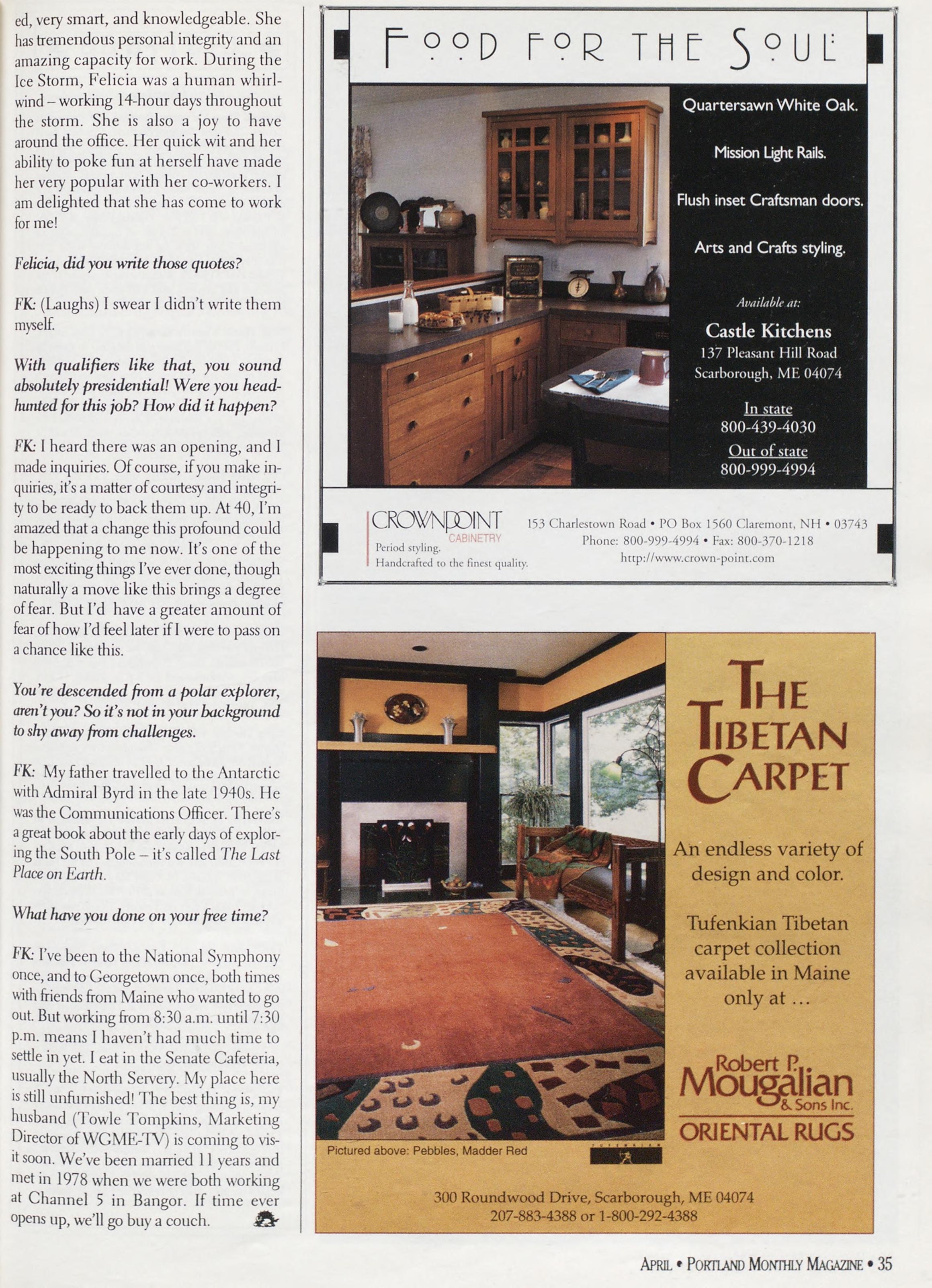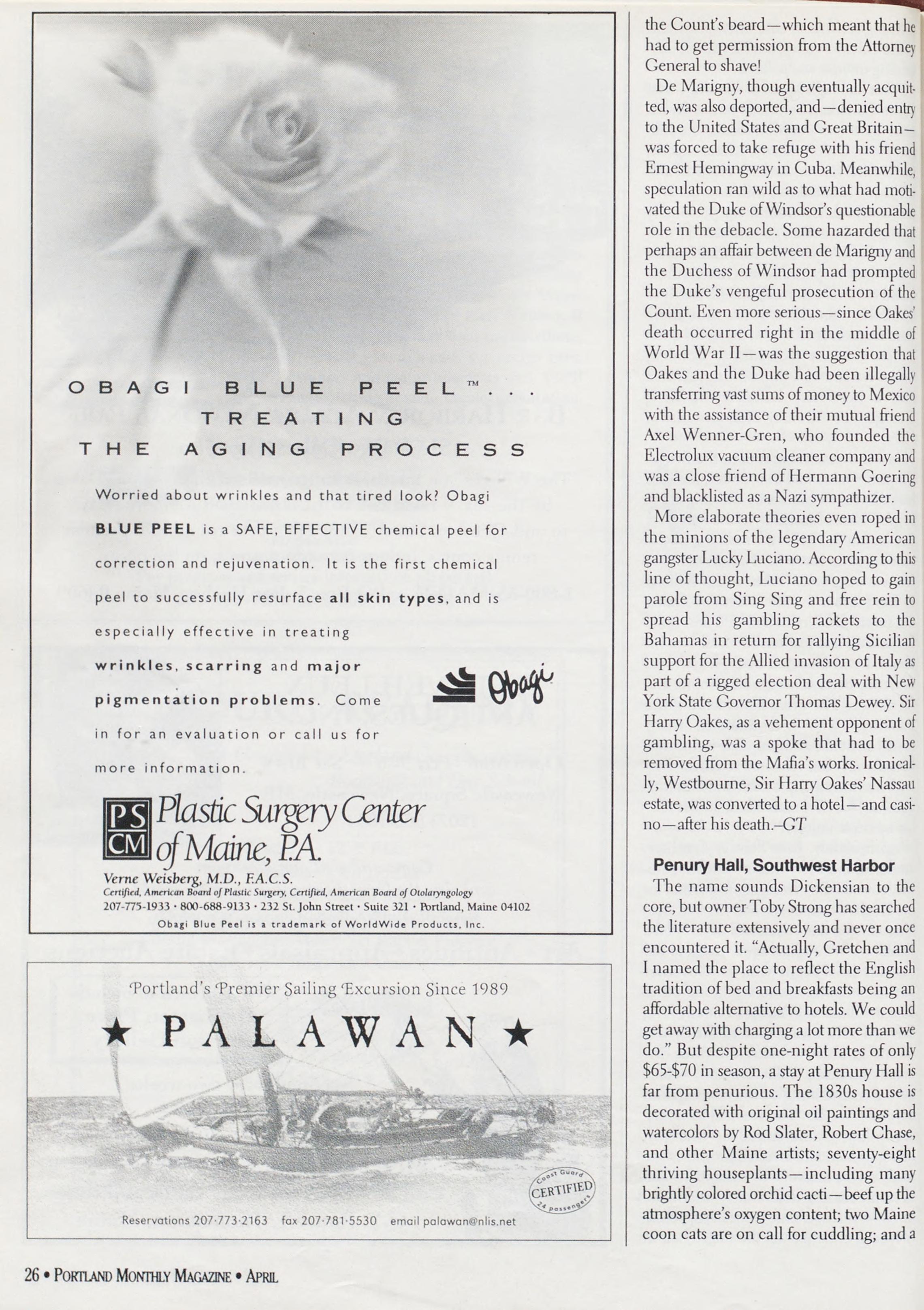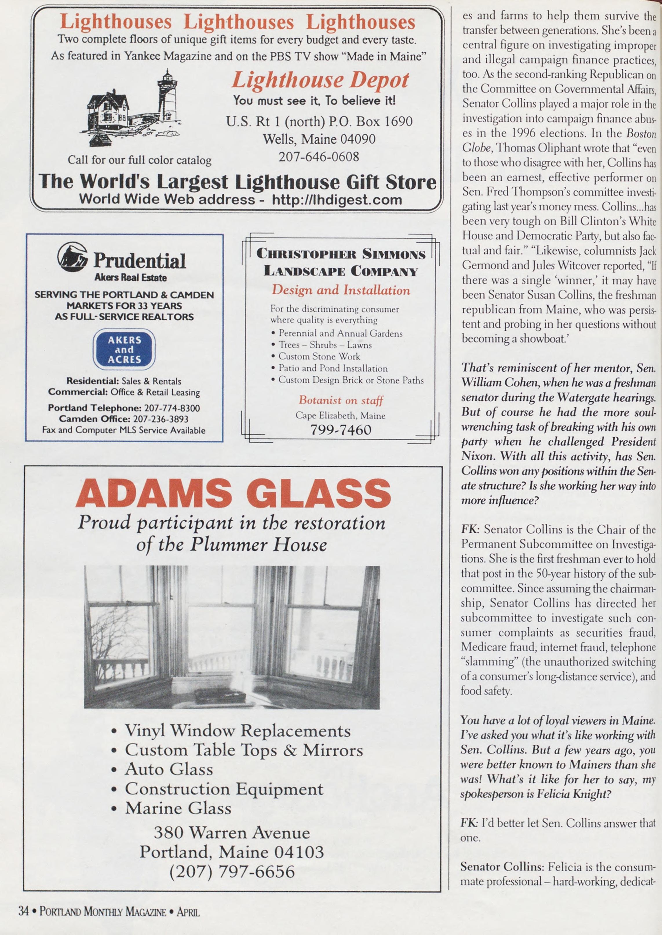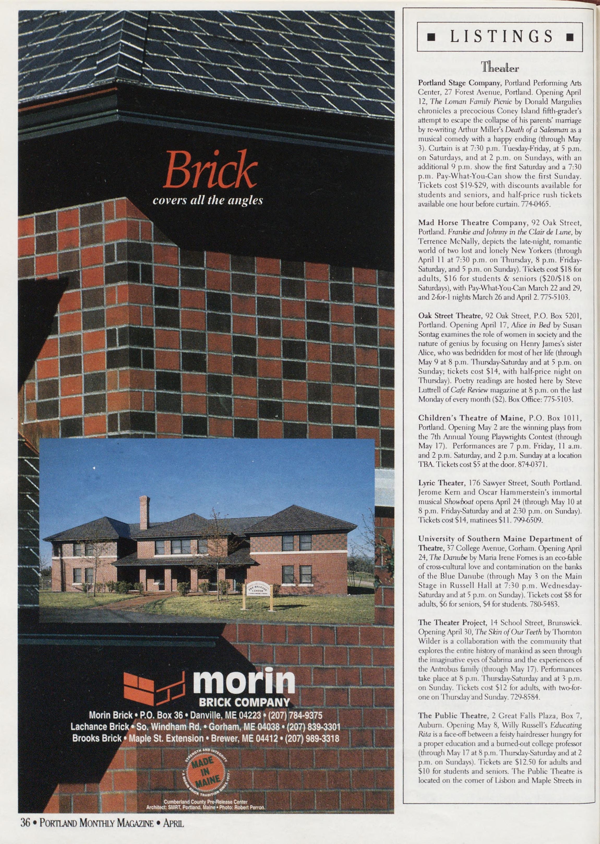 Newsstand Cover Date: April 1998, published March 1998, Vol 13. No. 2, copyright 1998. Portland Magazine ismailedat thud-class mail rates in Portland. ME 04101 (ISSN: 10731857). Opinions expressed in articles arc those of authors and do not represent editorial positions ofPortland Magazine. letters to the editor arc welcome and will be treated as un¬ conditionally assigned for publication and copyright purposes and as subjart toPortland Magazine’s unrestrictedrighttoedit and comment editorially. Responsible only for that portion of any advertisement which is printed incorrectly. Advertisers are responsible copyrights of matenals they submit Nothing in this issue may be reprinted in whole or in part williout written permission from the publishers. Submissions welcome, but we takenorcsponsbilityforunsolicitedmaterials.