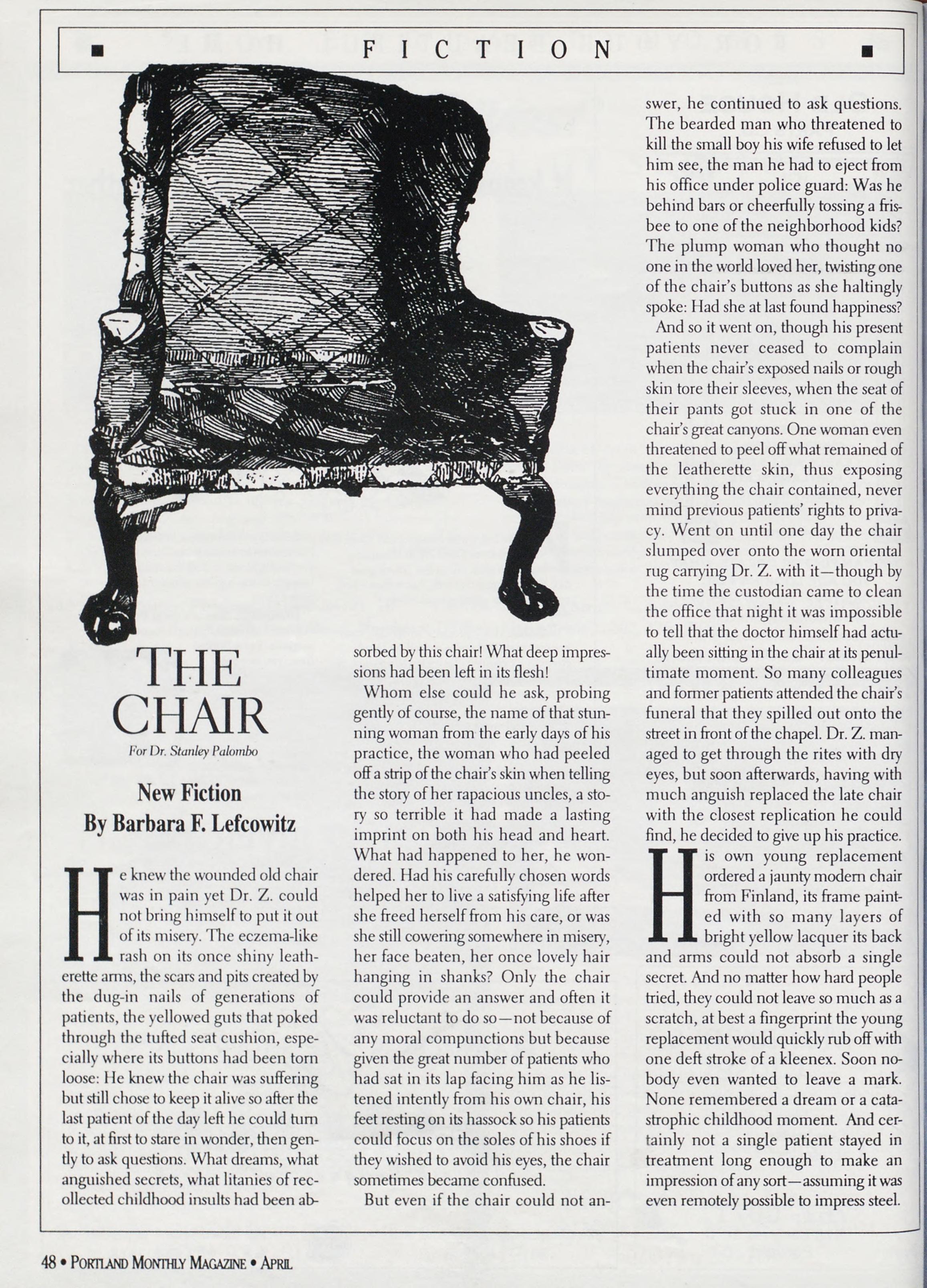 Andsoitwenton,thoughhispresent patients never ceased to complain whenthechair’sexposednailsorrough skintoretheirsleeves,whentheseatof theirpantsgotstuckinoneofthe chair’sgreatcanyons.Onewomaneven threatenedtopeeloffwhatremainedof theleatheretteskin,thusexposing everythingthechaircontained,never mindpreviouspatients’rightstopriva¬ cy.Wentonuntilonedaythechair slumpedoverontothewornoriental rugcarryingDr.Z.withit—thoughby thetimethecustodiancametoclean theofficethatnightitwasimpossible totellthatthedoctorhimselfhadactu¬ allybeensittinginthechairatitspenul¬ timate moment. So many colleagues andfonnerpatientsattendedthechair’s funeralthattheyspilledoutontothe streetinfrontofthechapel.Dr.Z.man¬ agedtogetthroughtheriteswithdry eyes,butsoonafterwards,havingwith muchanguishreplacedthelatechair withtheclosestreplicationhecould find,hedecidedtogiveuphispractice. is own young replacement orderedajauntymodemchair fromFinland,itsframepaint¬ ed with so many layers of brightyellowlacqueritsback and arms could not absorb a single secret.Andnomatterhowhardpeople tried,theycouldnotleavesomuchasa scratch,atbestafingerprinttheyoung replacementwouldquicklymboffwith onedeftstrokeofakleenex.Soonno¬ body even wanted to leave a mark. None remembered a dream or a cata¬ strophicchildhoodmoment.Andcer¬ tainlynotasinglepatientstayedin treatment long enough to make an impressionofanysort—assumingitwas evenremotelypossibletoimpresssteel.