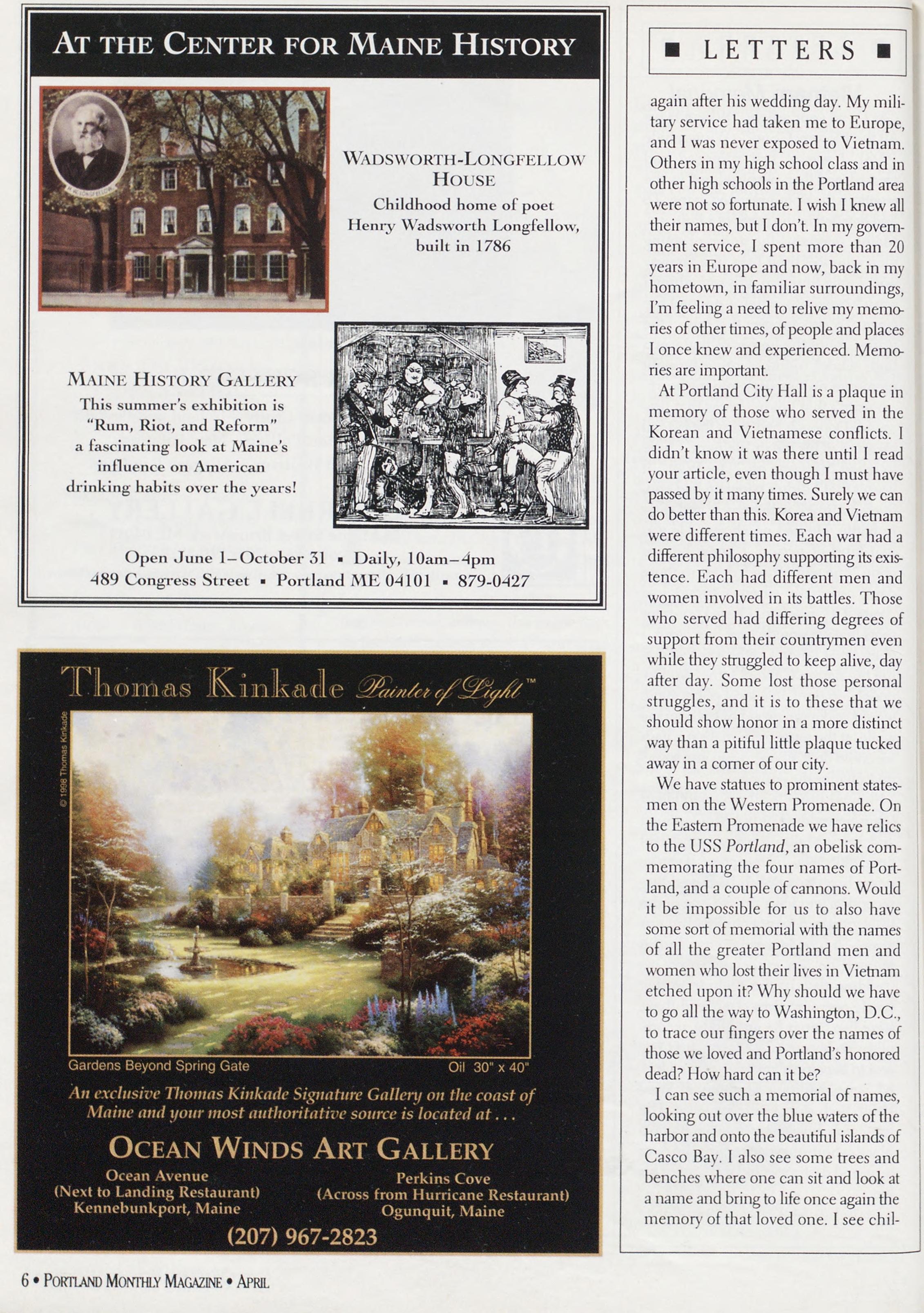 Wehavestatuestoprominentstates¬ men on the Western Promenade. On theEasternPromenadewehaverelics totheUSS Portland, anobeliskcom¬ memoratingthefournamesofPort¬ land,andacoupleofcannons.Would itbeimpossibleforustoalsohave somesortofmemorialwiththenames ofallthegreaterPortlandmenand womenwholosttheirlivesinVietnam etcheduponit?Whyshouldwehave togoallthewaytoWashington,D.C., totraceourfingersoverthenamesof thosewelovedandPortland’shonored dead?Howhardcanitbe?