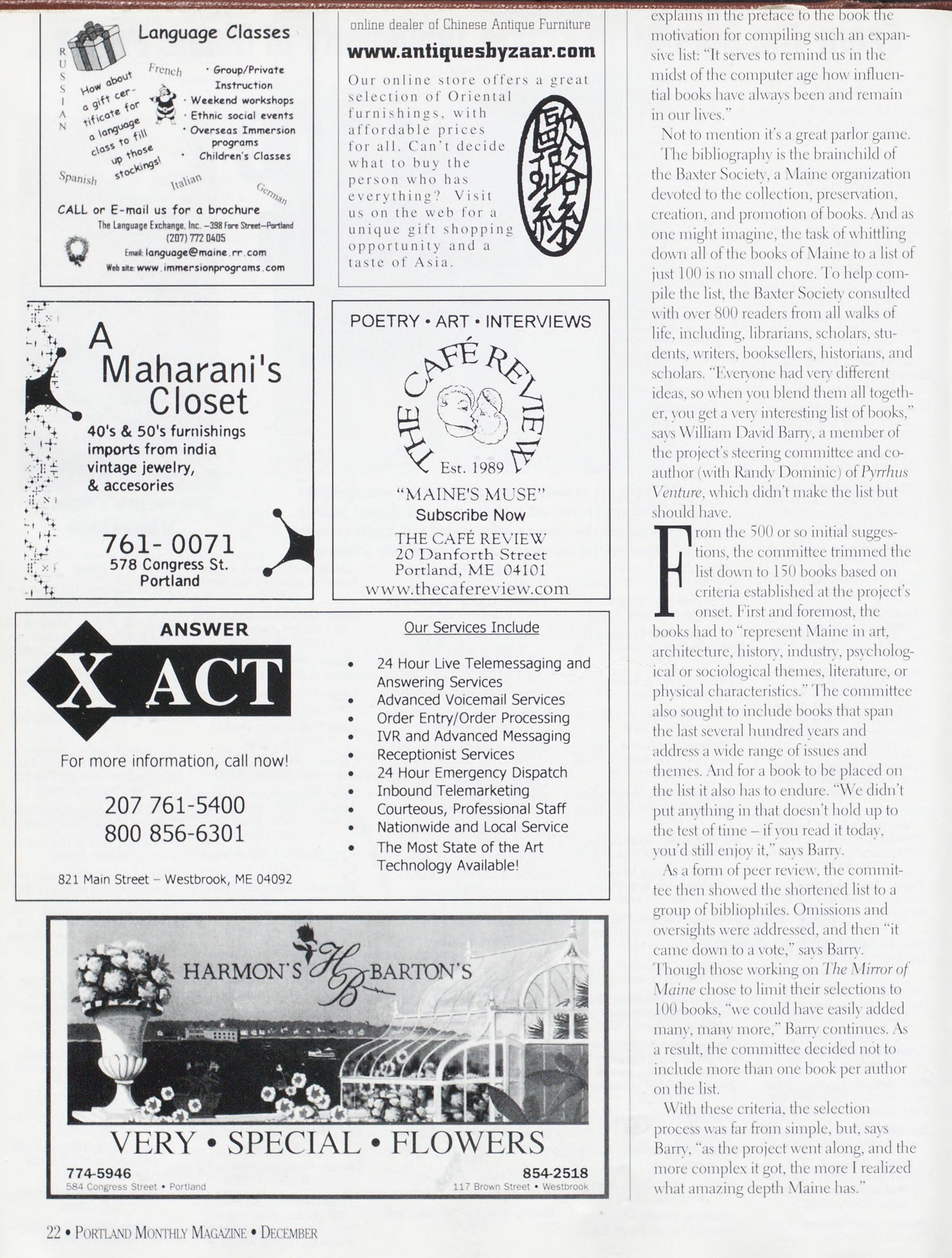 CenterforMaineHistorv.4S9(Congress Street.Portland.Theexhibit"TheMirrorof Maine:I-bur(CenturiesofGreatBooks”consists olanamazingassemblageofrarebooksand artifactsrelativetotheBaxterBookSociety’slist of100greatbooksthatreflectthehistorv.life, andcultureofthepeopleofMaine.””4-1S22. Davidson&Daughters,14SIhighStreet. Portland.WorksofBarbaraSullivan,through DecemberM.>20")"S0-0’66.