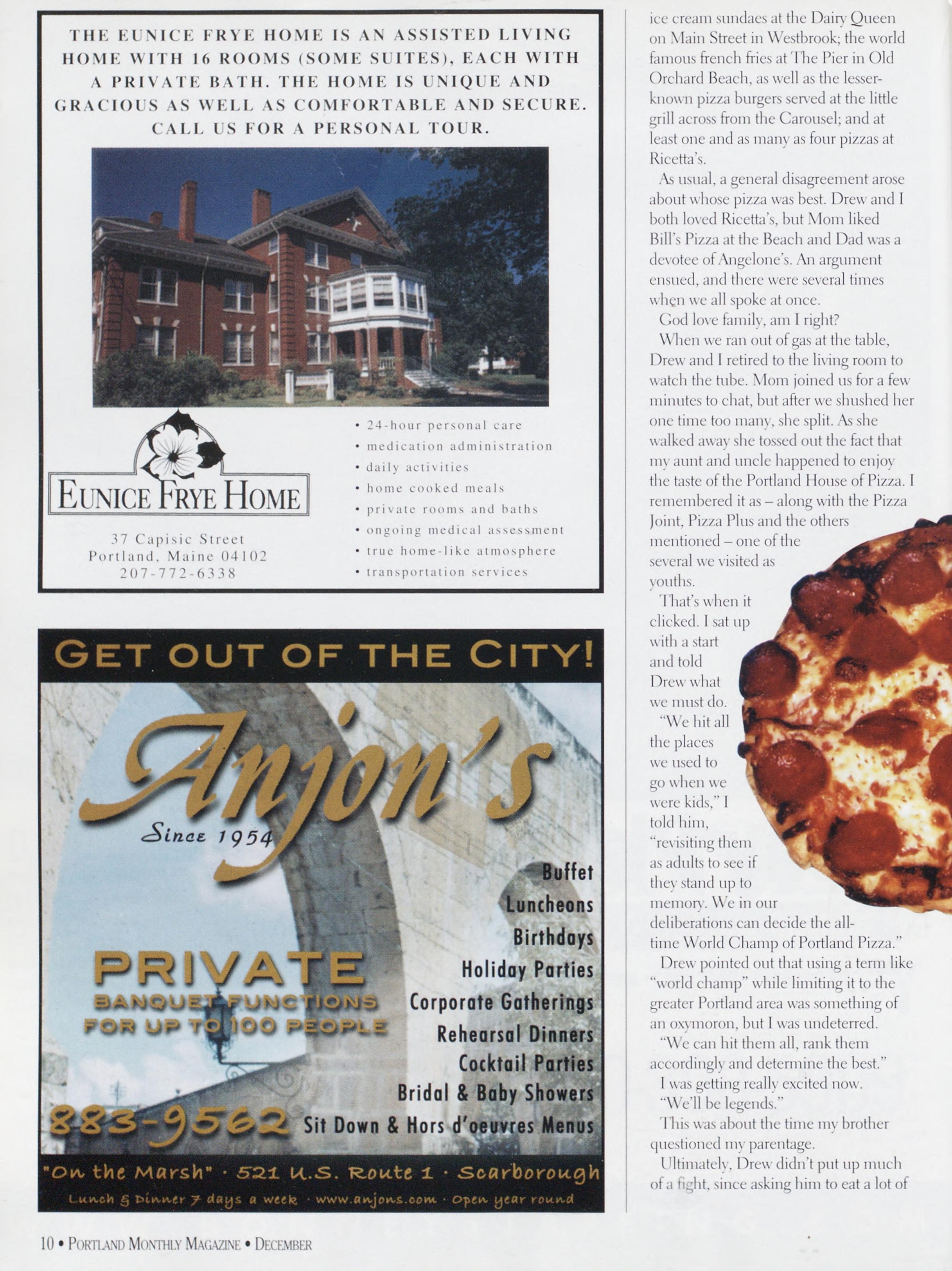 "W'ehitall theplaces weusedto go w hen we werekids,”I toldhim, “revisitingthem asadultstoseeif thevstandupto memorv. W'e in our deliberationscandecidethealltimeW'orldChampofPortlandPizza.” Drewpointedoutthatusingatermlike "worldchamp"whilelimitingittothe greaterPortlandareawassomethingof anoxvmoron,butIwasundeterred.