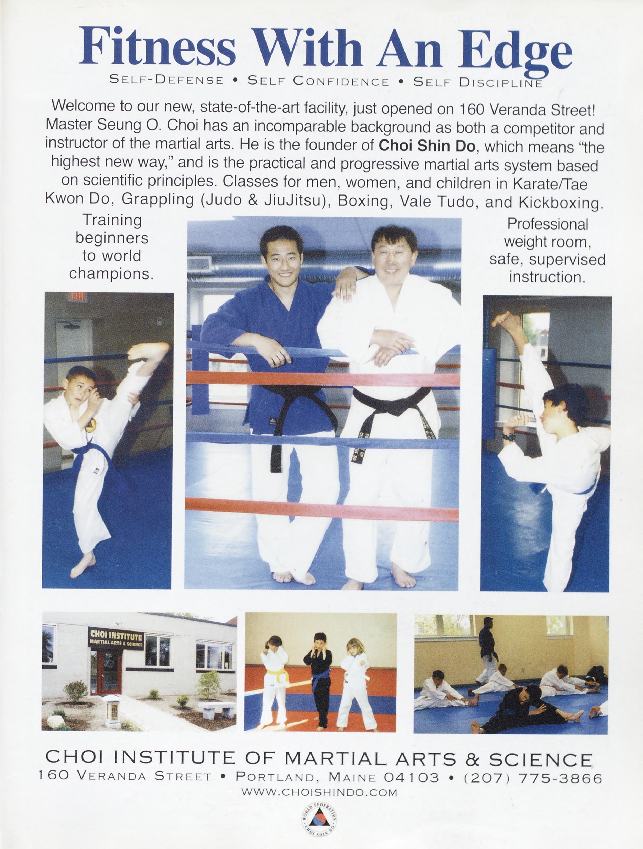FitnessWithAnEdge Self-Defense • Self Confidence • Self Discipline Welcometoournew,state-of-the-artfacility,justopenedon160VerandaStreet! MasterSeungO.Choihasanincomparablebackgroundasbothacompetitorand instructorofthemartialarts.Heisthefounderof ChoiShinDo, whichmeans“the highestnewway,”andisthepracticalandprogressivemartialartssystembased onscientificprinciples.Classesformen,women,andchildreninKarateTae Kwon Do, Grappling (Judo & JiuJitsu), Boxing, Vale Tudo, and Kickboxing. Professional weightroom, safe,supervised instruction.
