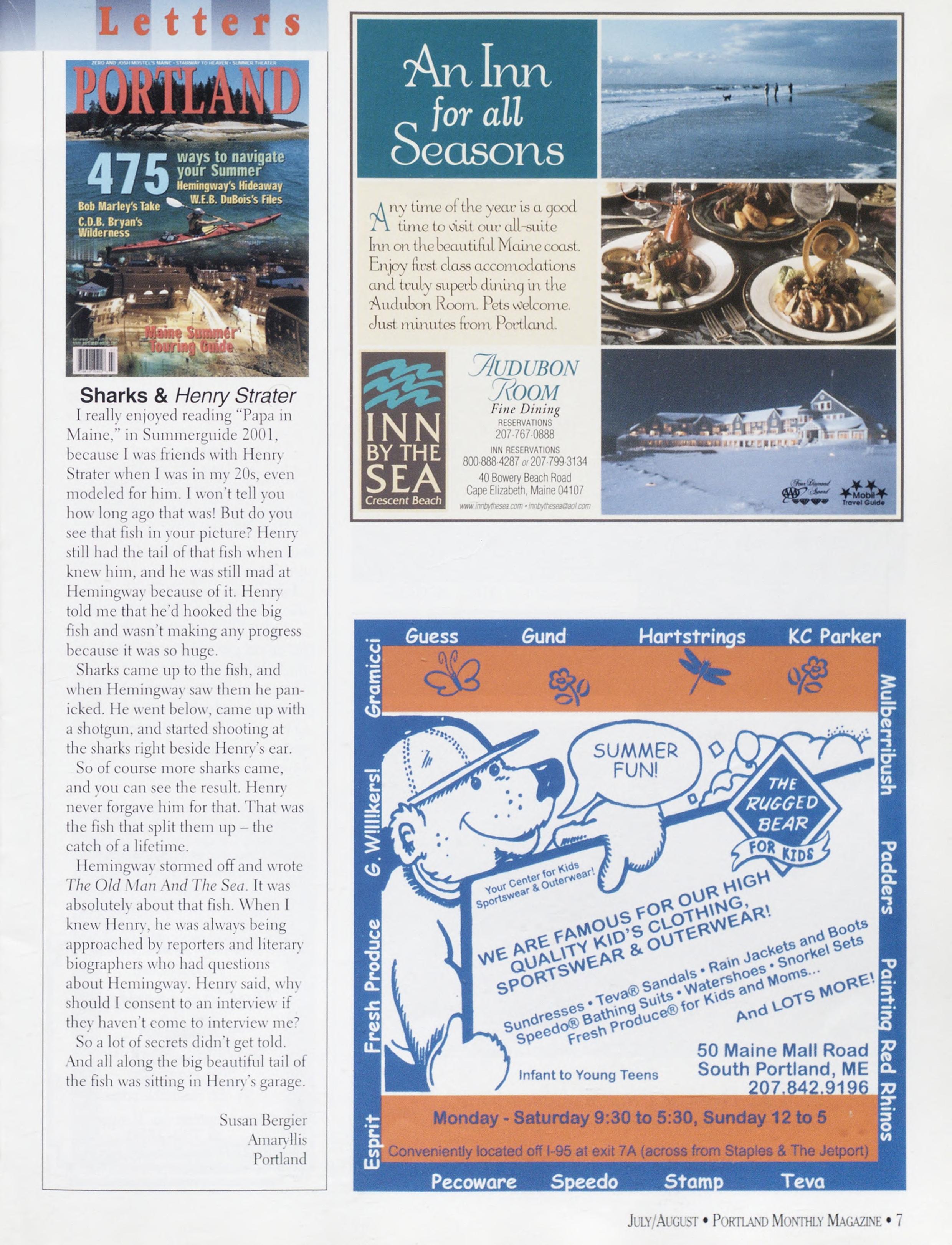 Sharks&HenryStrater Ireallvcnjovedreading“Papain Maine,"inSummerguidc2001, becauseIwasfriendswitliHenrv Straterwhen1wasinmv20s,even modeledforhim.Iwon’ttellvon howlongagothatwas!Butdovon secthatfishinvourpicture?Henrv stillhadthetailofthatfishwhenI knewhim.andhewasstillmadat 1lemingwavbecauseofit.Henrv toldmethathe’dhookedthebig fishandwasn'tmakingamprogress becauseitwassohuge.