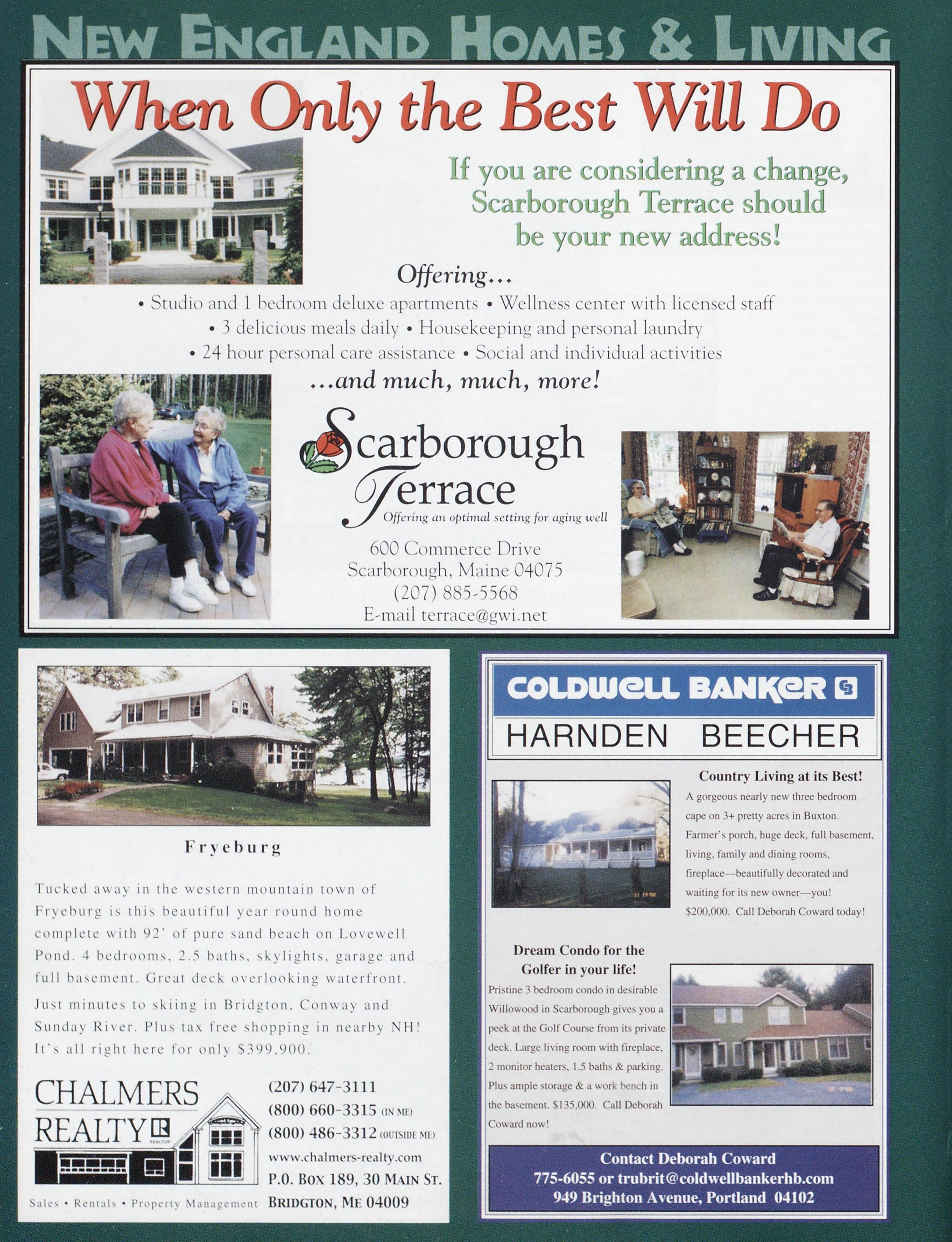 CountryLivingatitsBest! Agorgeousnearlynewthreebedroom capeon3+prettyacresinBuxton. Farmer’sporch,hugedeck,fullbasement, living,familyanddiningrooms, fireplace—beautifullydecoratedand waitingforitsnewowner—you! $200,000.CallDeborahCowardtoday! www.chalniers-reahy.com P.O. Box 189, 30 MainSt. Bridgton, Me 04009