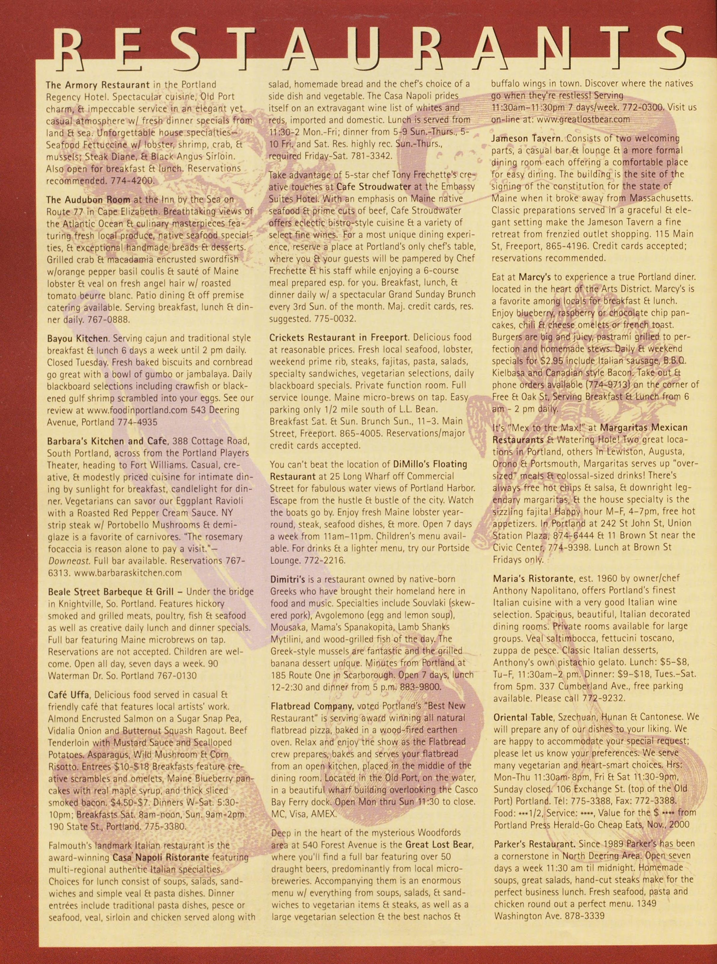 NewsstandCoverDate:1ebruan/March2002.publishedin Ecbruan2002.Vol.1”.No.1.copsright2002. PoRTLWI) Magazine ismailedalthird-classmailratesinPortland. ME 04101 (ISSN: 107V1S57). Opinions expressed in articlesarcthoseofauthorsanddonotrepresenteditorial positionsofPORTLANDMugdrineLetterstotheeditorarc welcomeandwillbetreatedasunconditionallyassignedfor publication and copyright purposes and as subject to PORTLAND Muguzine’s unrestricted right to edit and commentedilorialh.Responsibleonlytorth.itportionof anvadvertisementwhichisprintedincorrectly.Advertisers areresponsibleforcopsrightsofmaterialstheysubmit. Nothinginthisissuemavbereprintedinwholeorinpart without written permission Irom the publishers. Submissions welcome, but we take no responsibility for unsolicitedmaterials.