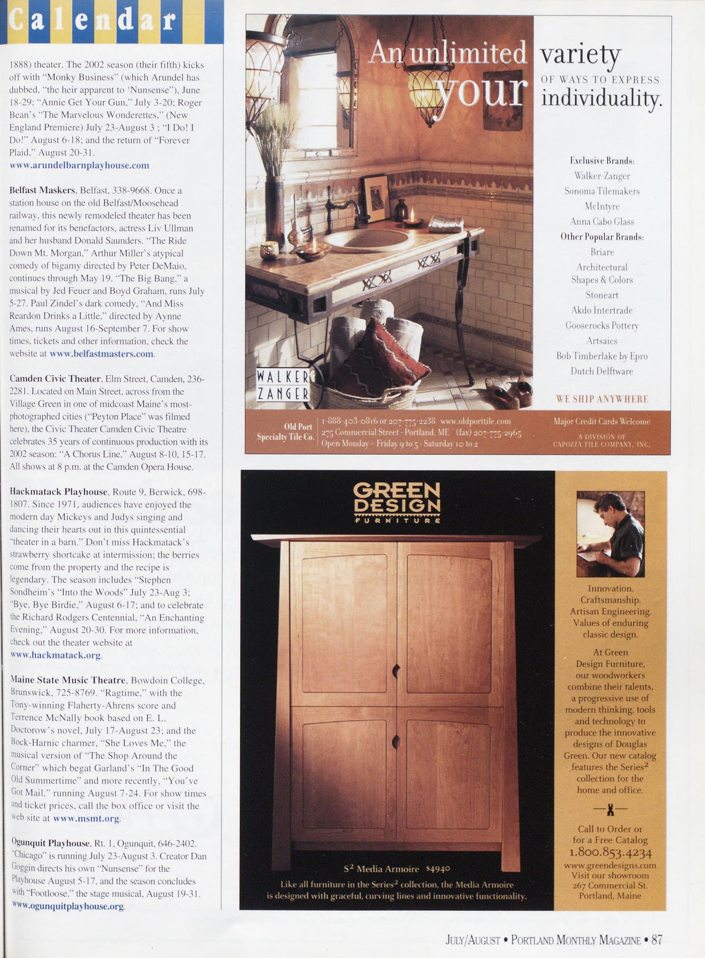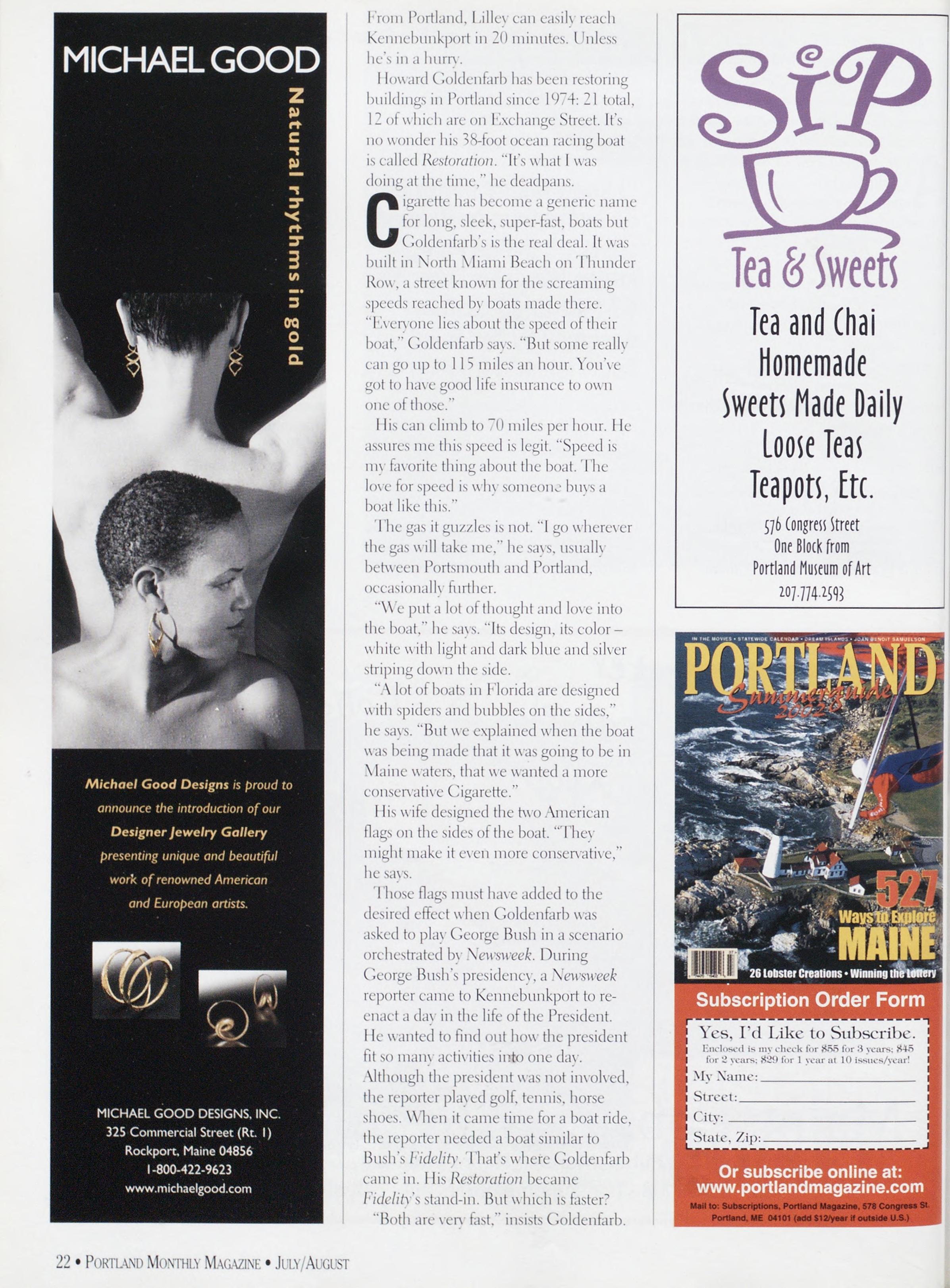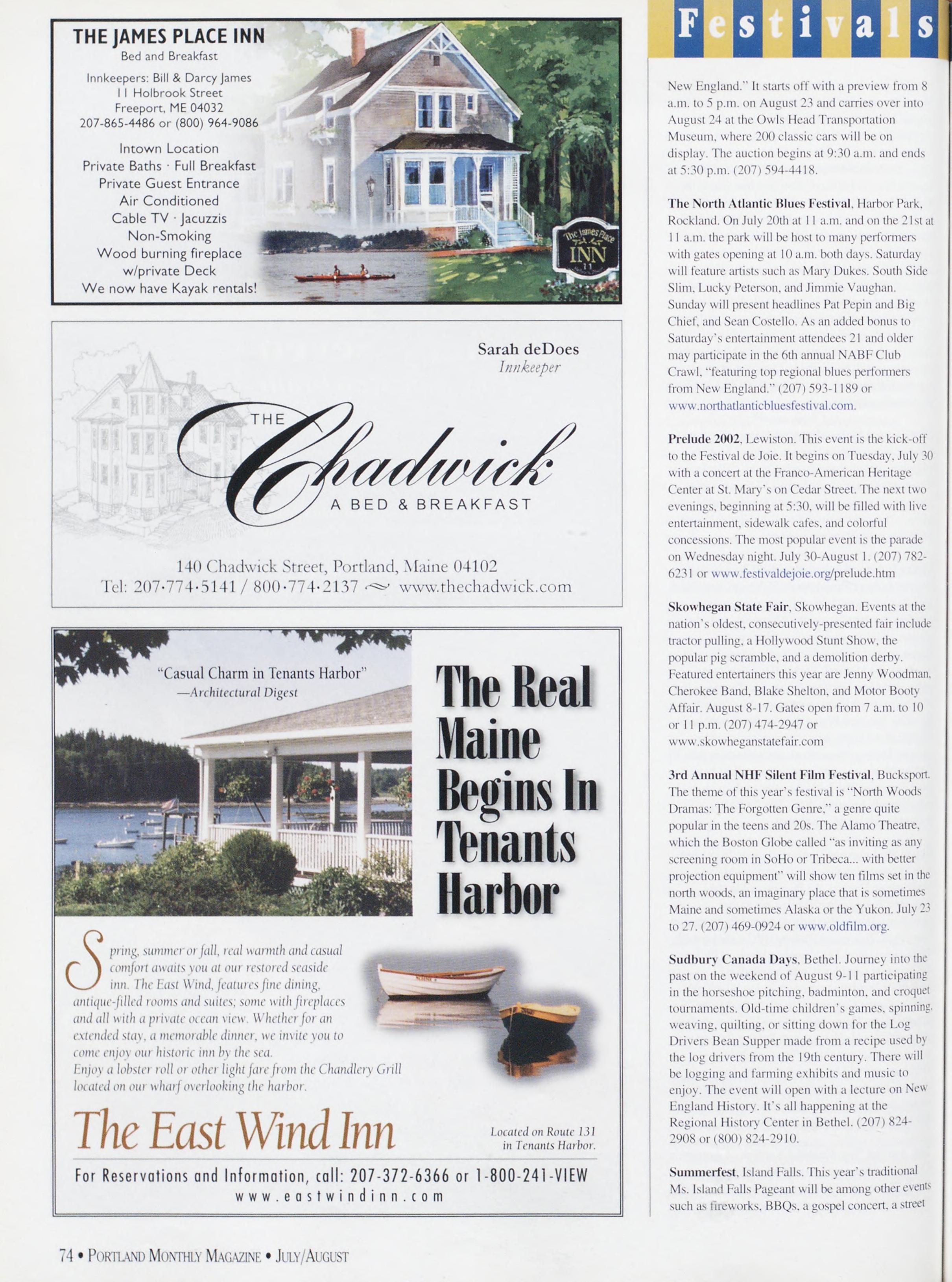 /MERNS: Alex Wwsox. Rebecca Dckgtx. Gowx>\l.wi Pdku.xxd MagazineispublishedbySargentPublishing.Inc. >“8 Congress Street, Portland. Mb. 04101. All corre¬ spondence should be addressed to ”8 Congress Street. Portland.ME04101.AdvertisingOffice:5*8CongressStreet. Portland.ME04101(20“>“”-4339.Rejx-.itinternetrights areunderstoodIobepurchasedwithallstoriesandartwork Billingquestions:Ifsouhavequestionsregardingadvertising invoicingandpavtnenls.callJohnGerdesat“”-4339. Newsstand(’overDate:)uls/\ugust2002.publishedinJuls 2002.Vol.1“.No.5.copvright2(X>2. Portland Magazineis mailedatthird-classmailralesinPortland.ME0410JISSN: 10“3-183“i.Oj)inionsexpressedinarticlesarcthoseofauthors anddonotrepresenteditorialjiosilionsof Porttand Magazine Letterstotheeditorarcwelcomeandwillbetreatedas unconditionallv assigned for publication and copvright puqxiscsandassubjecttoPokiiaxd Magazine'sunrestricted righttoeditandcommenteditorially.Rcqxmsiblconkforthat portionotanyadvertisementwhichisprintedincorrccth. Advertisersarcresponsibleforcopyrightsofmaterials(lies submit.Nothinginthisissuemavlxreprintedmwholeorin part without written permission from the publishcrs. Submissions welcome, but we take no rcspunsibiliIs for unsolicitedmaterials.
