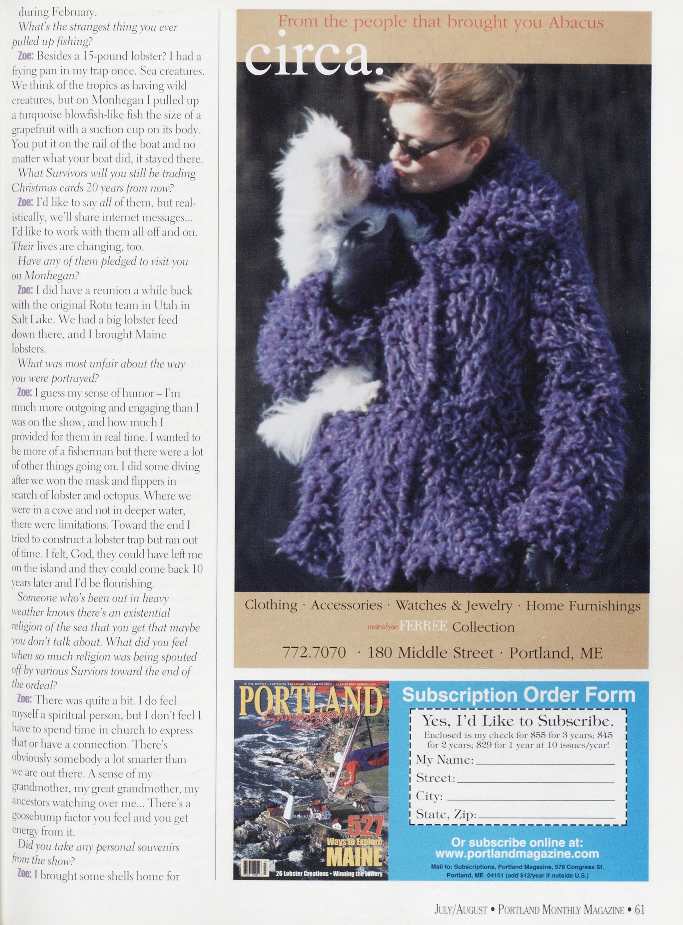 Pleasesendyouraddress andacheckfor$29(1yr.), $45(2yr.),or$55(3yrs.)to PortlandMagazine 578 Congress St * Portland, ME 04101 Visitusat www.portlandmagazlne.com