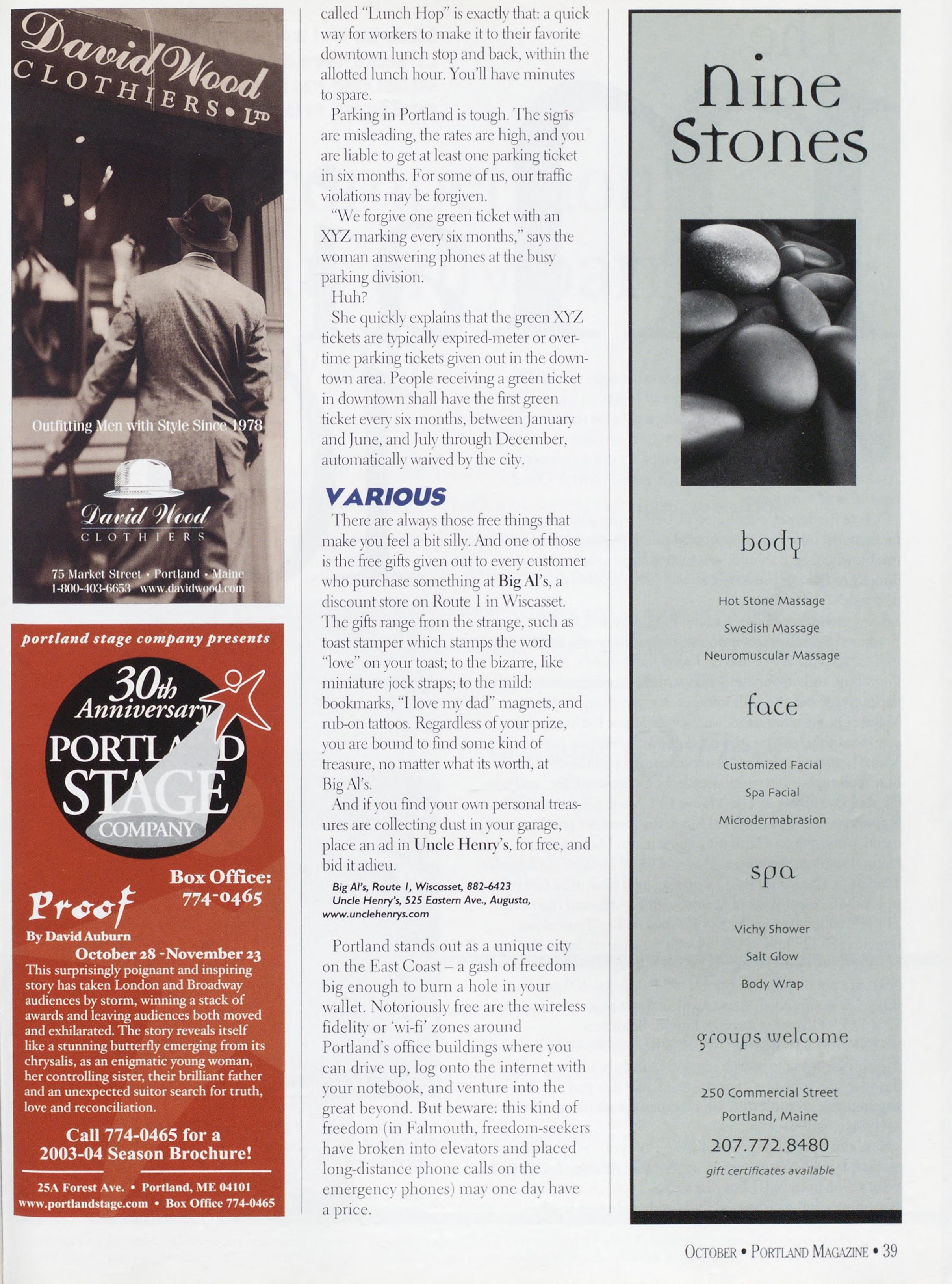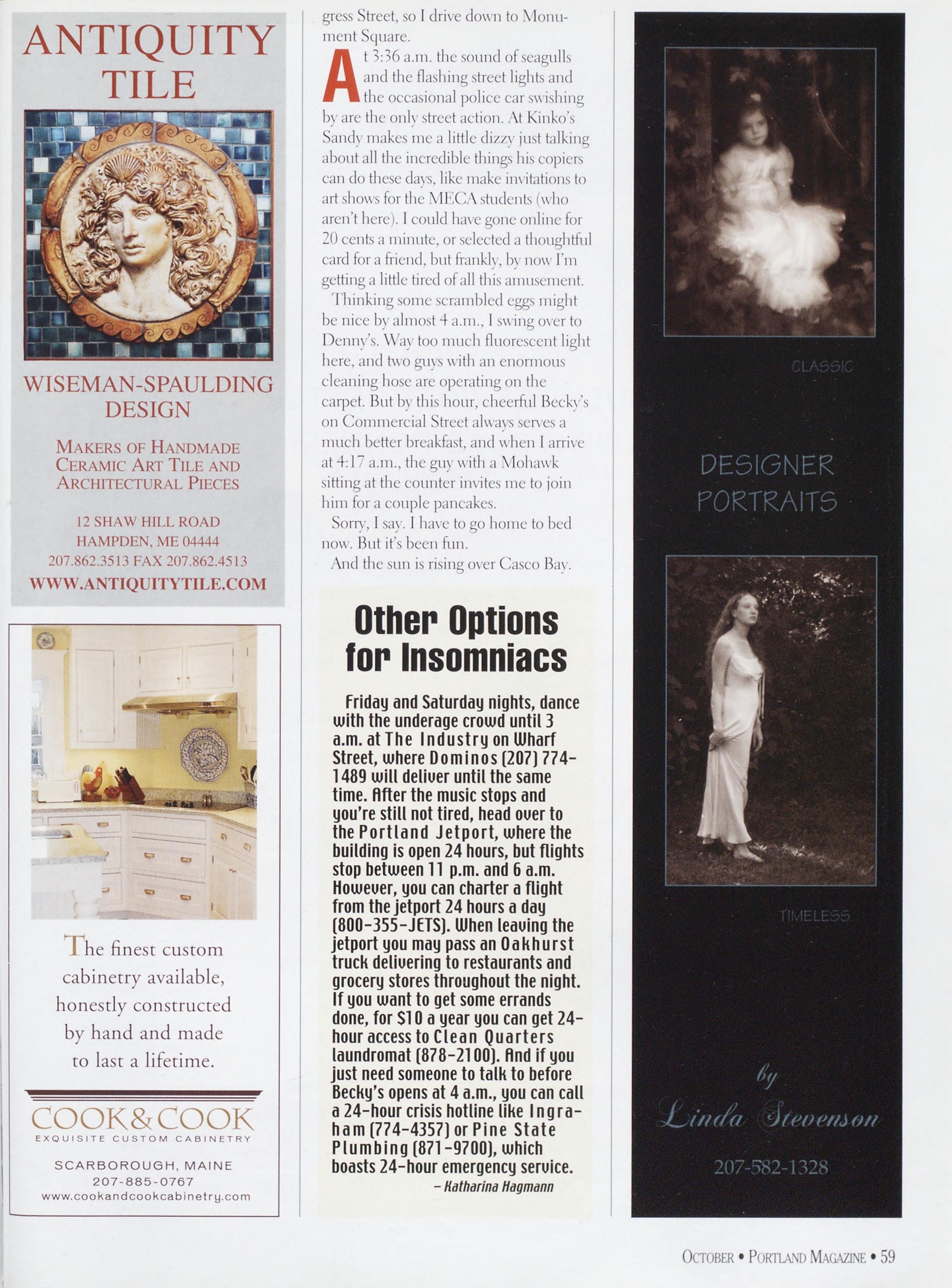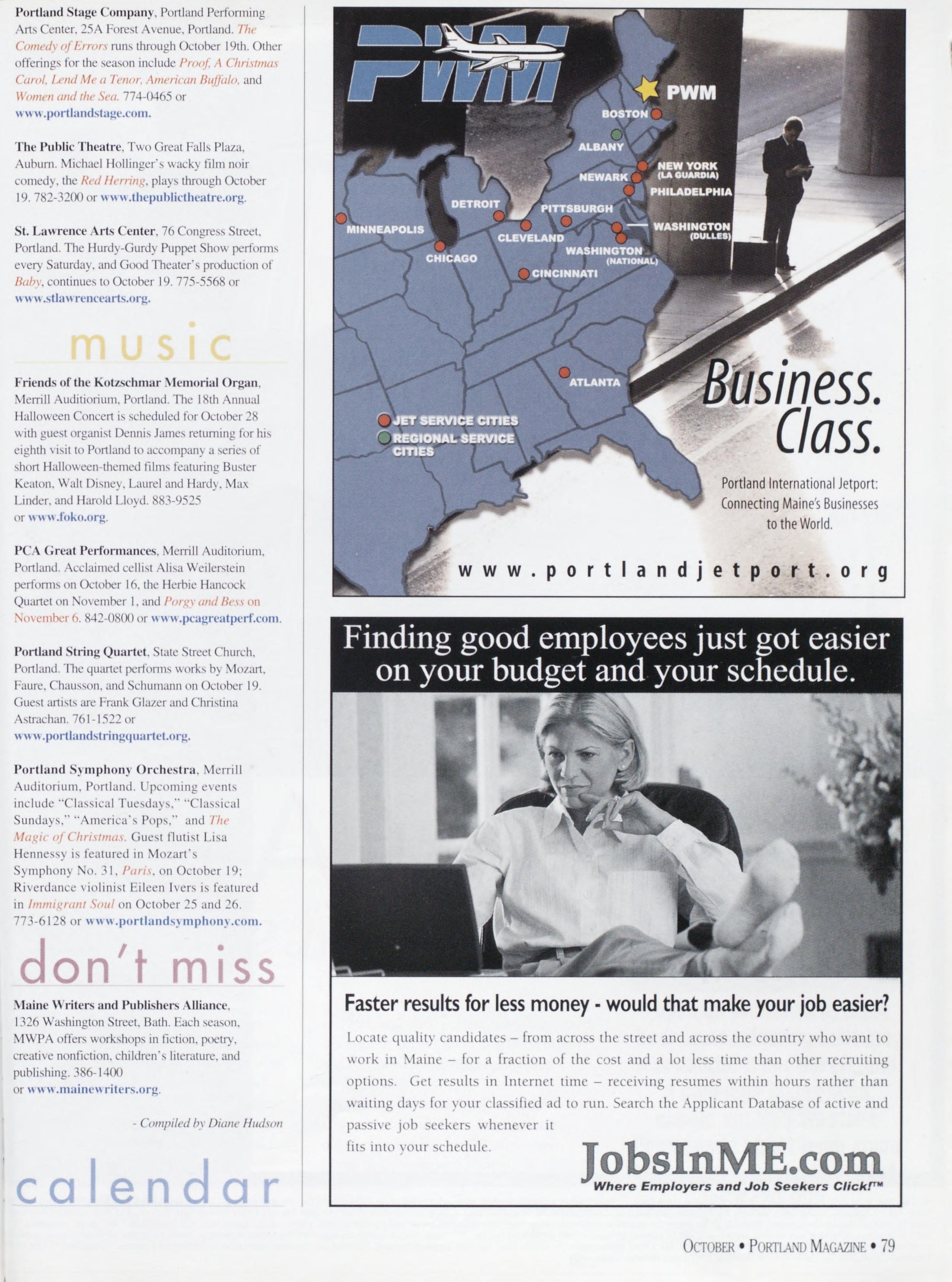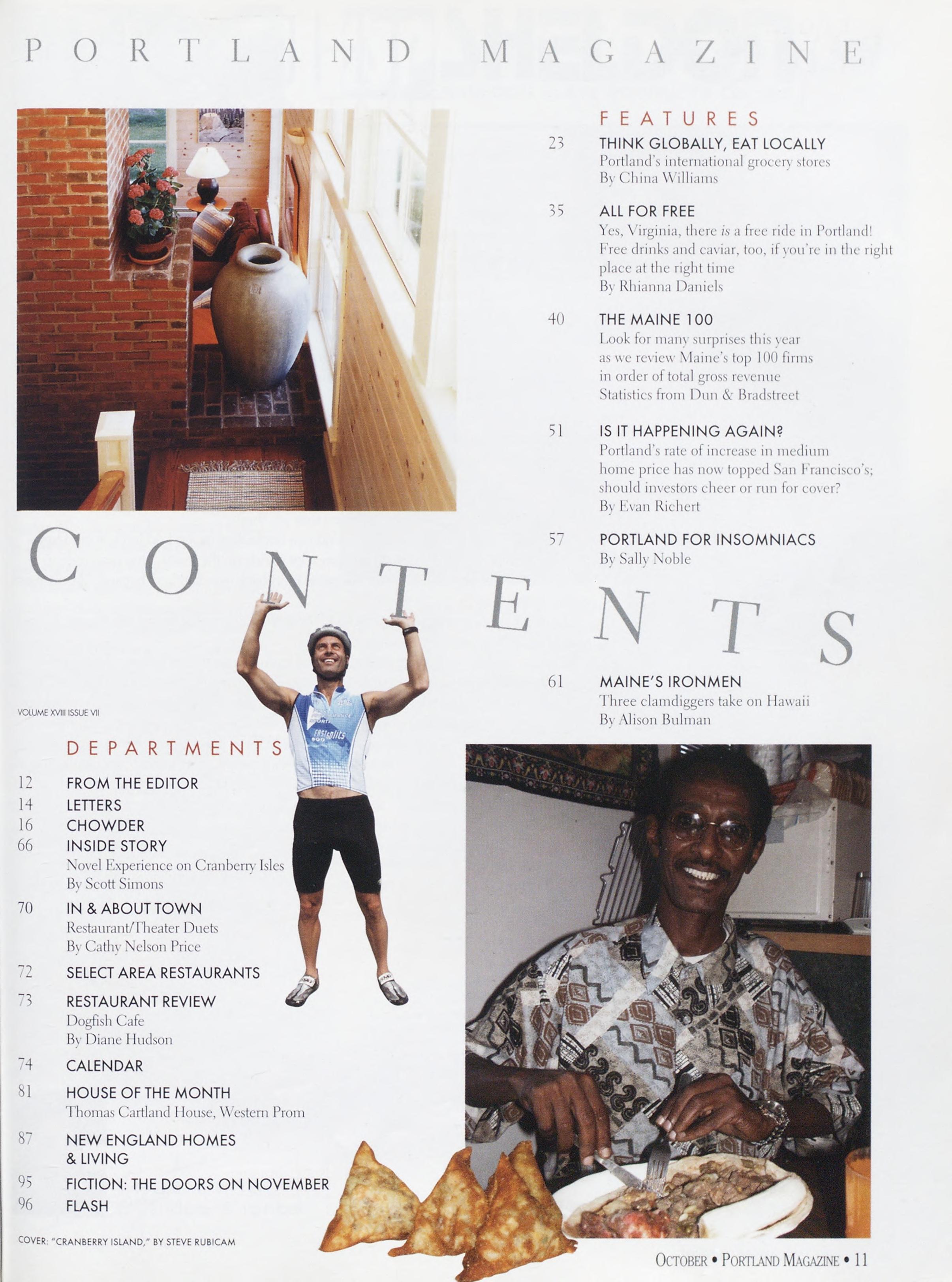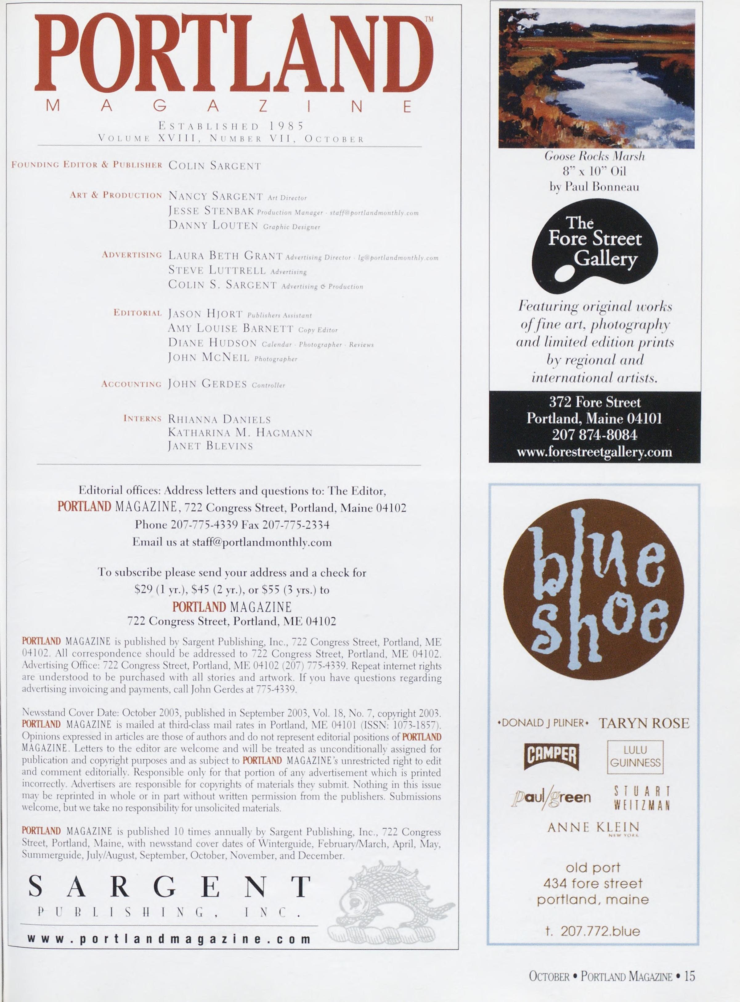 NewsstandCoverDate:October2003.publishedinSeptember2003,Vol.18,No.7,copvright2003. PORTLAND MAGAZINE ismailedatthird-classmailratesinPortland,ME04101(ISSN:1073-1857). Opinionsexpressedinarticlesarethoseofauthorsanddonotrepresenteditorialpositionsof PORTLAND MAGAZINE. Letterstotheeditorarewelcomeandwillbetreatedasunconditionallyassignedfor publicationandcopyrightpurposesandassubjectto PORTLAND MAGAZINE’Sunrestrictedrighttoedit andcommenteditorially.Responsibleonlyforthatportionofanvadvertisementwhichisprinted incorrectly.Advertisersarcresponsibleforcopvrightsofmaterialsthevsubmit.Nothinginthisissue maybereprintedinwholeorinpartwithoutwrittenpermissionfromthepublishers.Submissions welcome,butwetakenoresponsibilityforunsolicitedmaterials.