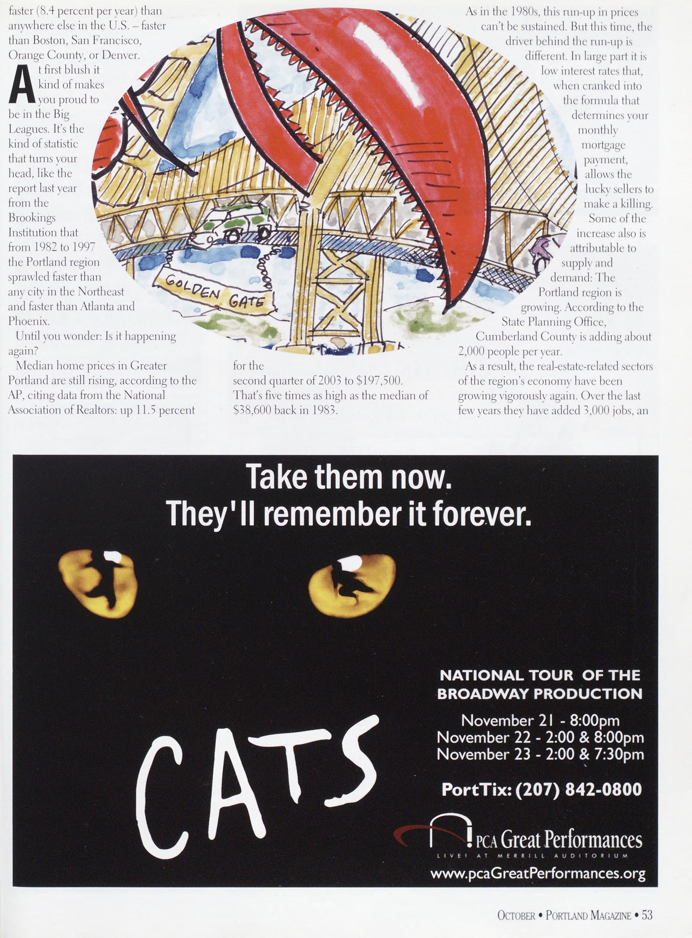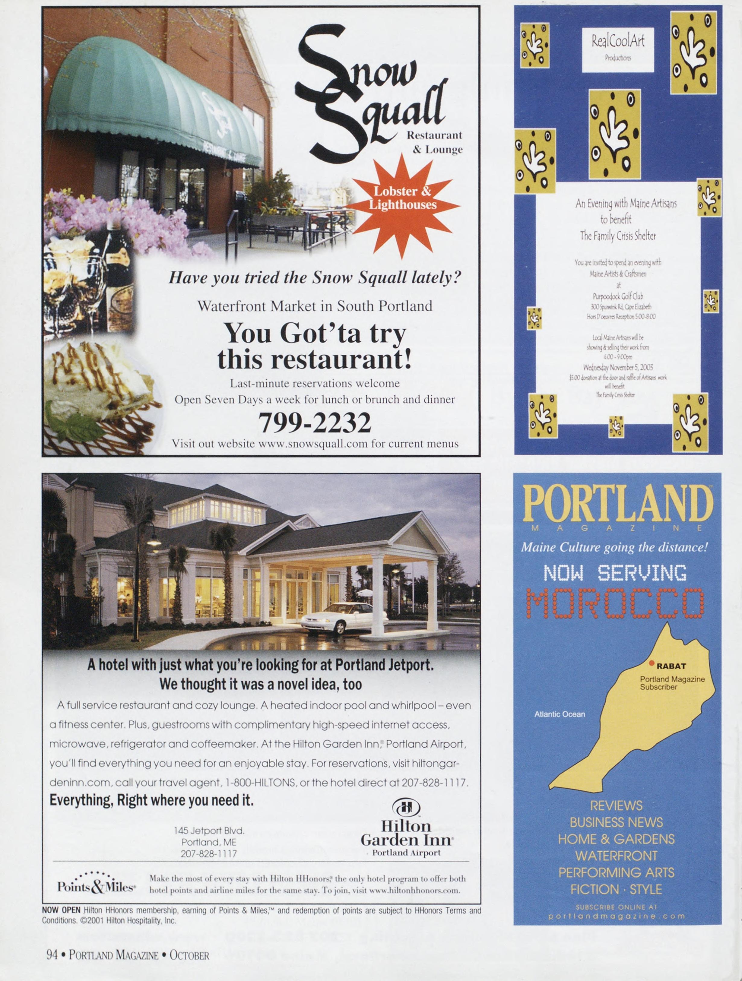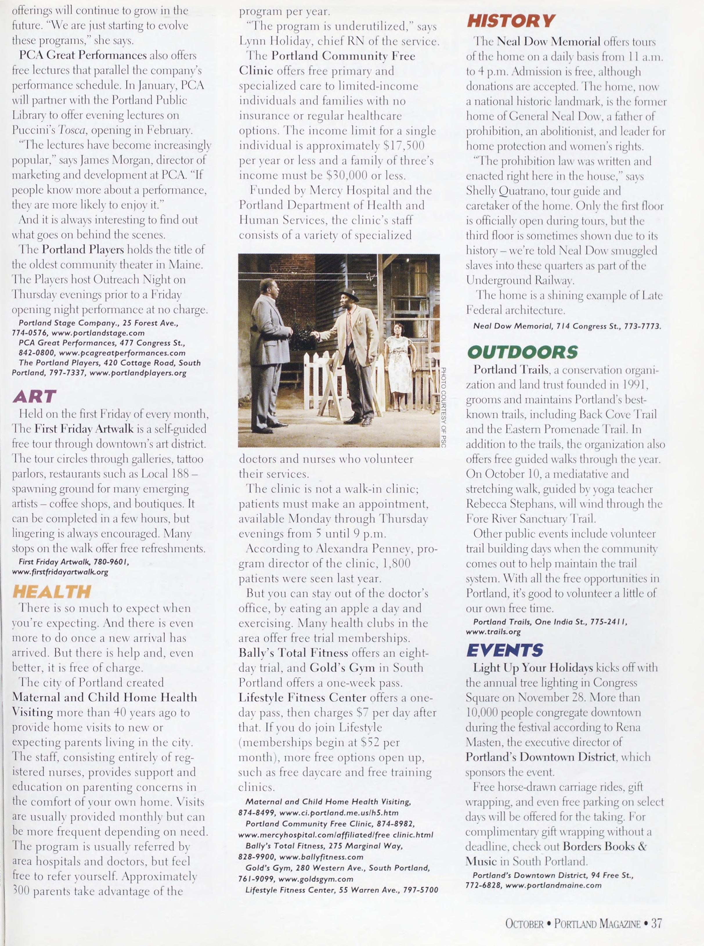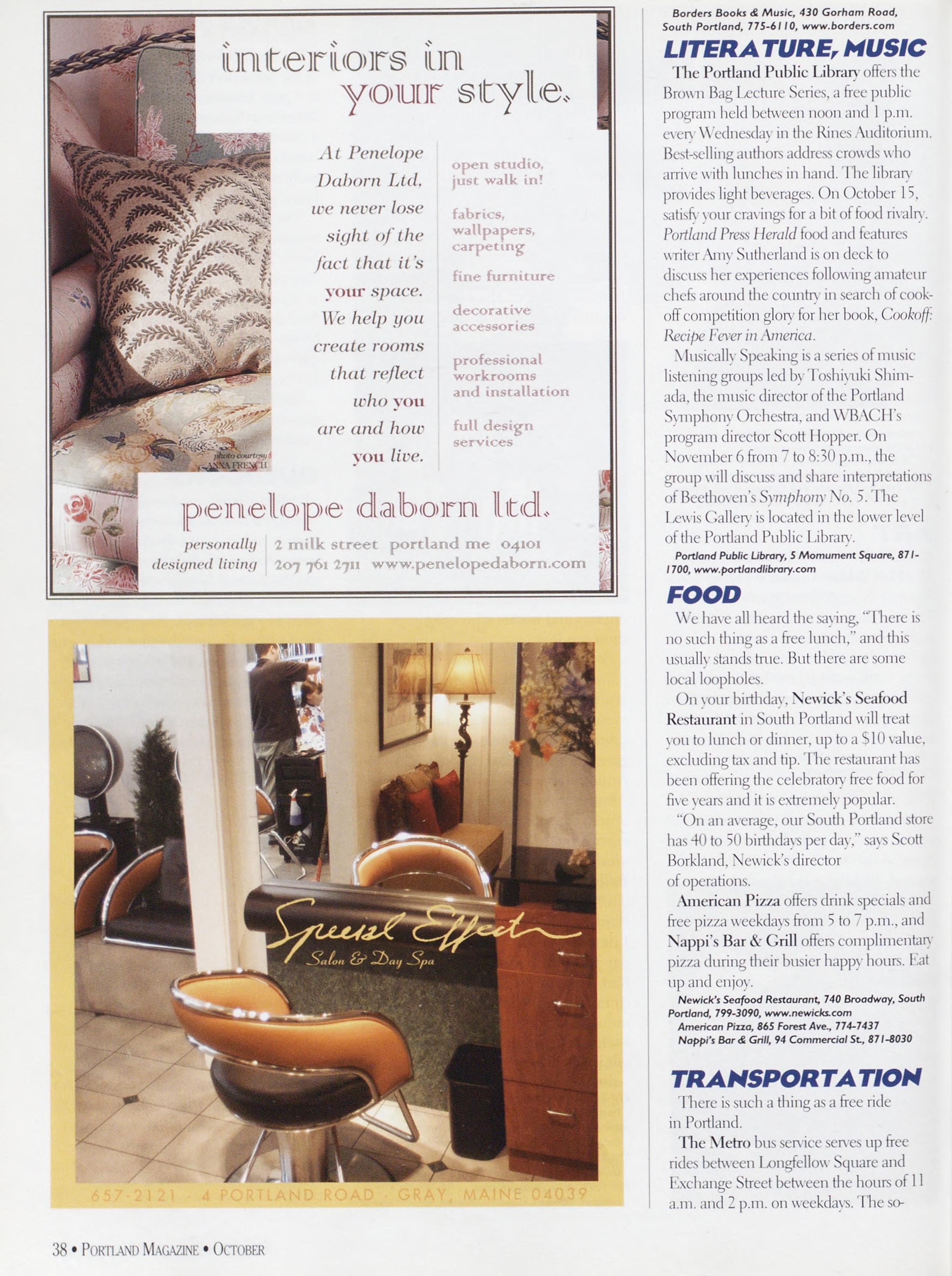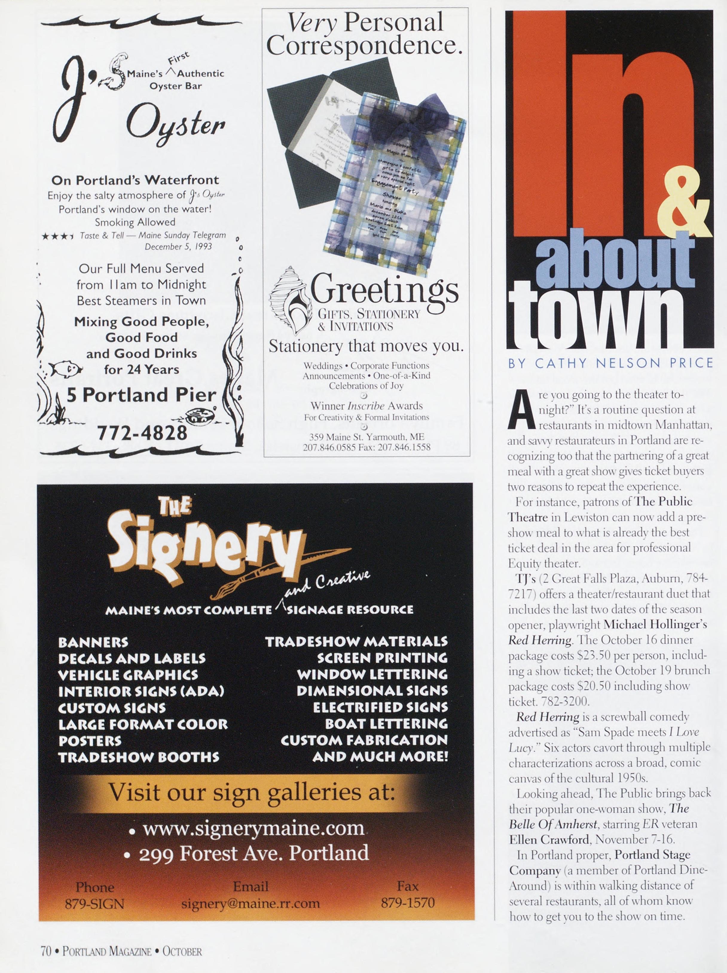NewsstandCoverDate:October2003.publishedinSeptember2003,Vol.18,No.7,copvright2003. PORTLAND MAGAZINE ismailedatthird-classmailratesinPortland,ME04101(ISSN:1073-1857). Opinionsexpressedinarticlesarethoseofauthorsanddonotrepresenteditorialpositionsof PORTLAND MAGAZINE. Letterstotheeditorarewelcomeandwillbetreatedasunconditionallyassignedfor publicationandcopyrightpurposesandassubjectto PORTLAND MAGAZINE’Sunrestrictedrighttoedit andcommenteditorially.Responsibleonlyforthatportionofanvadvertisementwhichisprinted incorrectly.Advertisersarcresponsibleforcopvrightsofmaterialsthevsubmit.Nothinginthisissue maybereprintedinwholeorinpartwithoutwrittenpermissionfromthepublishers.Submissions welcome,butwetakenoresponsibilityforunsolicitedmaterials.