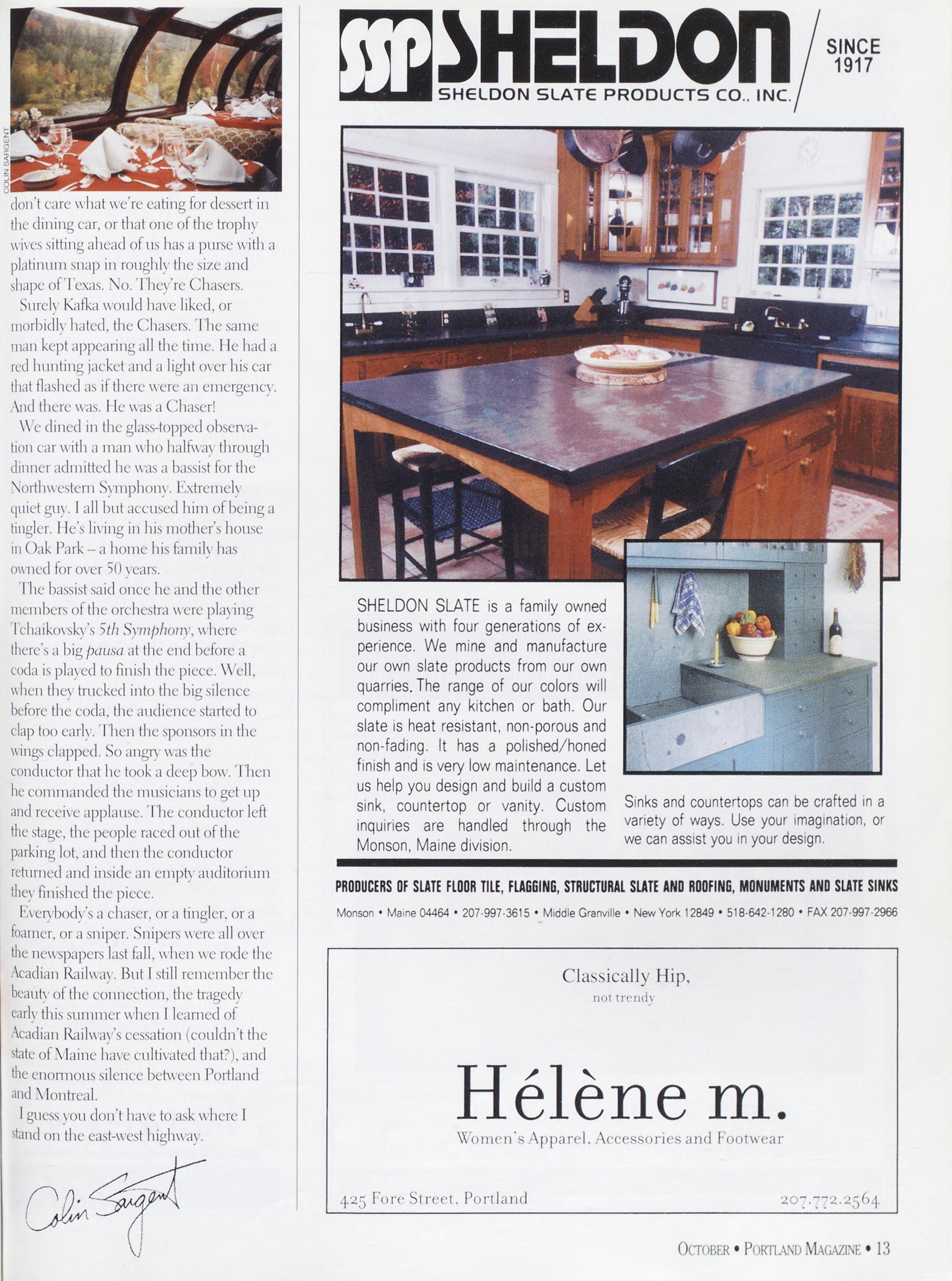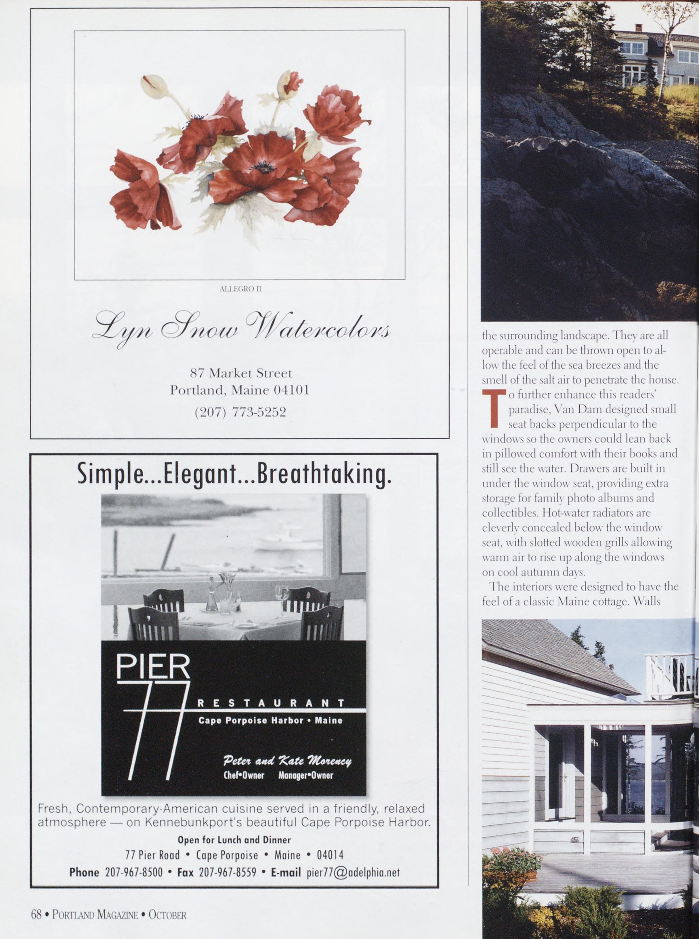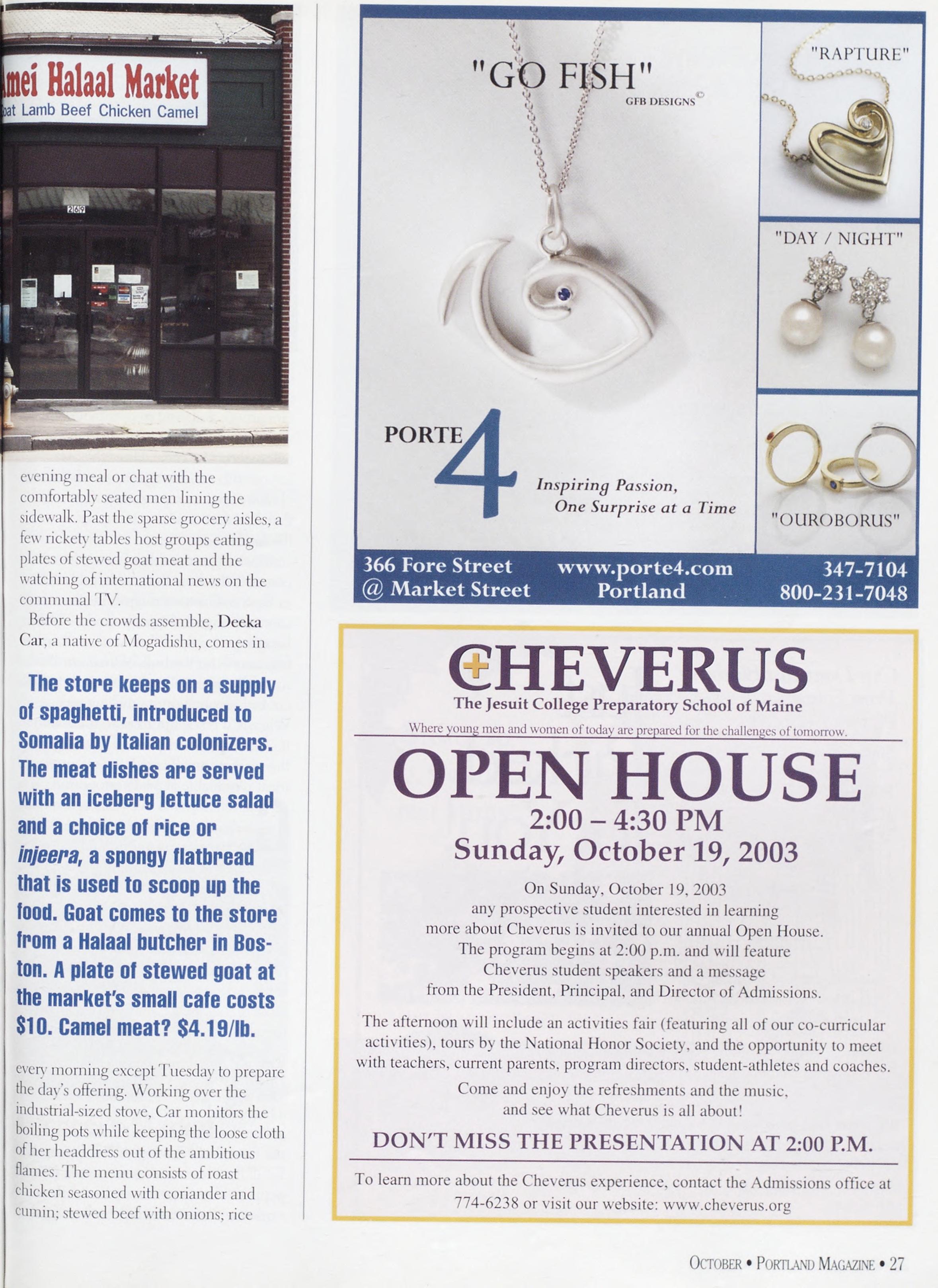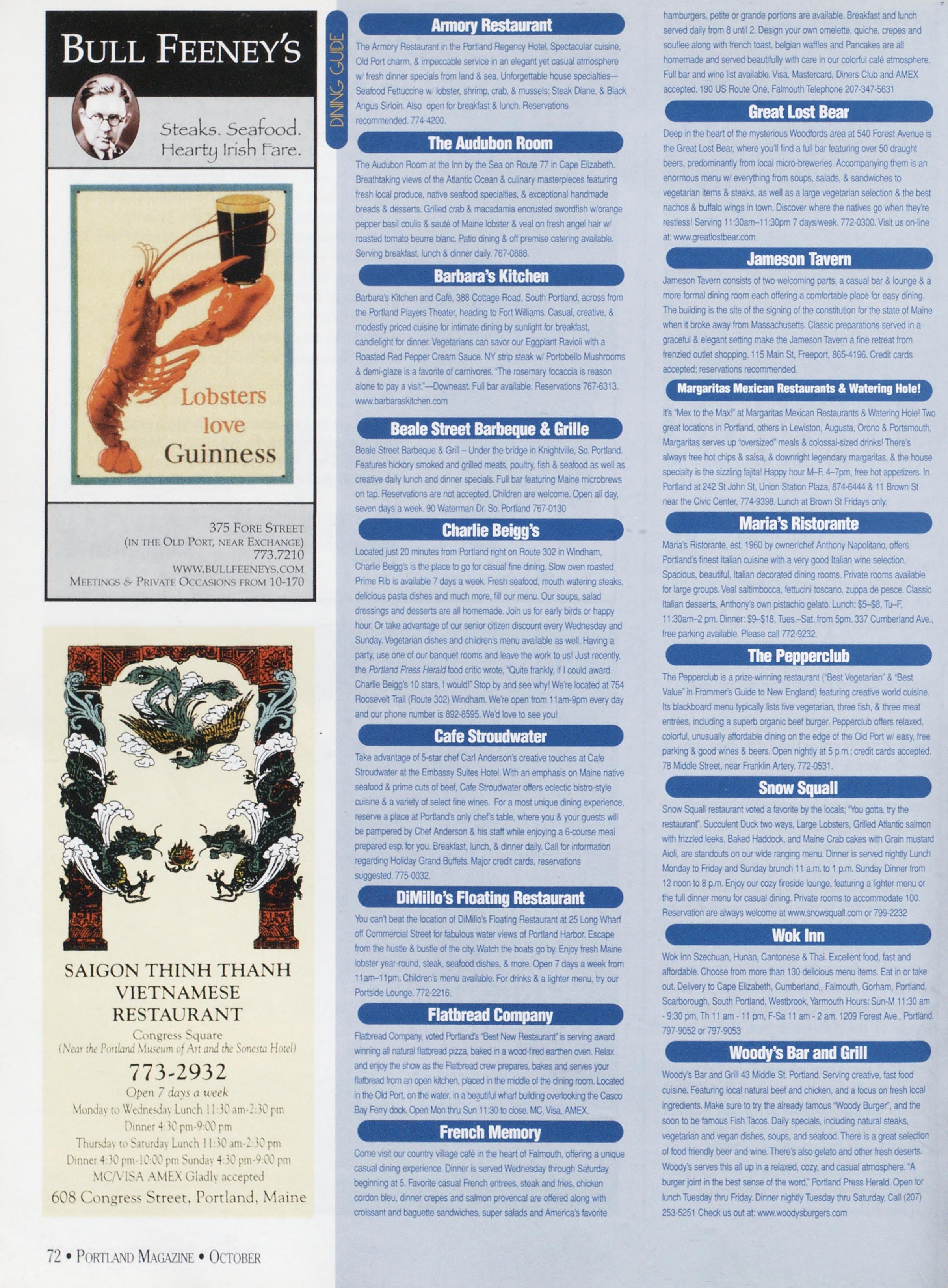 NewsstandCoverDate:October2003.publishedinSeptember2003,Vol.18,No.7,copvright2003. PORTLAND MAGAZINE ismailedatthird-classmailratesinPortland,ME04101(ISSN:1073-1857). Opinionsexpressedinarticlesarethoseofauthorsanddonotrepresenteditorialpositionsof PORTLAND MAGAZINE. Letterstotheeditorarewelcomeandwillbetreatedasunconditionallyassignedfor publicationandcopyrightpurposesandassubjectto PORTLAND MAGAZINE’Sunrestrictedrighttoedit andcommenteditorially.Responsibleonlyforthatportionofanvadvertisementwhichisprinted incorrectly.Advertisersarcresponsibleforcopvrightsofmaterialsthevsubmit.Nothinginthisissue maybereprintedinwholeorinpartwithoutwrittenpermissionfromthepublishers.Submissions welcome,butwetakenoresponsibilityforunsolicitedmaterials.