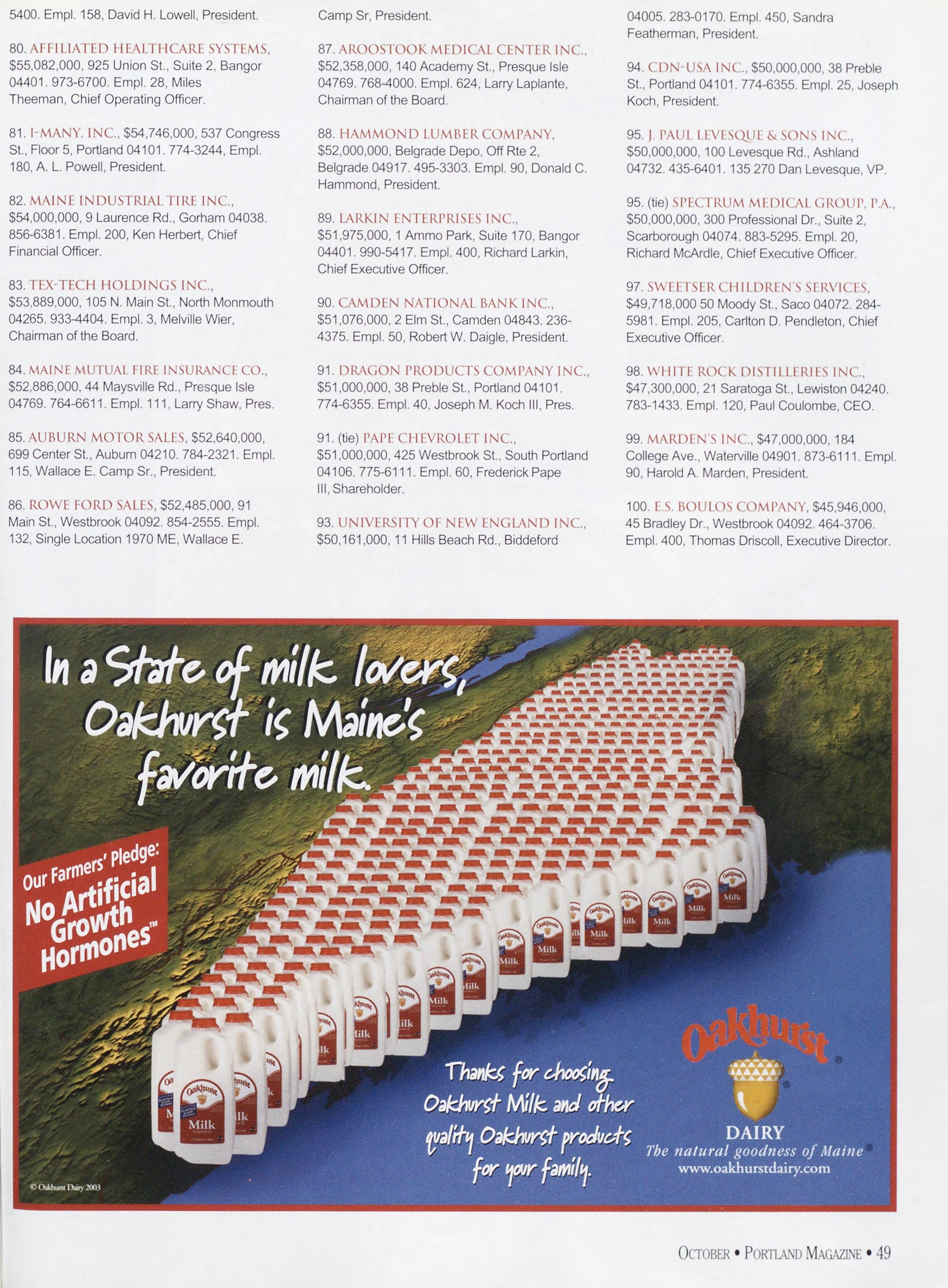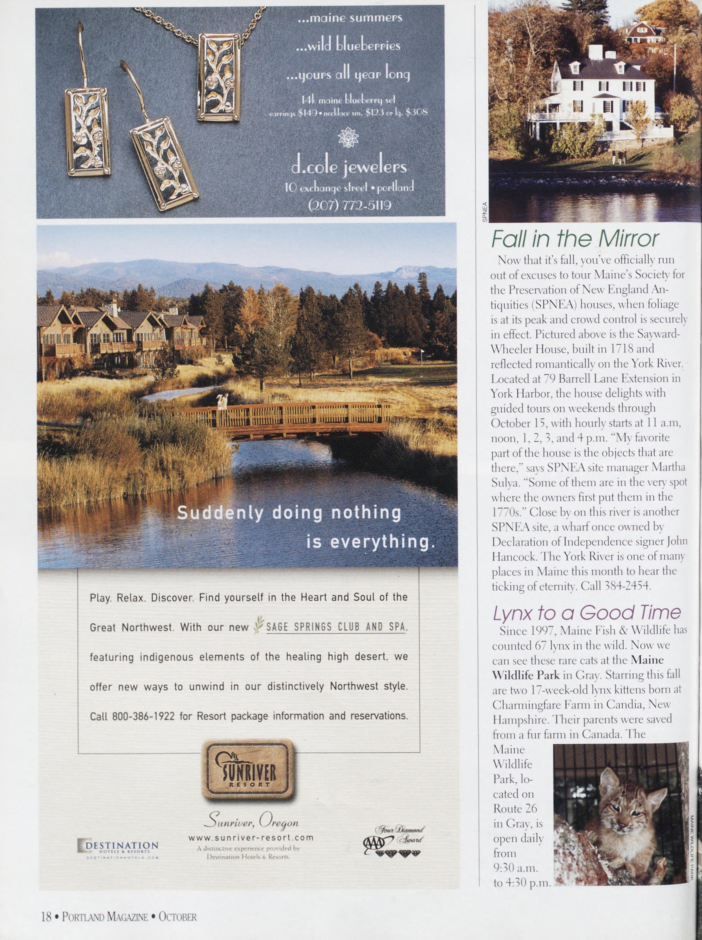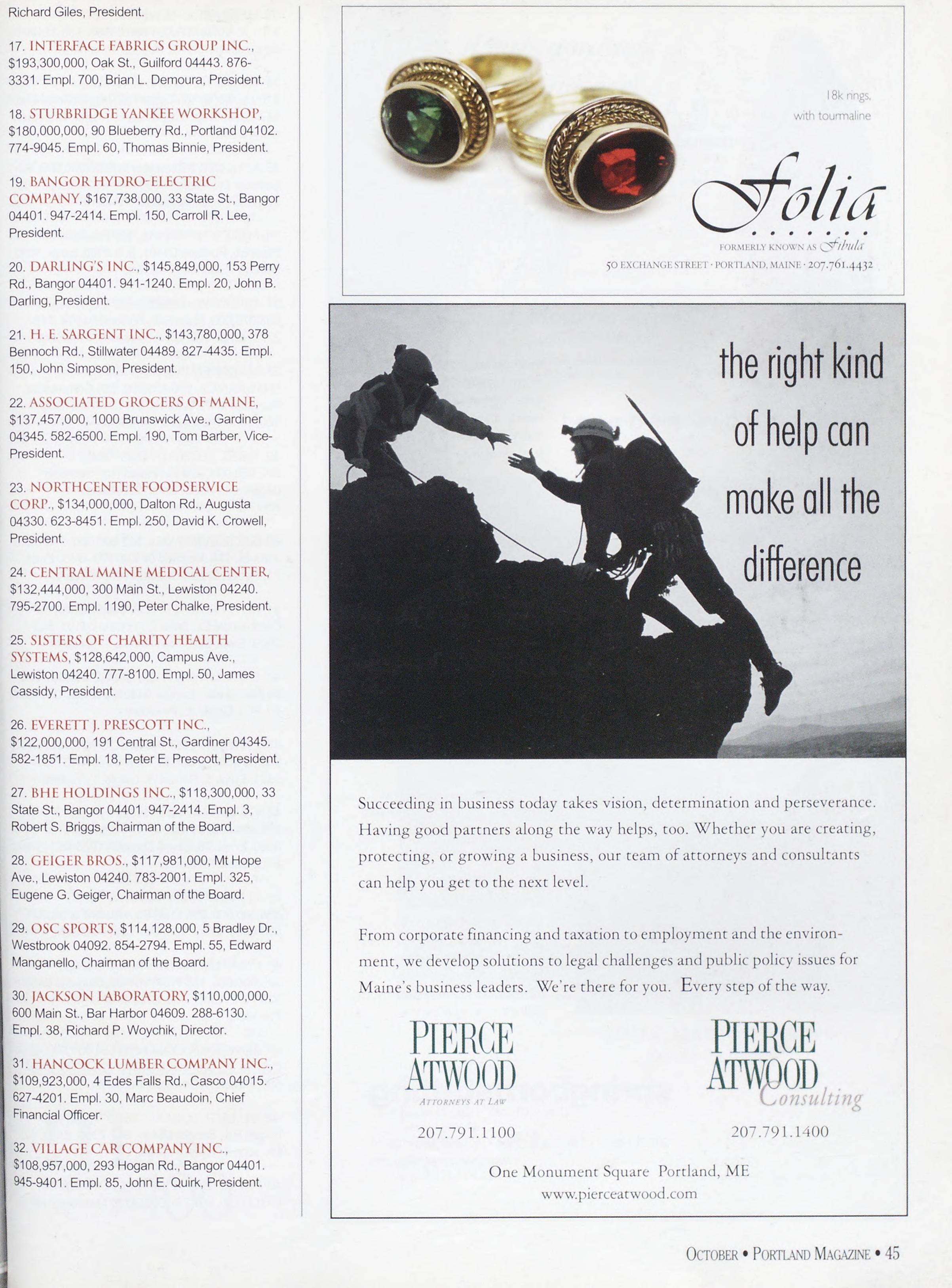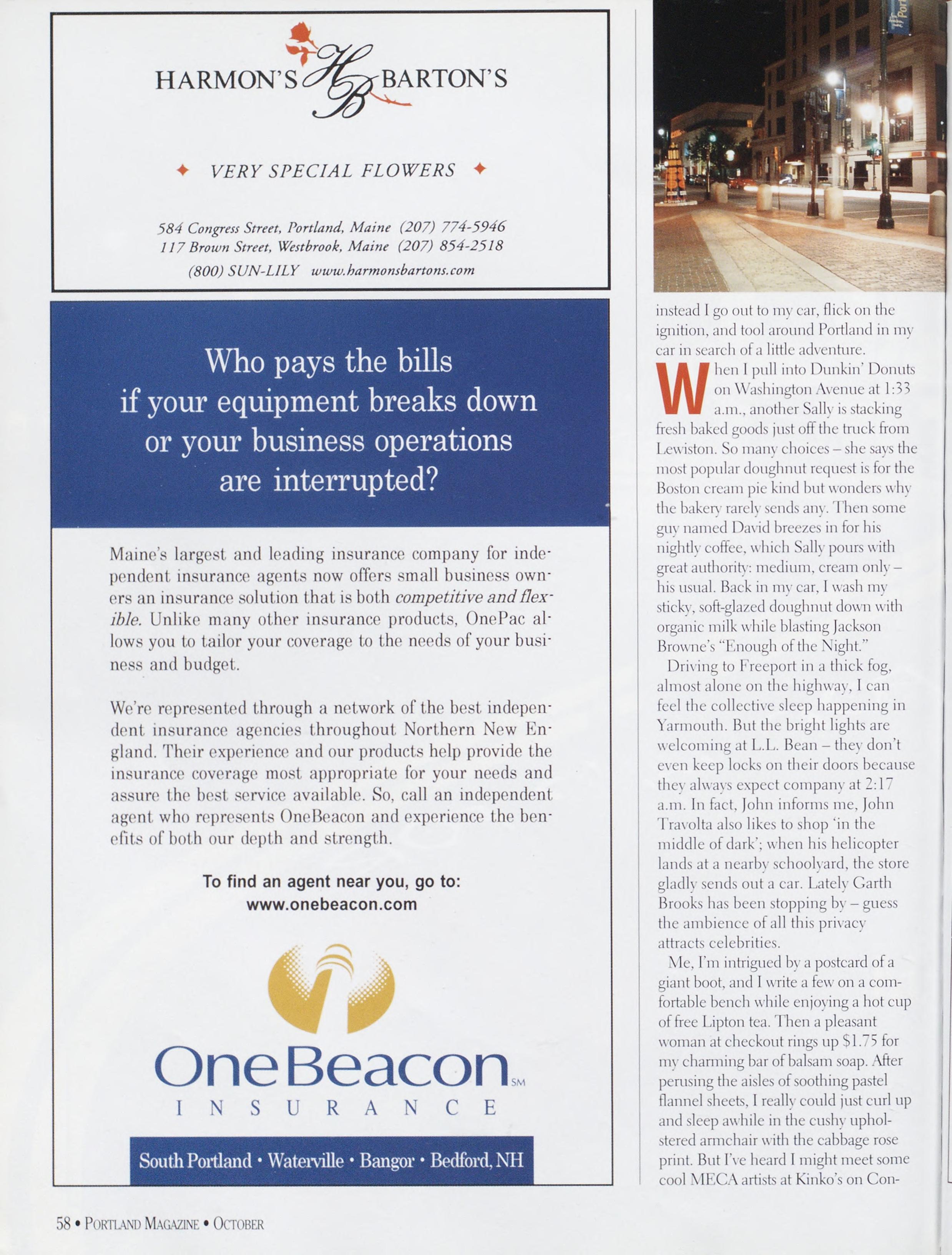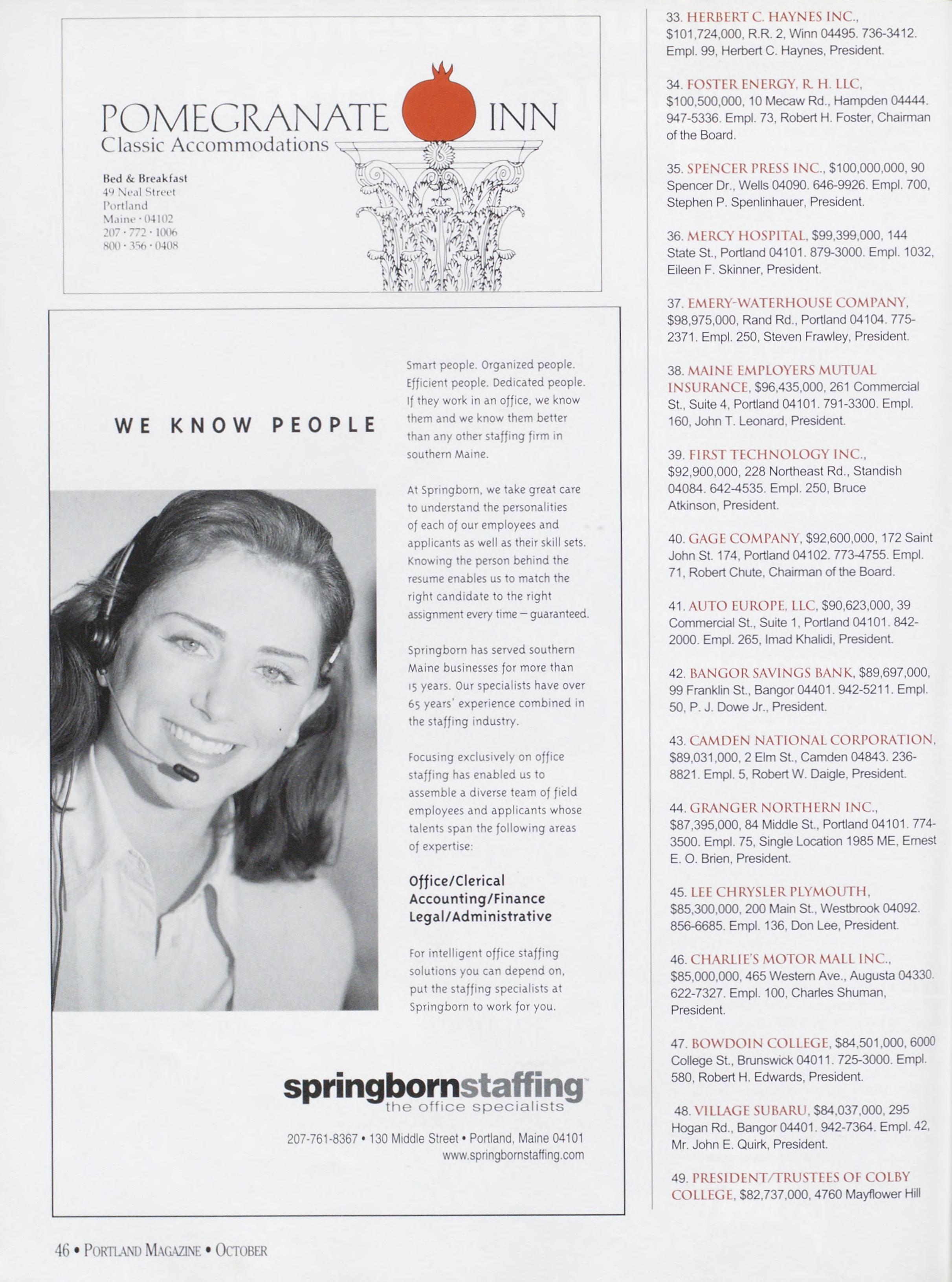 NewsstandCoverDate:October2003.publishedinSeptember2003,Vol.18,No.7,copvright2003. PORTLAND MAGAZINE ismailedatthird-classmailratesinPortland,ME04101(ISSN:1073-1857). Opinionsexpressedinarticlesarethoseofauthorsanddonotrepresenteditorialpositionsof PORTLAND MAGAZINE. Letterstotheeditorarewelcomeandwillbetreatedasunconditionallyassignedfor publicationandcopyrightpurposesandassubjectto PORTLAND MAGAZINE’Sunrestrictedrighttoedit andcommenteditorially.Responsibleonlyforthatportionofanvadvertisementwhichisprinted incorrectly.Advertisersarcresponsibleforcopvrightsofmaterialsthevsubmit.Nothinginthisissue maybereprintedinwholeorinpartwithoutwrittenpermissionfromthepublishers.Submissions welcome,butwetakenoresponsibilityforunsolicitedmaterials.