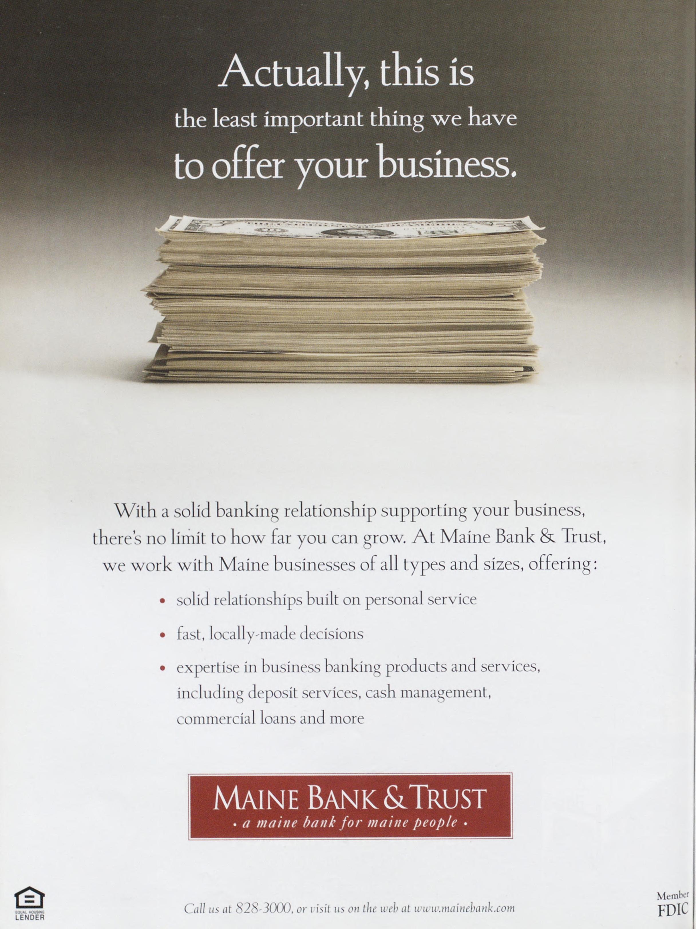 the least important thing we have .toofferyourbusiness. Withasolidbankingrelationshipsupportingyourbusiness, there’snolimittohowfaryoucangrow.AtMaineBank&Trust, weworkwithMainebusinessesofalltypesandsizes,offering: