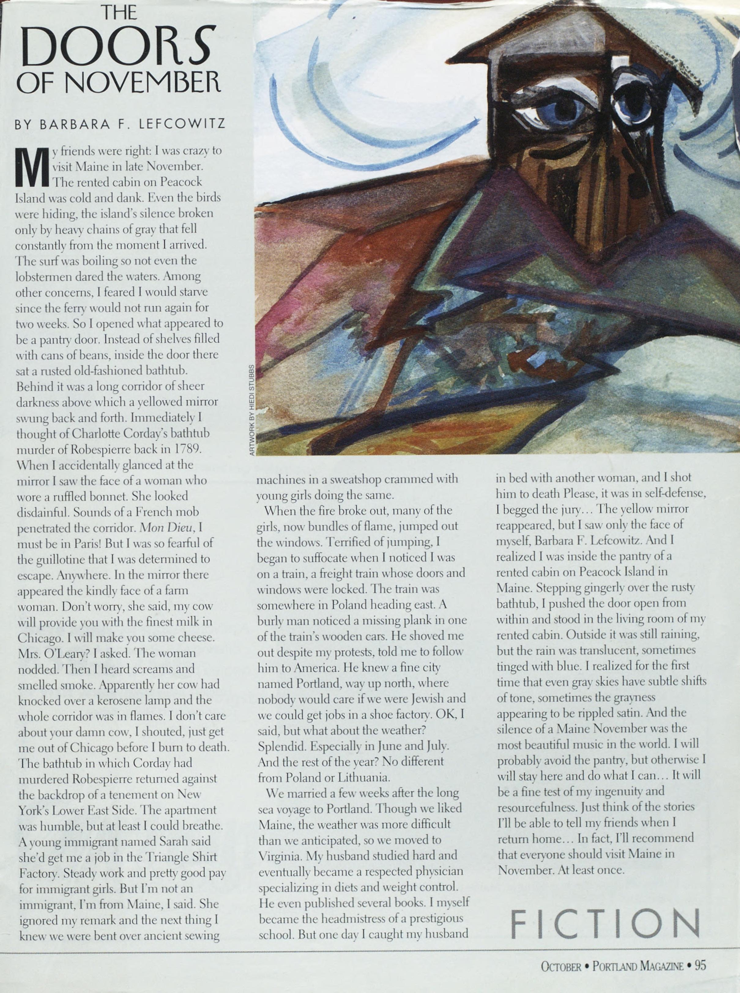 friendswereright:1wascrazyto visit.MaineinlateNovember. TherentedcabinonPeacock Islandwascoldanddank.Eventhebirds werehiding,theisland’ssilencebroken onlybyheaxychainsofgraythatfell constantlyfromthemomentIarrix’cd. 'f'hesurfwasboilingsonotoxenthe lobstermendaredthewaters./\mong otherconcerns,1feared1wouldstarxe sincetheferrywouldnotrunagainfor twoweeks.SoIopenedwhatappearedto beapantrydoor.Insteadofshekesfilled withcansofbeans,insidethedoorthere satarustedold-fashionedbathtub. Behinditwasalongcorridorofsheer darknessabovewhichayellowedmirror swungbackandforth.ImmediatelyI thoughtofCharlotteCorday’sbathtub murderofRobespierrebackin1789. WTen1accidcntalk'glancedatthe mirrorIsawthefaceofawomanwho worearuffledbonnet.Shelooked disdainful.SoundsofaFrenchmob penetratedthecorridor.Mon Dien. 1 mustbeinParis!ButIwassofearfulof theguillotinethatIwasdeterminedto escape.Anx-wbcre.Inthemirrorthere appearedthekindkfaceofafarm woman.Don’tworry,shesaid,nix'cow willprovideyouwiththefinestmilkin Chicago.Iwillmakeyousomecheese. Mrs.O’Leary?Iasked.Iliewoman nodded.ThenIheardscreamsand smelledsmoke.Apparentlyhercowhad knockedoxerakerosenelampandthe wholecorridorwasinflames.Idon’tcare aboutyourdamncow.Ishouted,justget meoutofChicagobefore1burntodeath. ThebathtubinwhichCordayhad murderedRobespierrereturnedagainst thebackdropofatenementonNew York’sLowerEastSide.Theapartment washumble,butatleastIcouldbreathe. AxoungimmigrantnamedSarahsaid she’dgetmeajobintheTriangleShirt Factory.Steadyworkandprettygoodpay forimmigrantgirls.ButI’mnotan immigrant,I’mfromMaine,Isaid.She ignoredmyremarkandthenextthing1 knewwewerebentoxerancientsewing