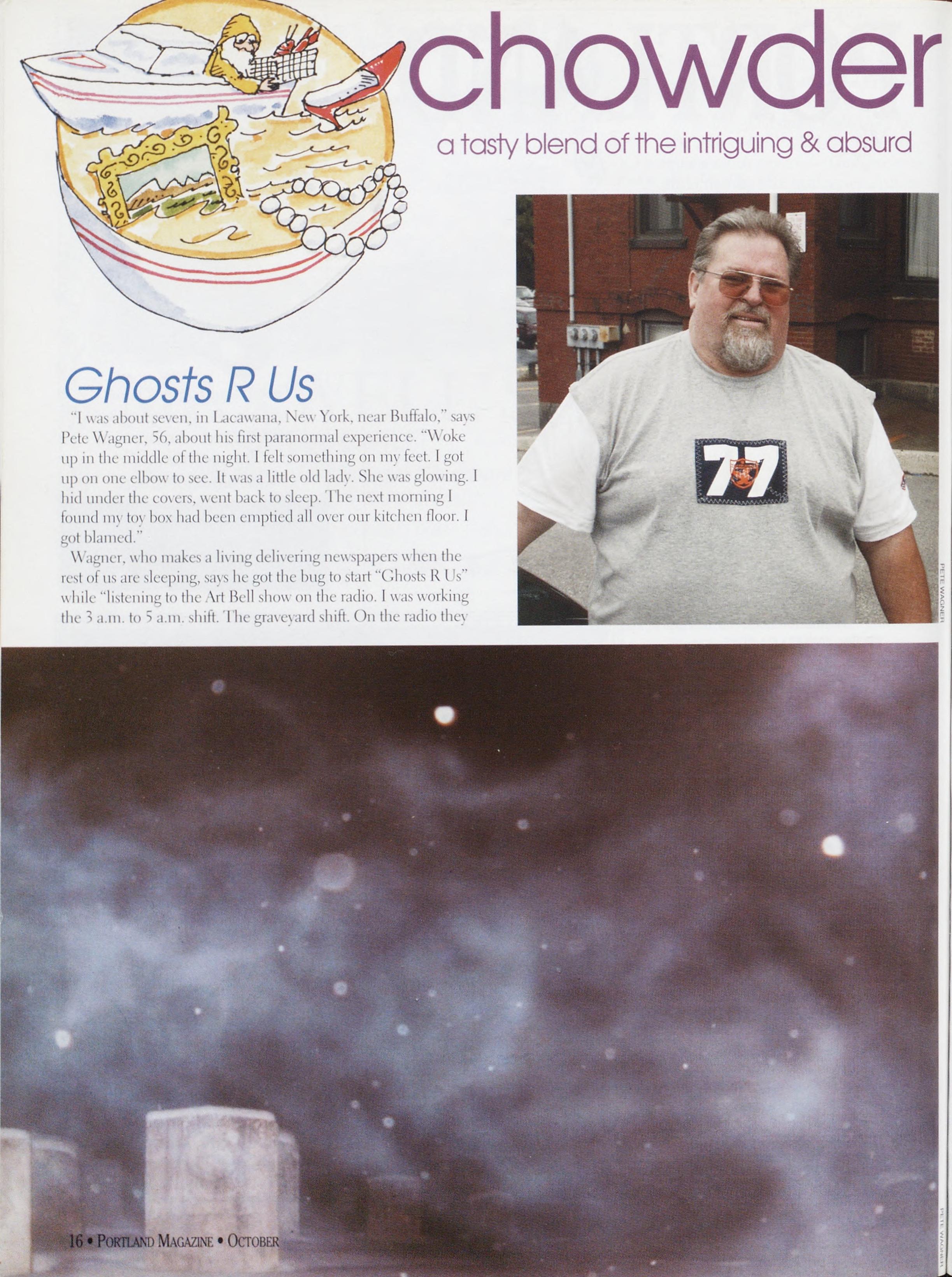 Ghosts R Us "Iwasaboutseven,inIxicawana,Xew'lork,nearBuffalo,says PeteWagner,56,abouthisfirstparanormalexperience.''Woke upinthemiddleofthenight.Ifeltsomethingonmyfeet.Igot upononeelbowtosee.Itwasalittleoldlady.Shewasglowing.I hidunderthecovers,wentbacktosleep.’IhenextmorningI foundmvtovboxhadbeenemptiedalloverourkitchenfloor.I gotblamed.”
