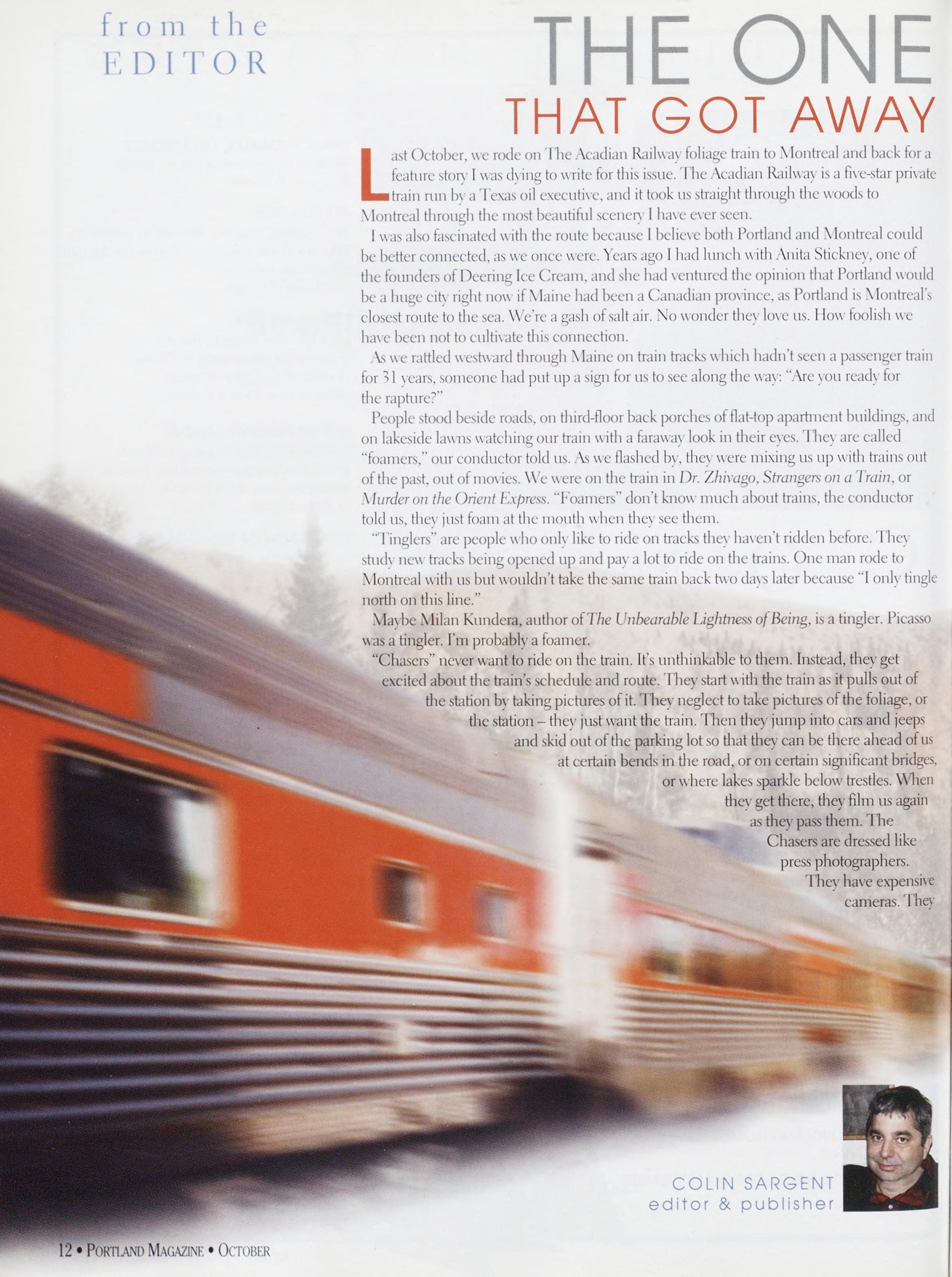 THE ONE THAT GOT AWAY astOctober,werodeonTheAcadianRailwayfoliagetraintoMontrealandbackfora featurestoryIwasdvingtowriteforthisissue.IheAcadianIhiilwayisafive-starprivate trainrunbyaTexasoilexecutive,andittookusstraightthroughthewoodsto ,\lontrealthroughthemostbeautifulscenery1haveeverseen.