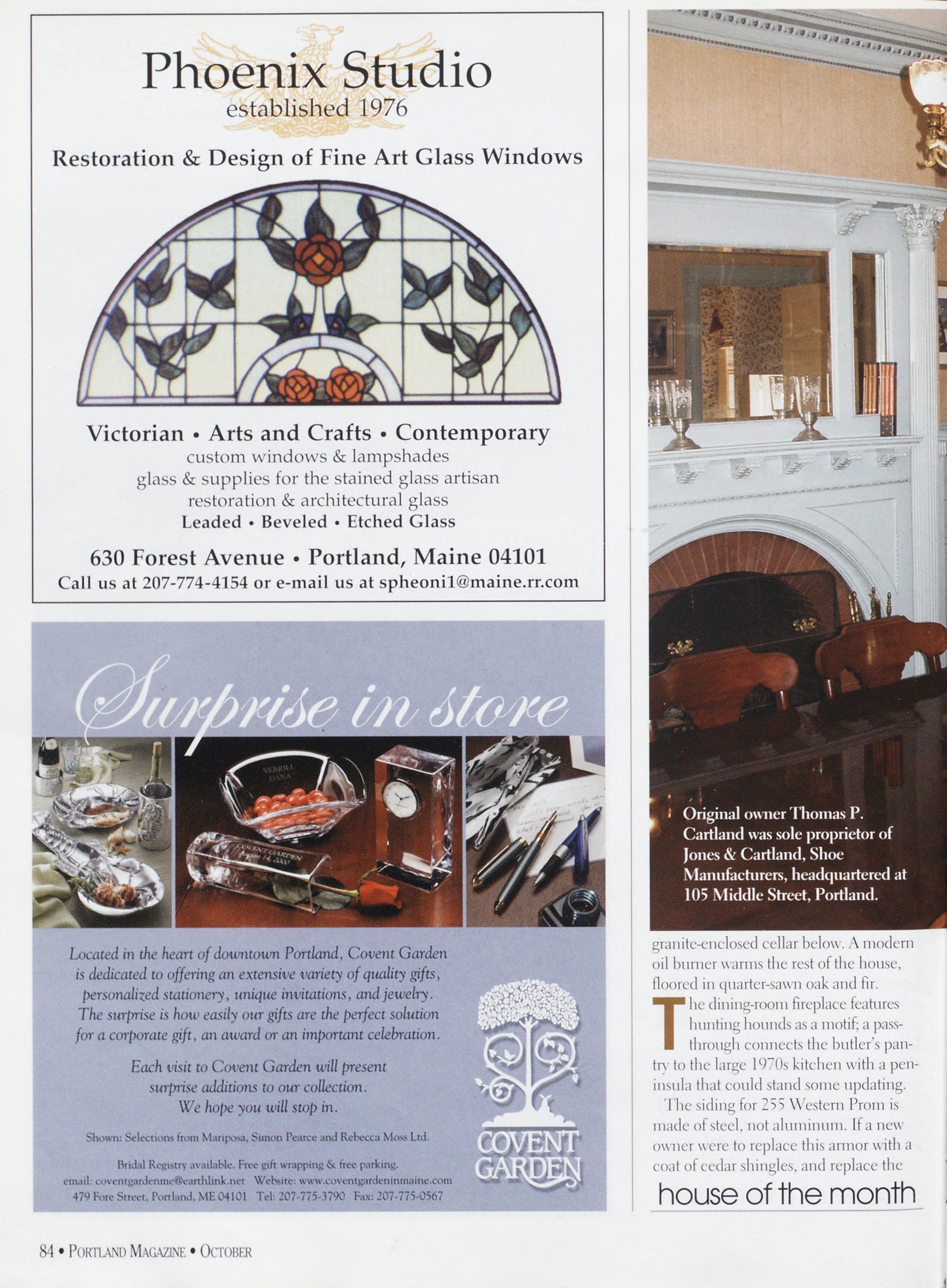 Phoenix-Studio glass&suppliesforthestainedglassartisan restoration&architecturalglass Leaded • Beveled • Etched Glass 630ForestAvenue•Portland,Maine04101