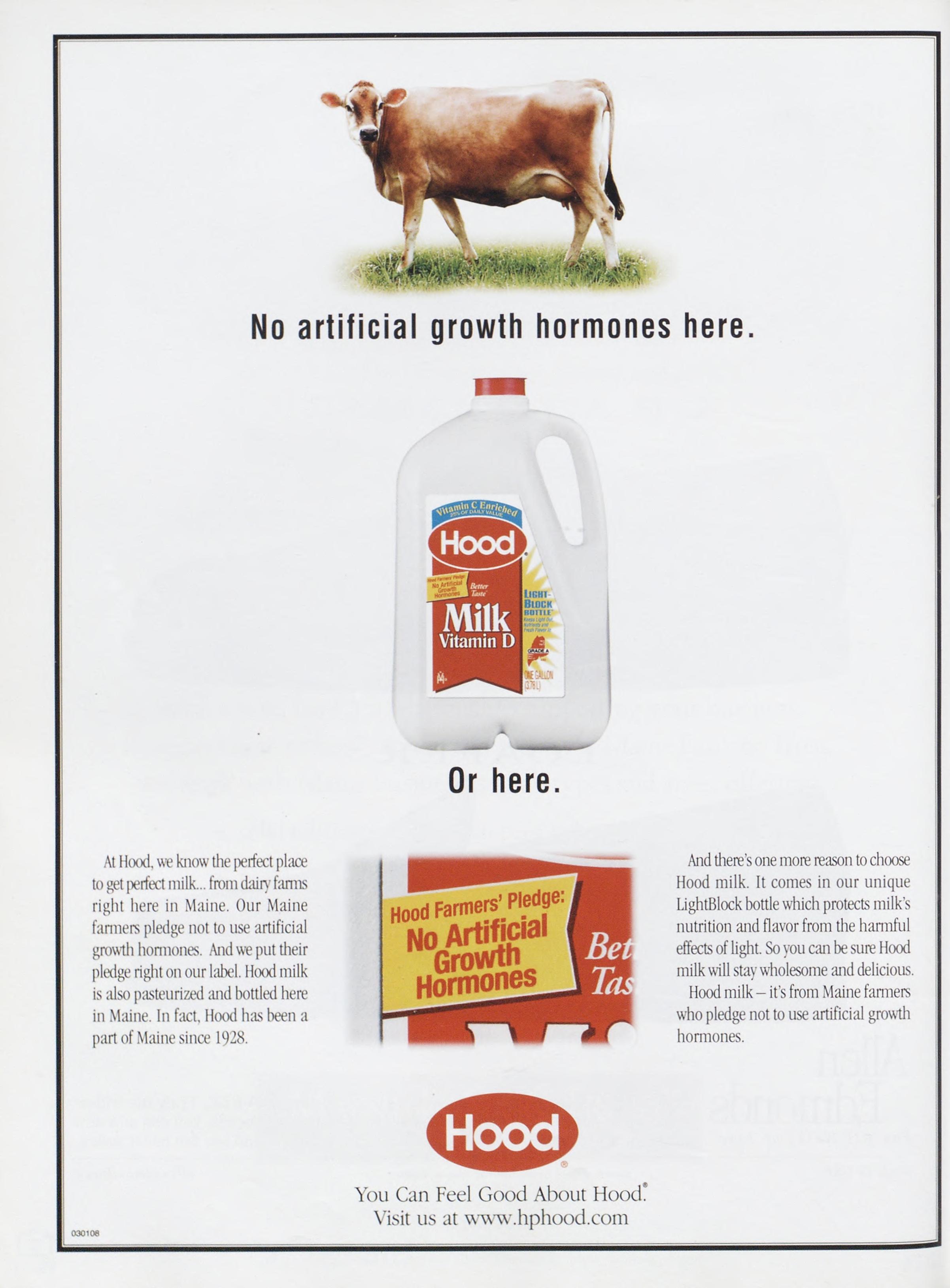 Noartificialgrowthhormoneshere. AtHood,weknowtheperfectplace togetperfectmilk...fromdairyfanns right here in Maine. Our Maine fannerspledgenottouseartificial growthhonnones.Andweputtheir pledgerightonourlabel.Hoodmilk isalsopasteurizedandbottledhere inMaine.Infact,Hoodhasbeena partofMainesince1928.