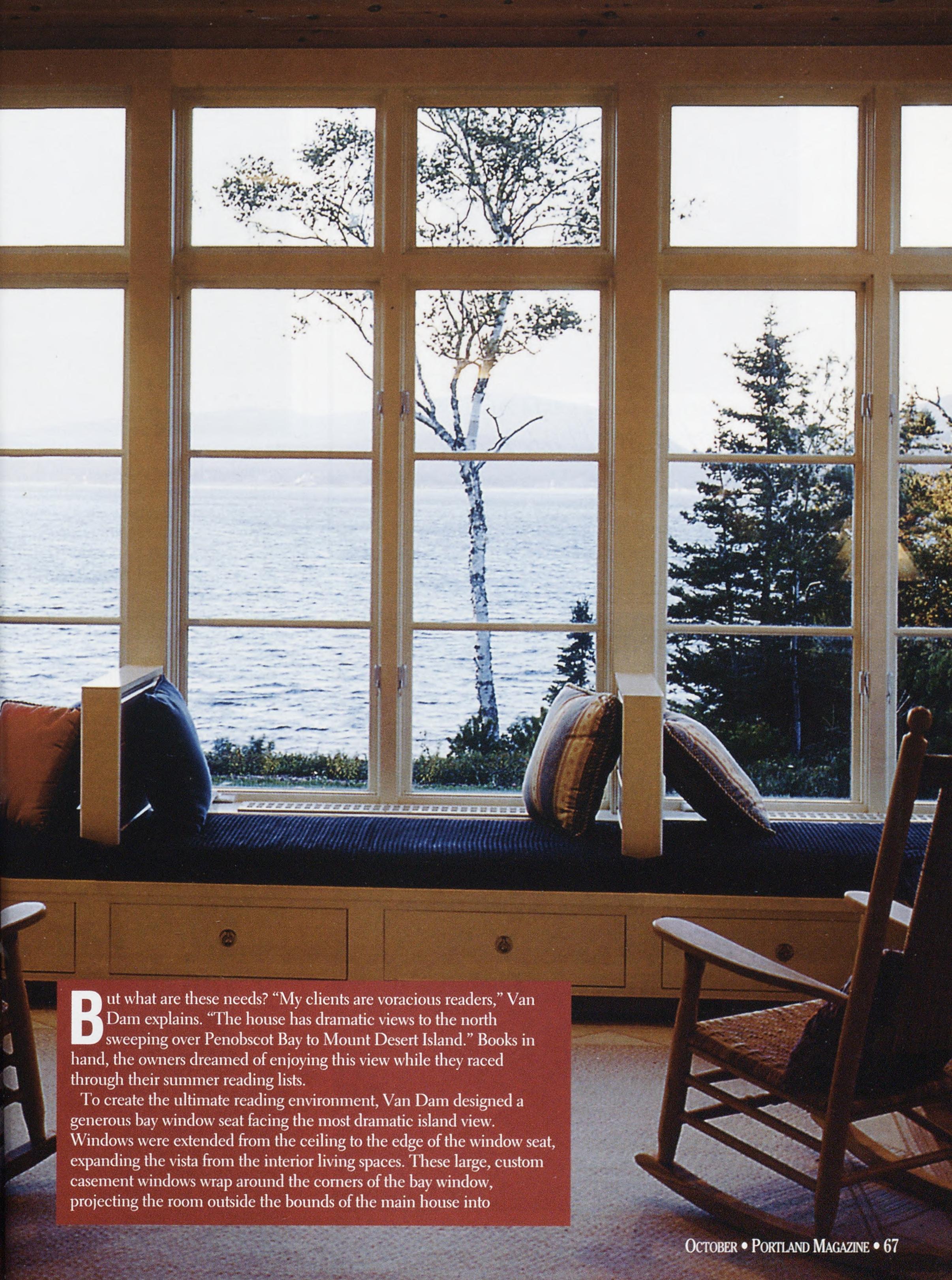 AsurveybvGreaterPortlandLand¬ marksmakesspecialmentionof theorielwindow,whichlikea hoodedcvebrowabovethesecond-floor doorwaystakesinspectacularviewsoftin PortlandInternationalJetportandthe softgreenhillsfoldingbehindittothe WhiteMountainsinthedistance. Enteringthroughthemassiveoakdoor withstained-glasssidelights,visitorsarc houseofthemonth