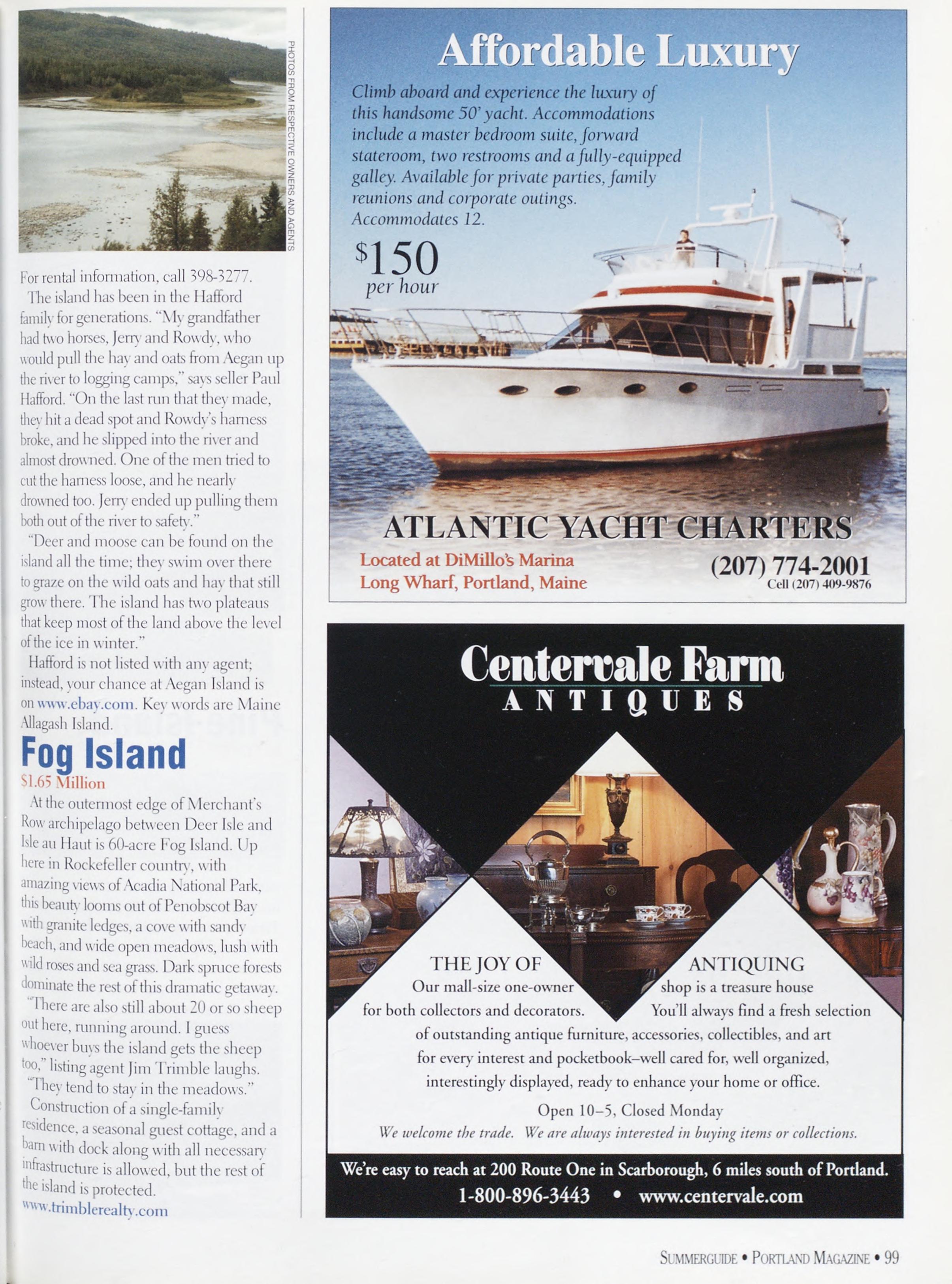 FogIsland, IsleanHaul Spectacular60acreislandlocatedbetweenDeerIsleandBlueHill,ontheoutermostedgeofthe MerchantsRowArchipelago.Inanareaoflegendarybeauty,theseareprimecruisinggrounds.Nicely crownedislandfeaturesboldledges,openmeadows,andgrazingsheep.ViewswesttotheCamden Hills,northeasttoCadillacMountainandAcadiaNationalPark.OfferedatSI.650.000CallBangor 207-947-1507