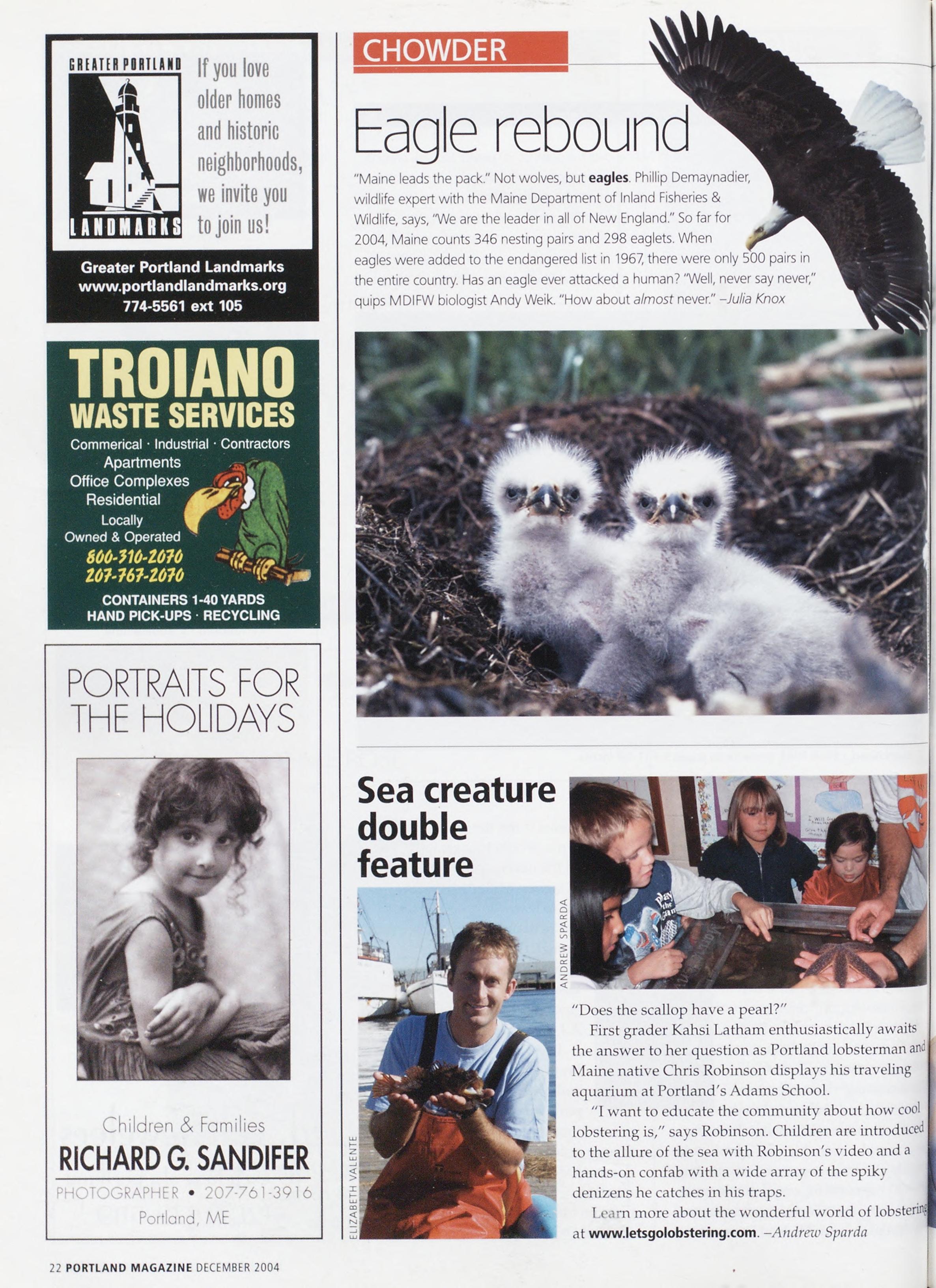 "Maineleadsthepack."Notwolves,but eagles. PhillipDemaynadier, wildlifeexpertwiththeMaineDepartmentofInlandFisheries& Wildlife,says,"WearetheleaderinallofNewEngland."Sofarfor 2004,Mainecounts346nestingpairsand298eaglets.When eagleswereaddedtotheendangeredlistin1967,therewereonly500pairsin theentirecountry.Hasaneagleeverattackedahuman?"Well,neversaynever," quips MDIFW biologist Andy Weik. "How about almost never." -JuliaKnox