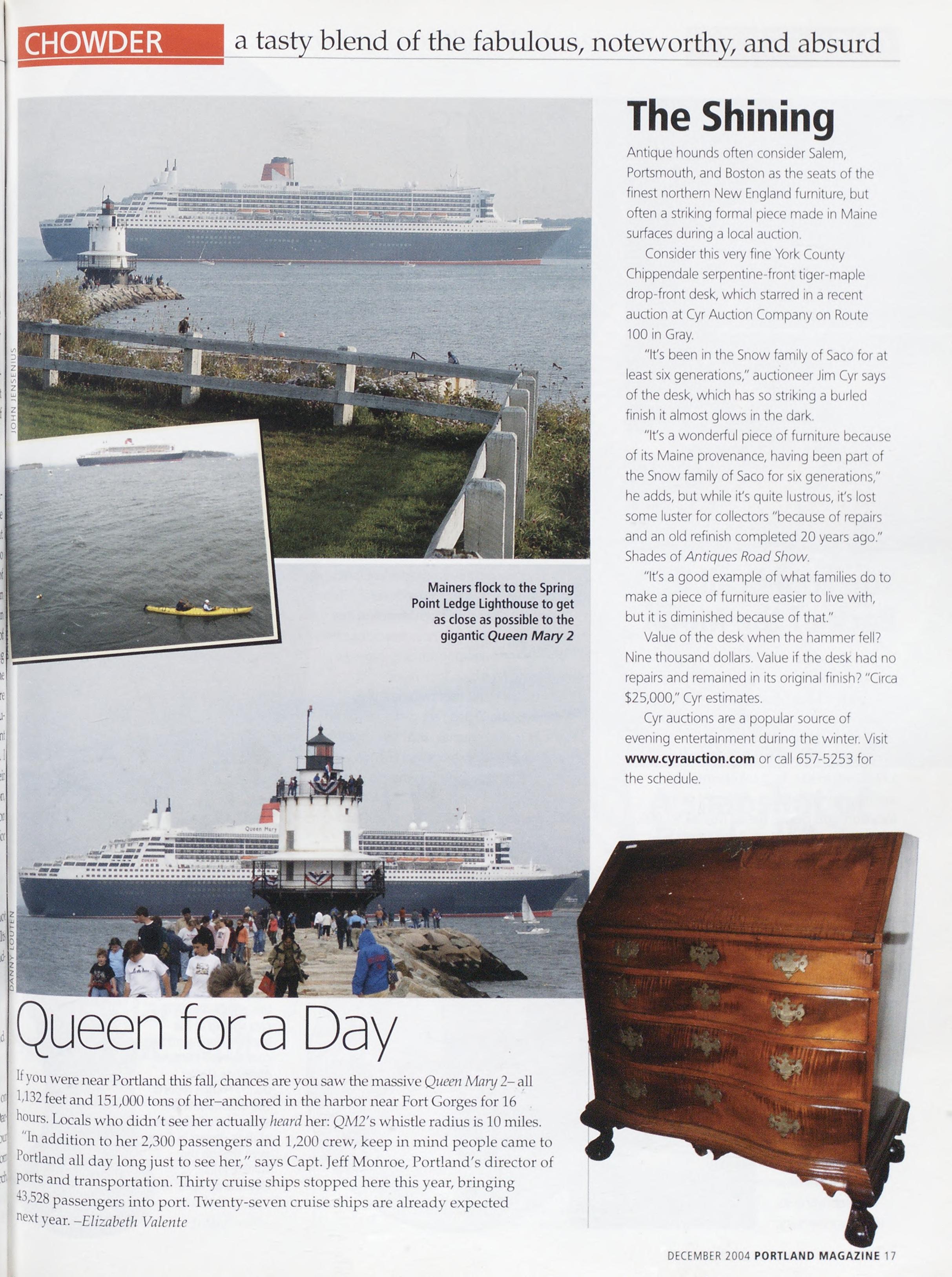 ConsiderthisveryfineYorkCounty Chippendaleserpentine-fronttiger-maple drop-frontdesk,whichstarredinarecent auction at Cyr Auction Company on Route 100inGray.