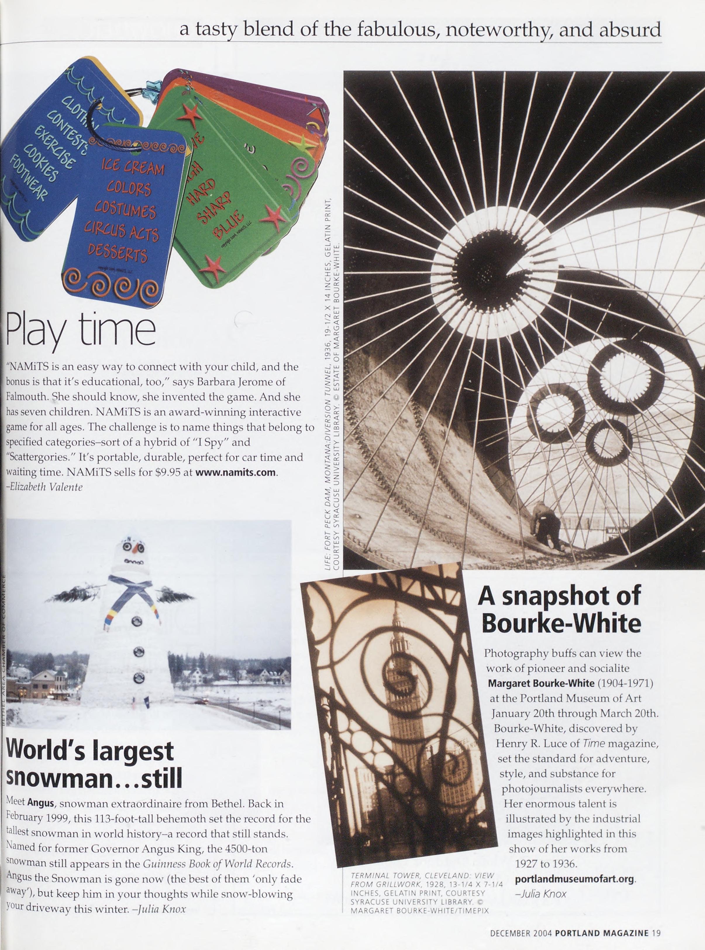 Photography buffs can view the work of pioneer and socialite MargaretBourke-White (1904-1971) at the Portland Museum of Art January 20th through March 20th. Bourke-White, discovered by Henry R. Luce of Time magazine, set the standard for adventure, style, and substance for photojournalists everywhere. Her enormous talent is illustrated by the industrial images highlighted in this show of her works from 1927 to 1936. portlandmuseumofart.org. -JuliaKnox