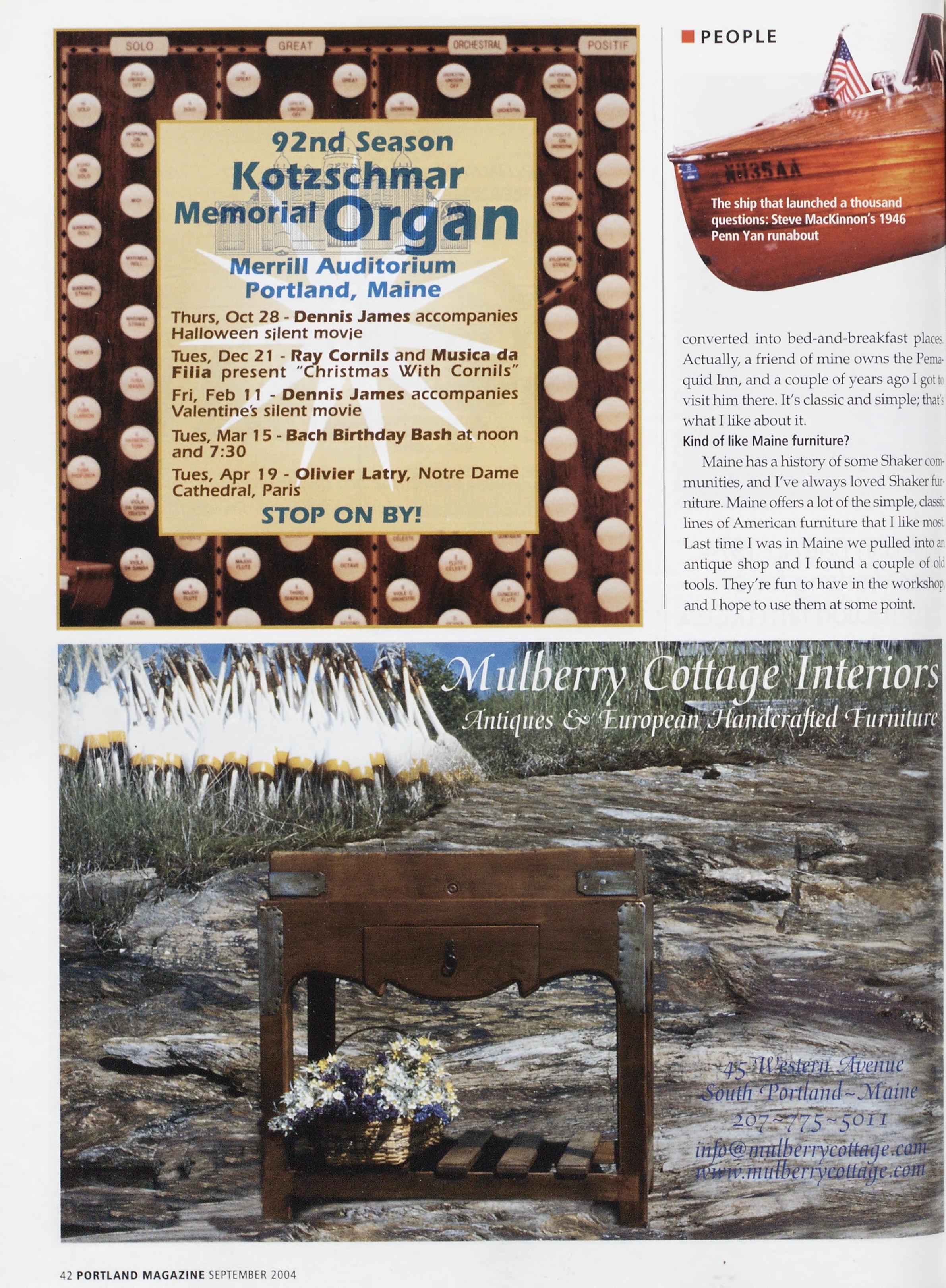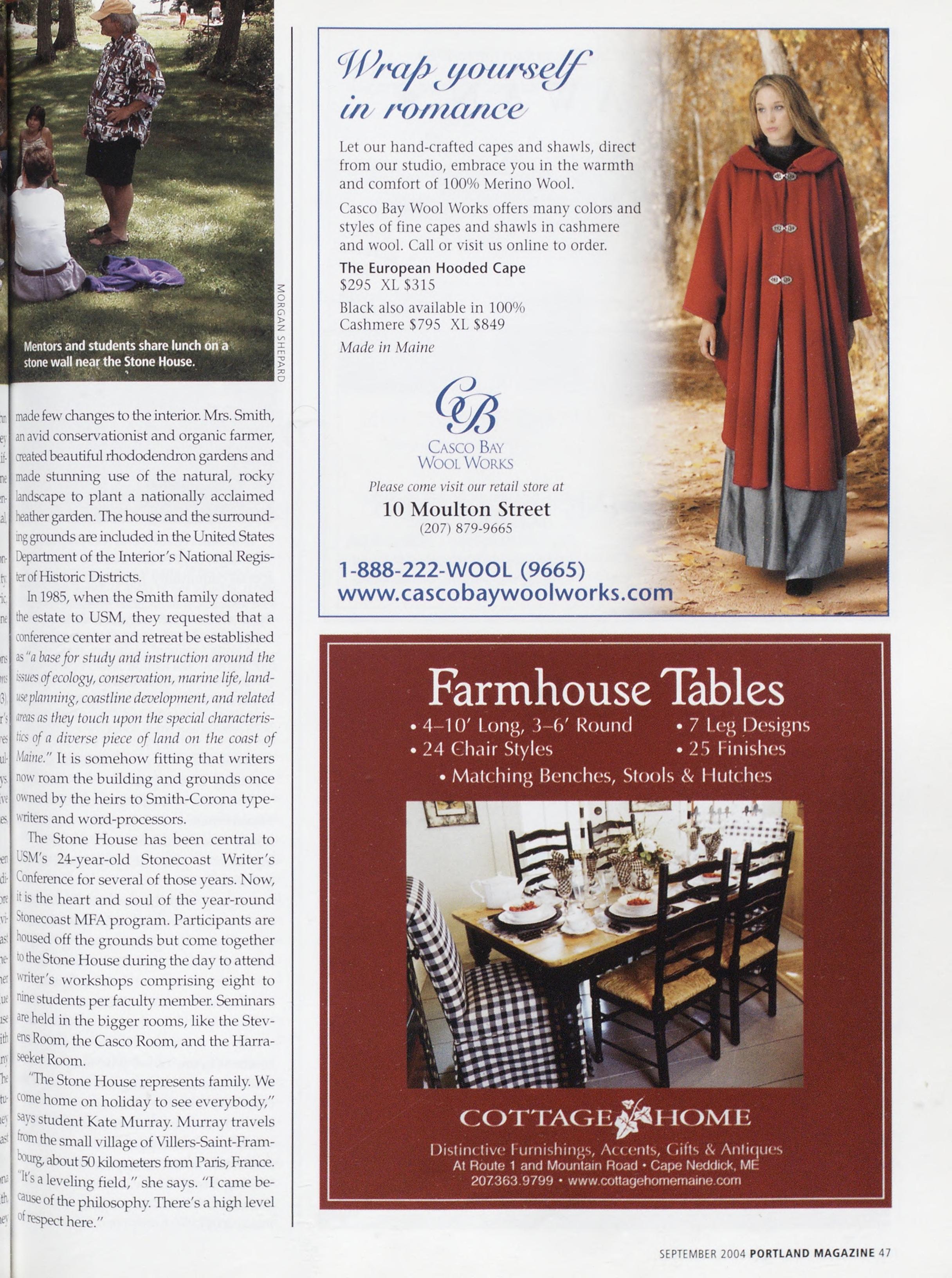 NewsstandCoverDate:September2004,publishedinAugust2004,10 19,No.6,copyright2004.Portland Magazineismailedatthirdds mailratesinPortland,ME04101(ISSN:1073-1857).Opinionsexpress* inarticlesarethoseofauthorsanddonotrepresenteditorialposters ofPortland Magazine.LetterstotheeditorarewelcomeandwSh treatedasunconditionallyassignedforpublicationandcopyrightpt posesandassubjecttoPortland Magazine'sunrestrictedrighttoeo: andcommenteditorially.Responsibleonlyforthatportionofab advertisementwhichisprintedincorrectly.Advertisersareresponse forcopyrightsofmaterialstheysubmit.Nothinginthisissue reprintedinwholeorinpartwithoutwrittenpermissionfromthe lishers.Submissionswelcome,butwetakenoresponsibilityforor® licitedmaterials.