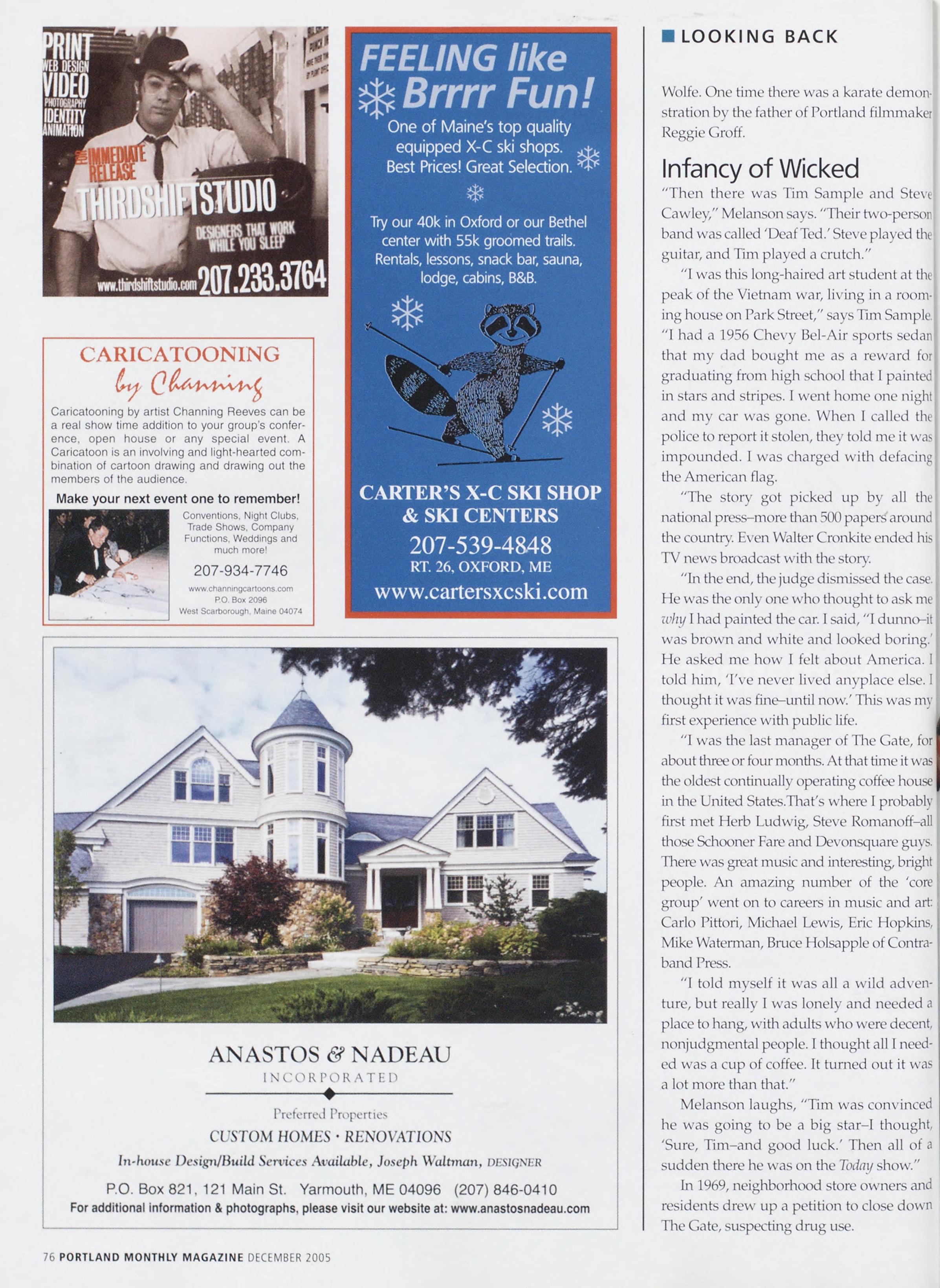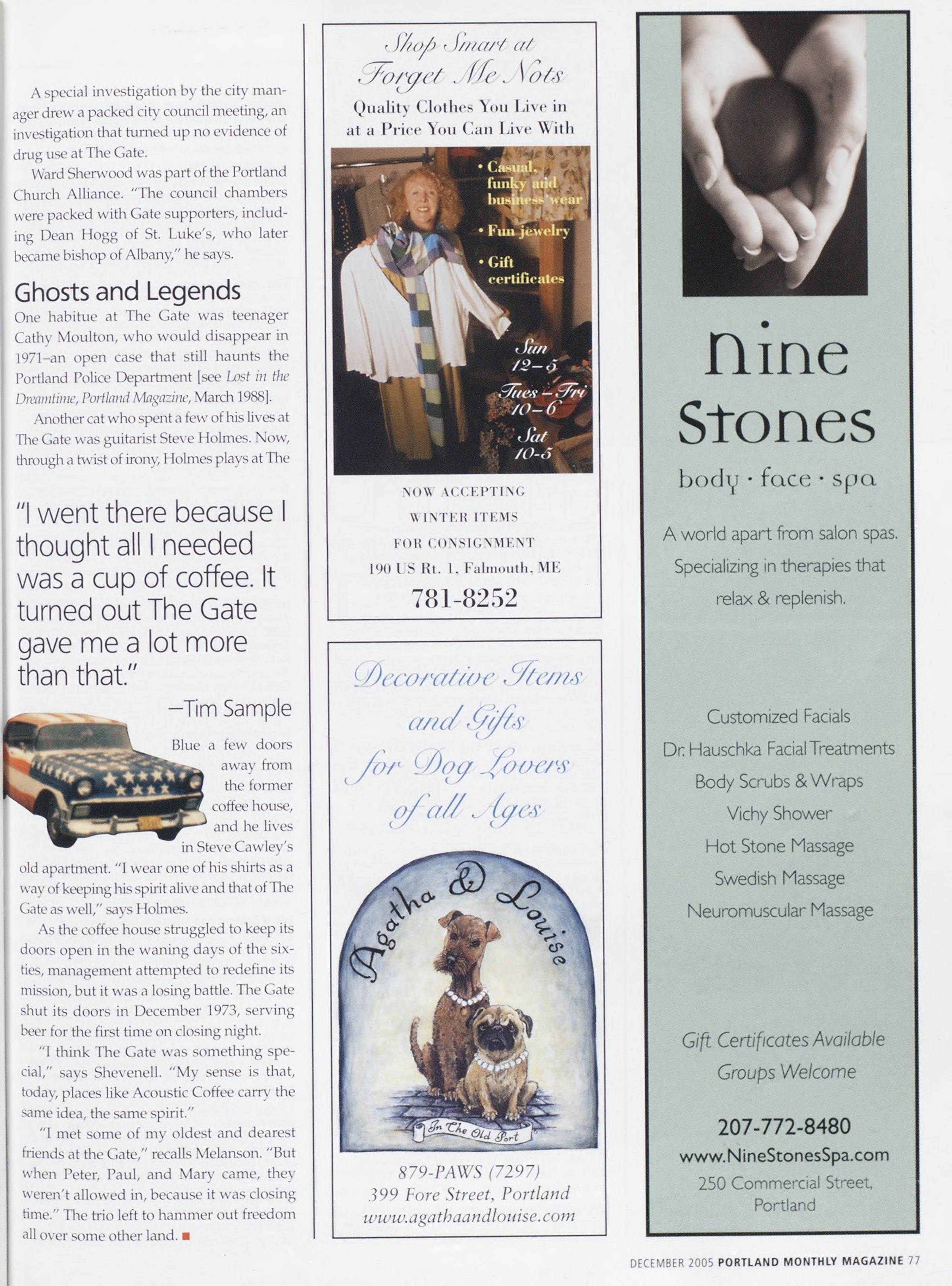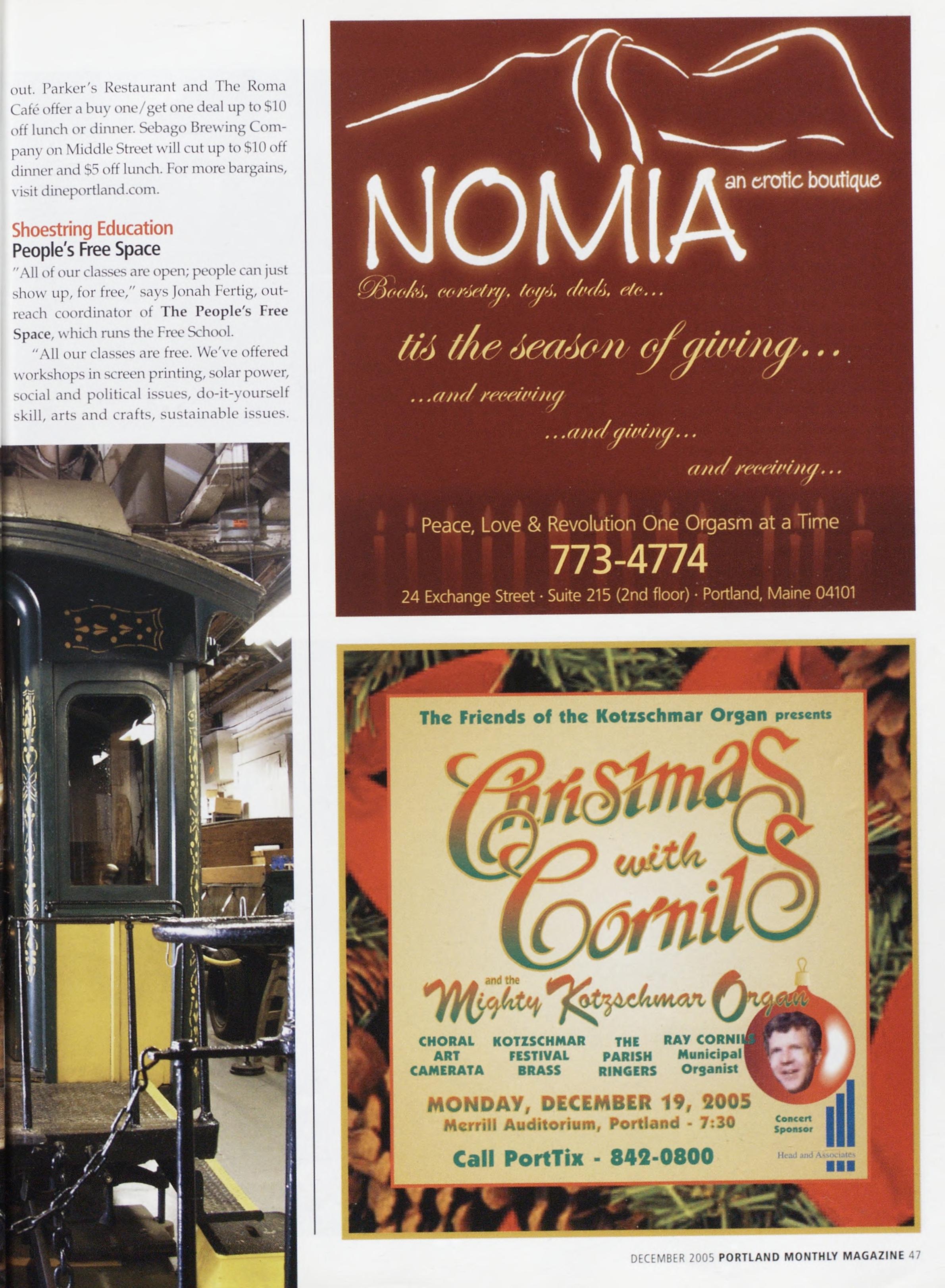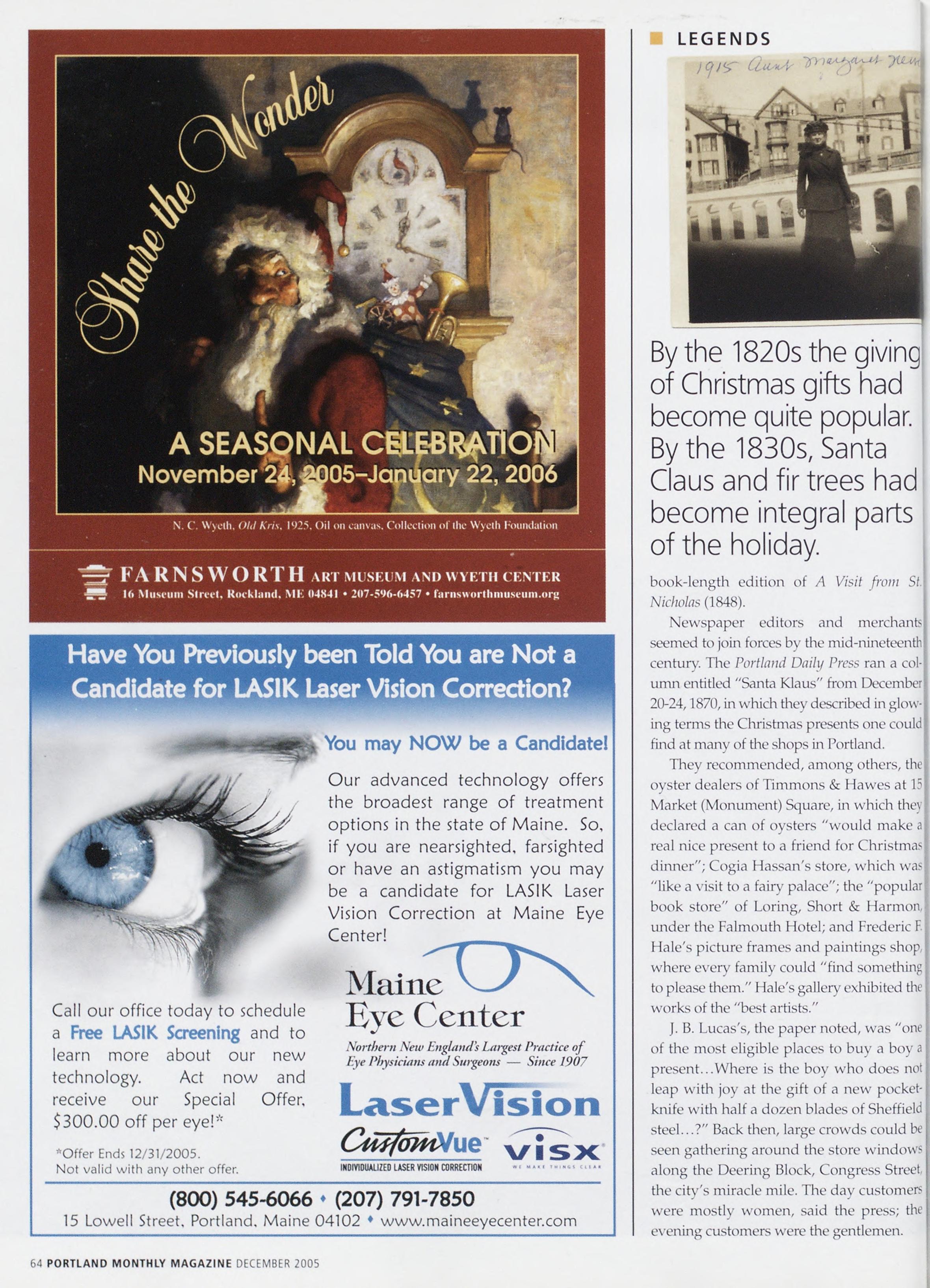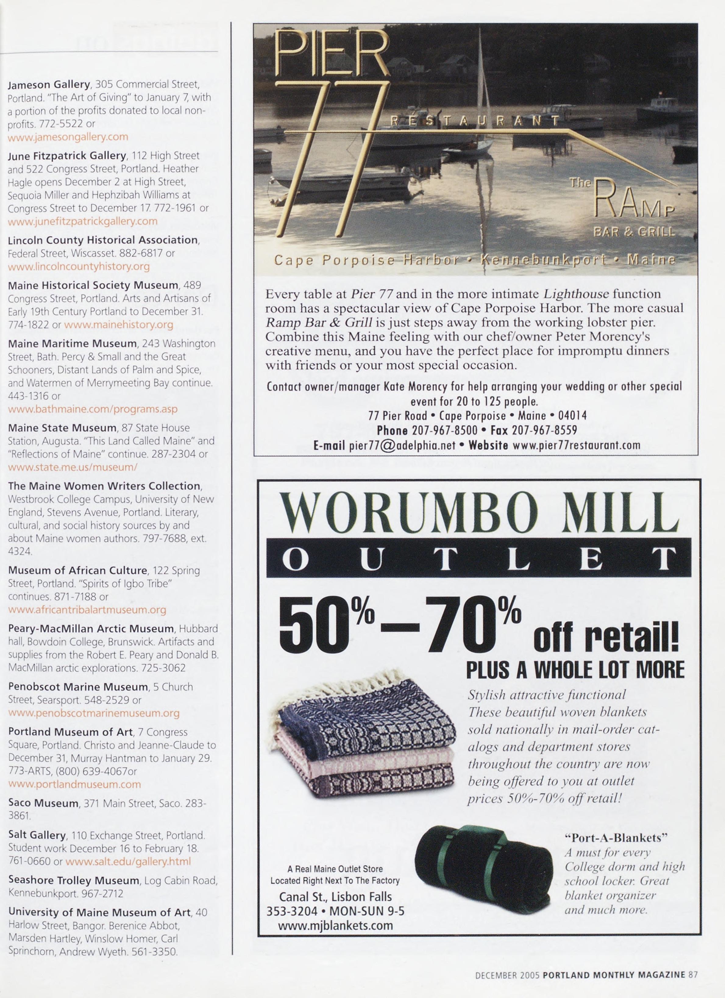 Newsstand Cover Date: December 2005. published in November 2005, Vol. 20. No. 9. copyright 2005.Portland Magazine ismailedatthirdclass mail rates in Portland. ME 04101 (ISSN 1073-1857). Opinions expressed in articles are those of authors and do not represent editorialpositionsofPortland Magazine. Letters to the editor are welcome and will be treated as unconditionally assigned for publication and copynght purposes and as subject toPortland Magazine's unrestrict¬ ed right to edit and comment editorially Responsible only for that por¬ tion of any advertisement which is printed incorrectly. Advertisers are responsible for copyrights of materials they submit Nothing in this issue may be reprinted in whole or in part without written permission from the publishers. Submissions welcome, but we take no responsibil¬ ityforunsolicitedmaterials.