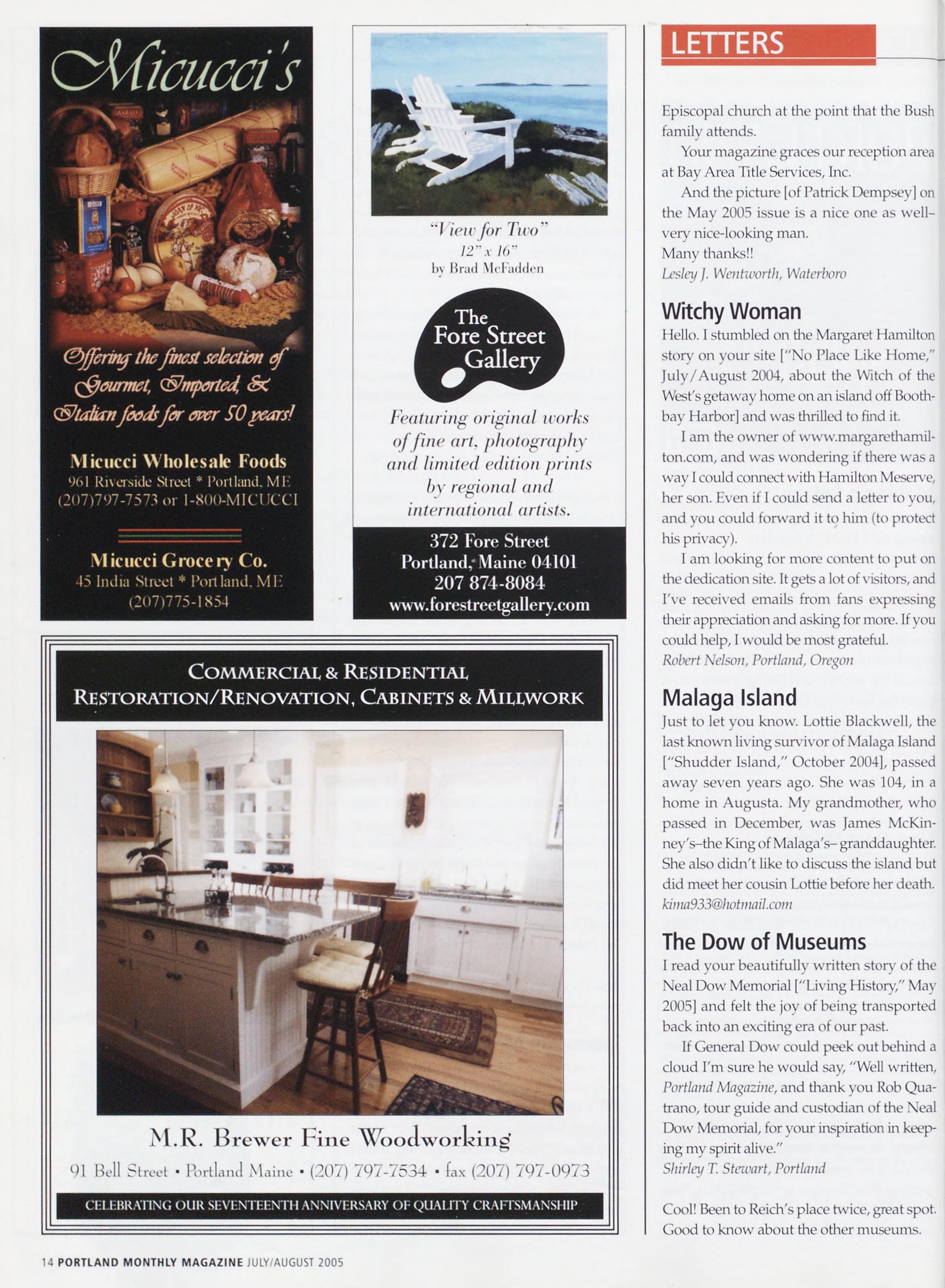 WitchyWoman Hello.IstumbledontheMargaretHamilton storyonyoursite["NoPlaceLikeHome," July/August2004,abouttheWitchofthe West'sgetawayhomeonanislandoffBooth¬ bayHarbor]andwasthrilledtofindit.