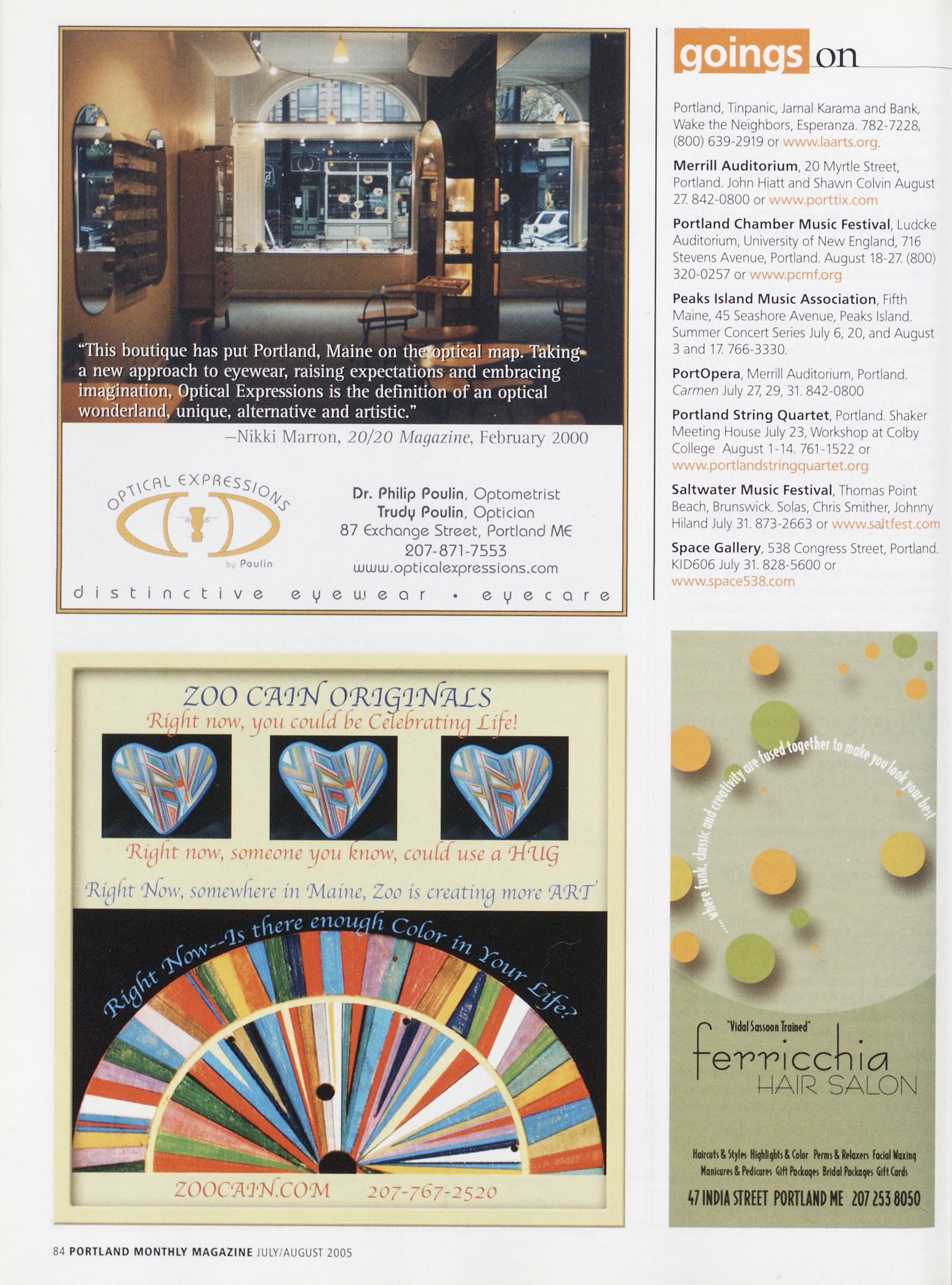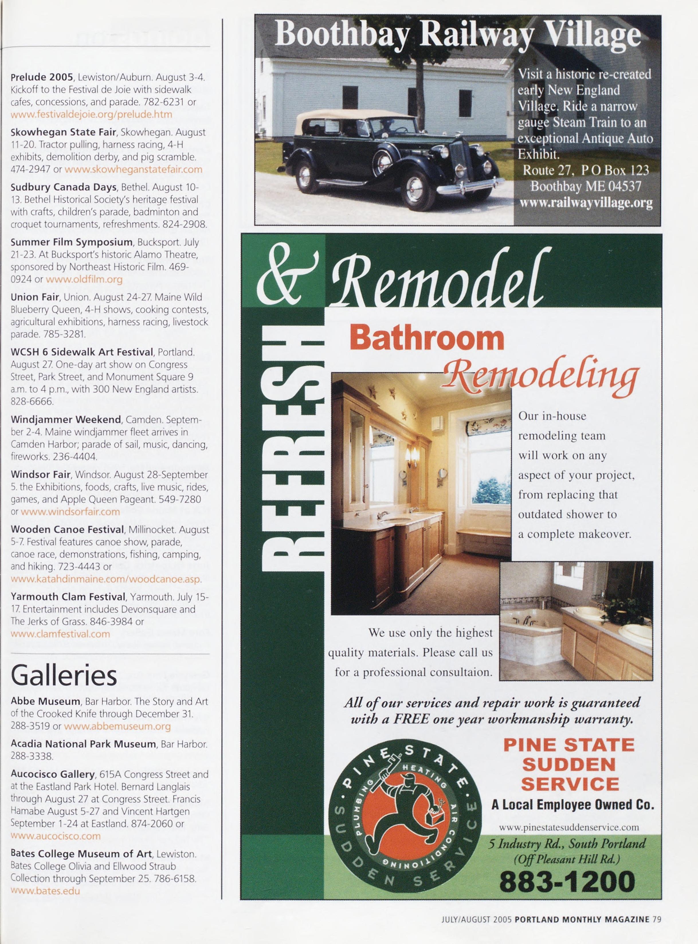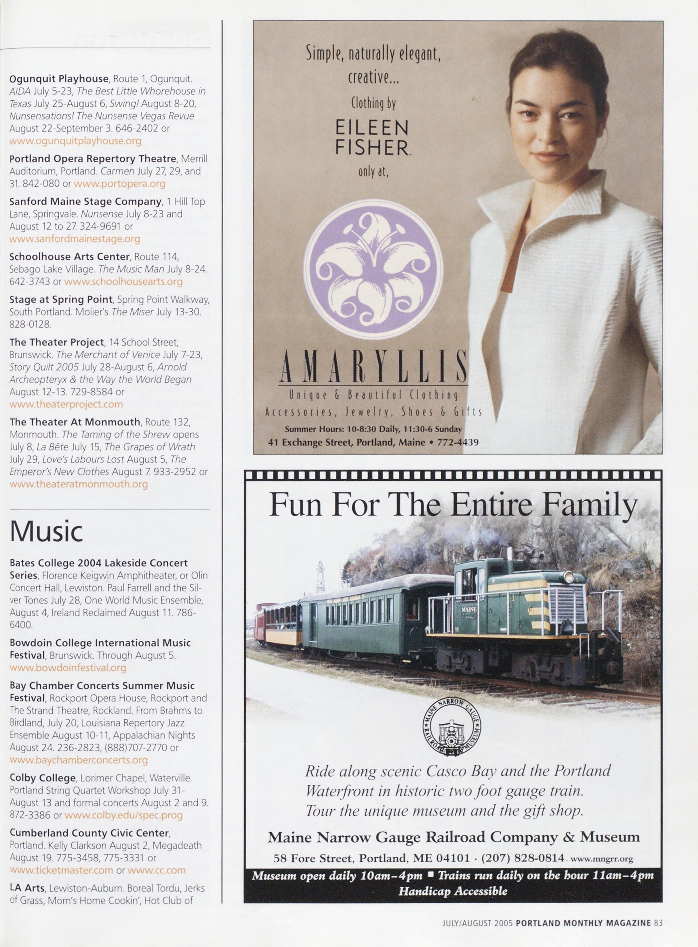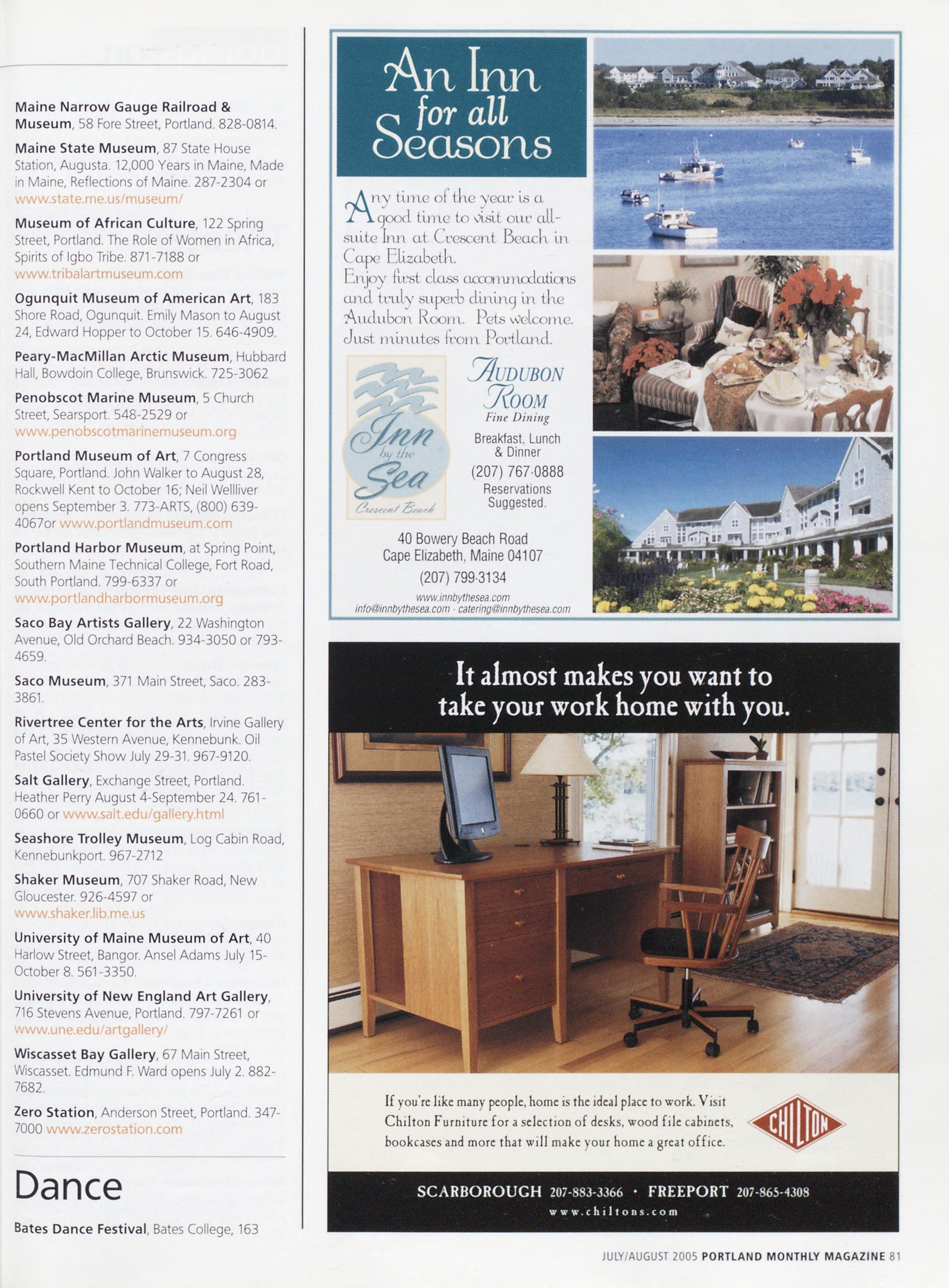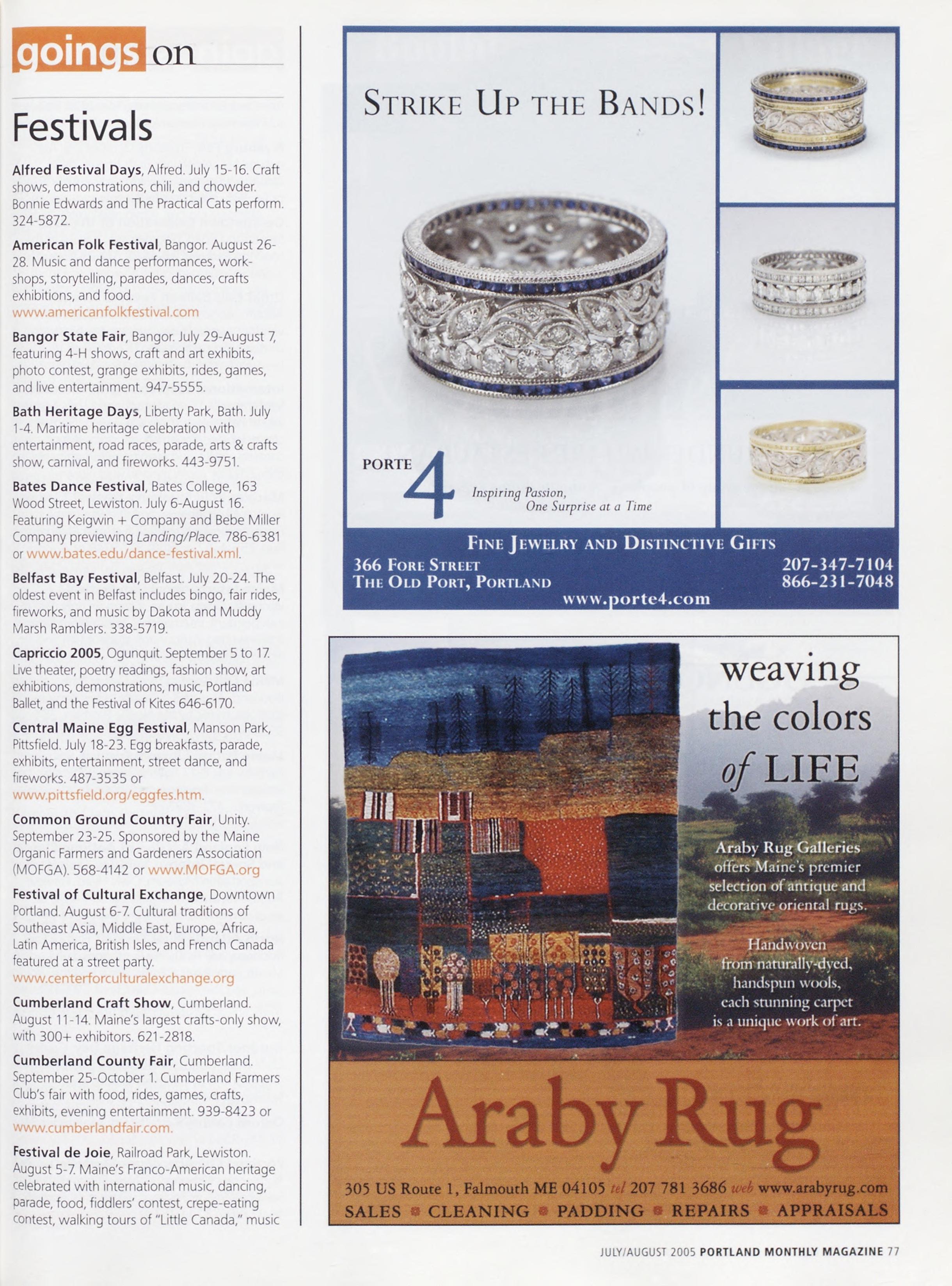 Newsstand Cover Date: July/August 2005, published in June 2005, Vol. 20, No. 5, copyright 2005.Portland Magazine ismailedatthird-class mail rates in Portland, ME 04101 (ISSN: 1073-1857). Opinions expressed in articles are those of authors and do not represent editorial positions ofPortland Magazine. Letters to the editor are welcome and will be treated as unconditionally assigned for publication and copyright pur¬ poses and as subject toPortland Magazine's unrestrictedrighttoedit and comment editorially. Responsible only for that portion of any advertisement which is printed incorrectly. Advertisers are responsible for copyrights of materials they submit. Nothing in this issue may be reprinted in whole or in part without written permission from the pub¬ lishers. Submissions welcome, but we take no responsibility for unso¬ licitedmaterials.