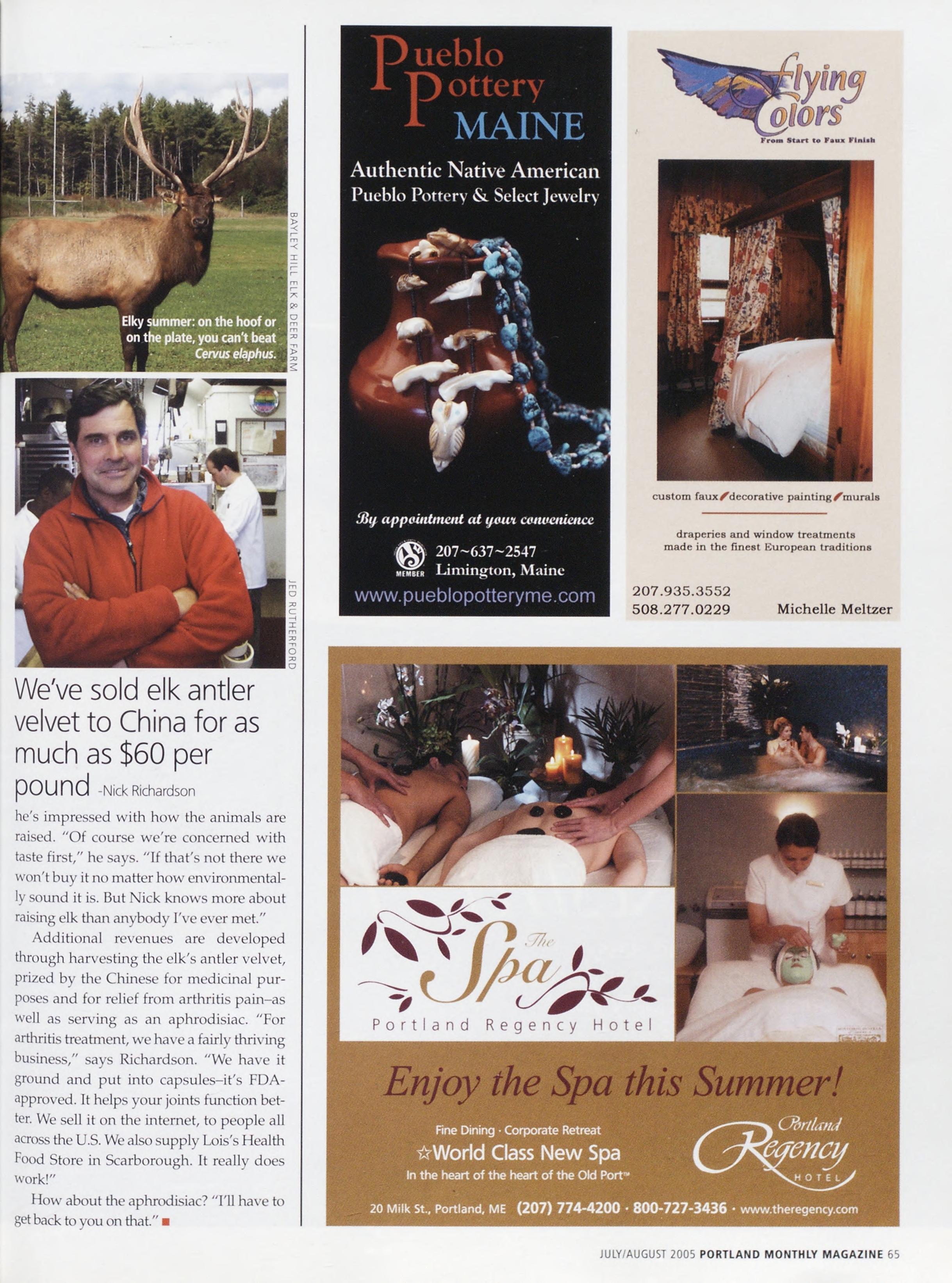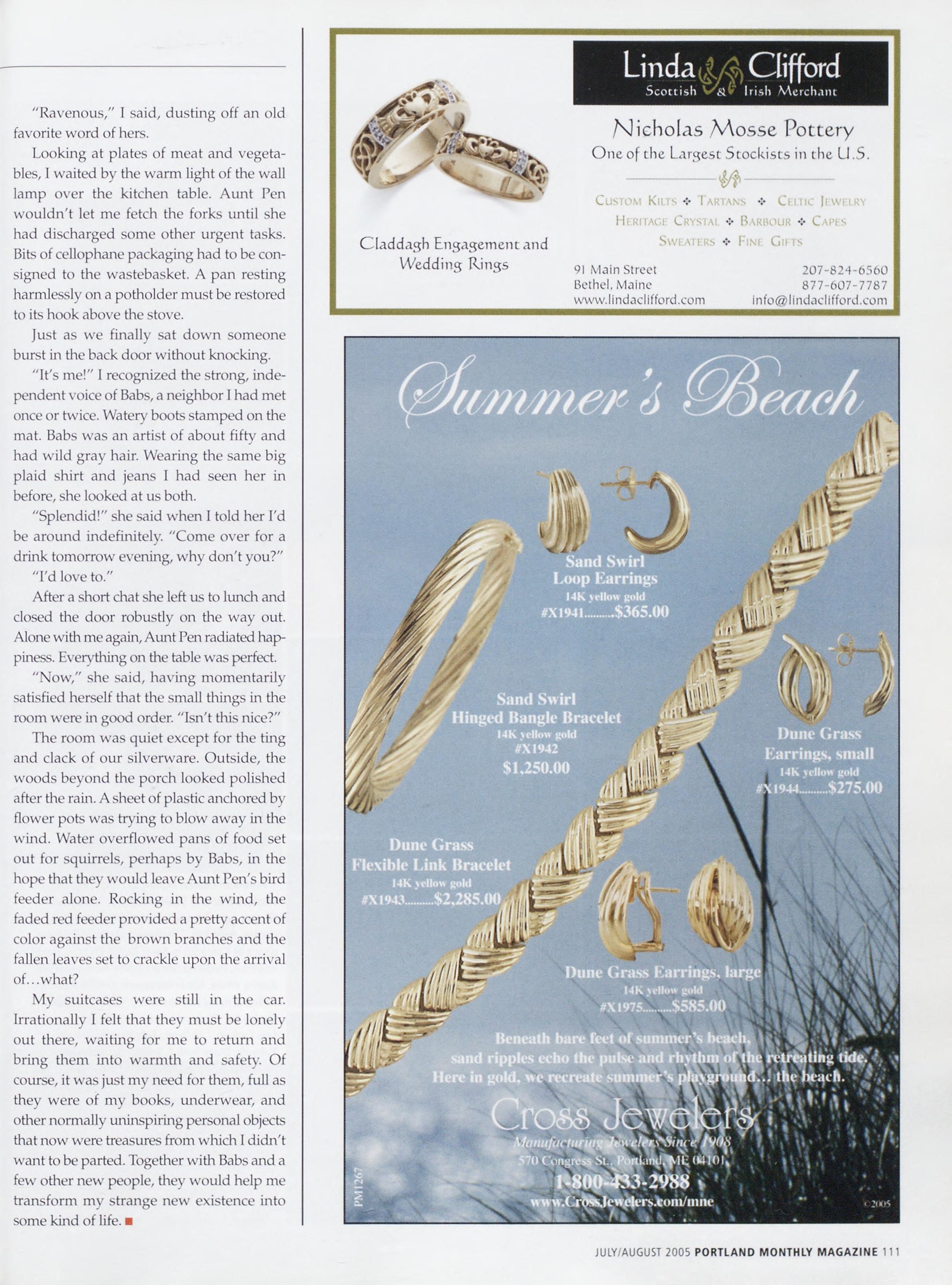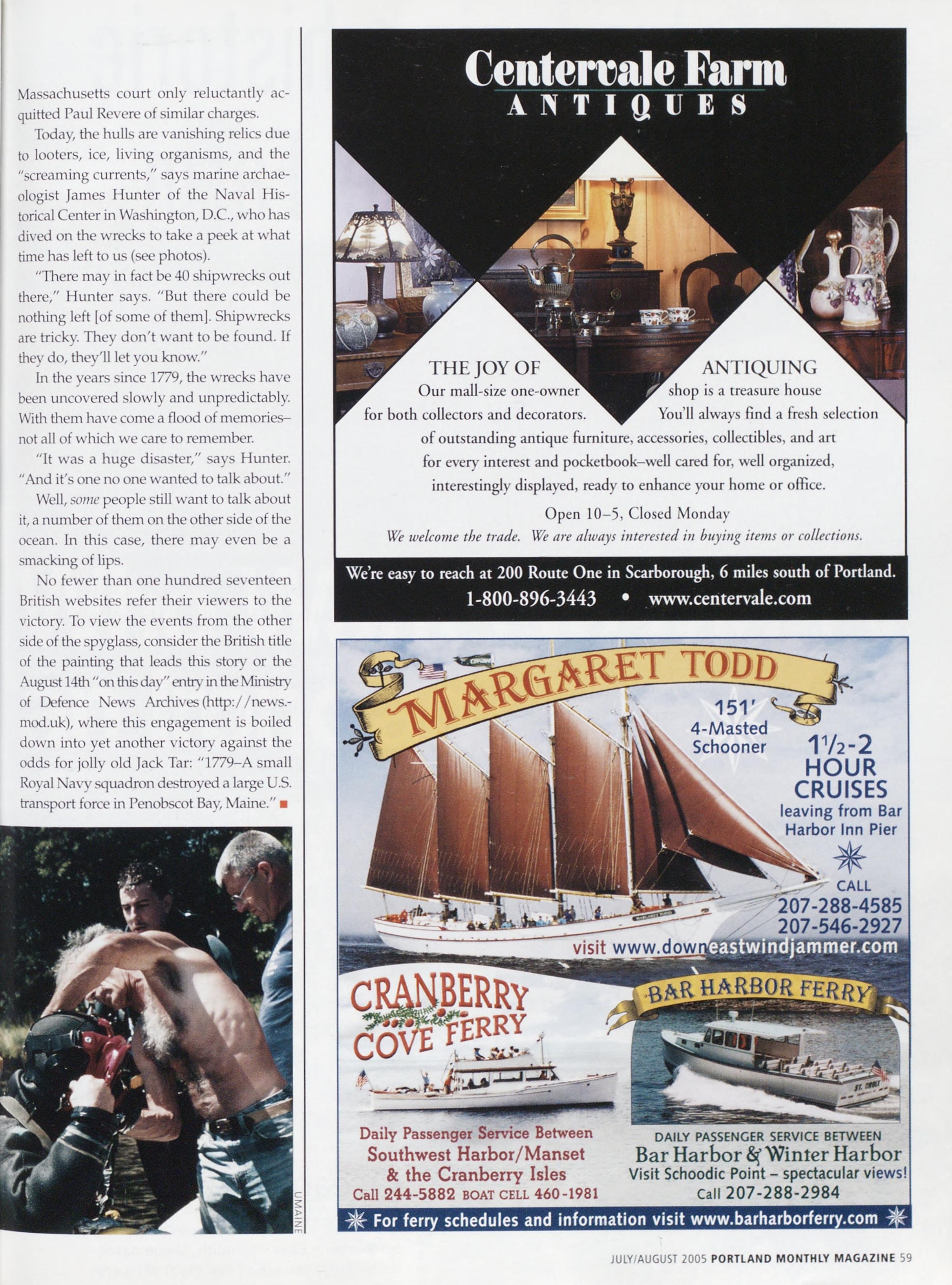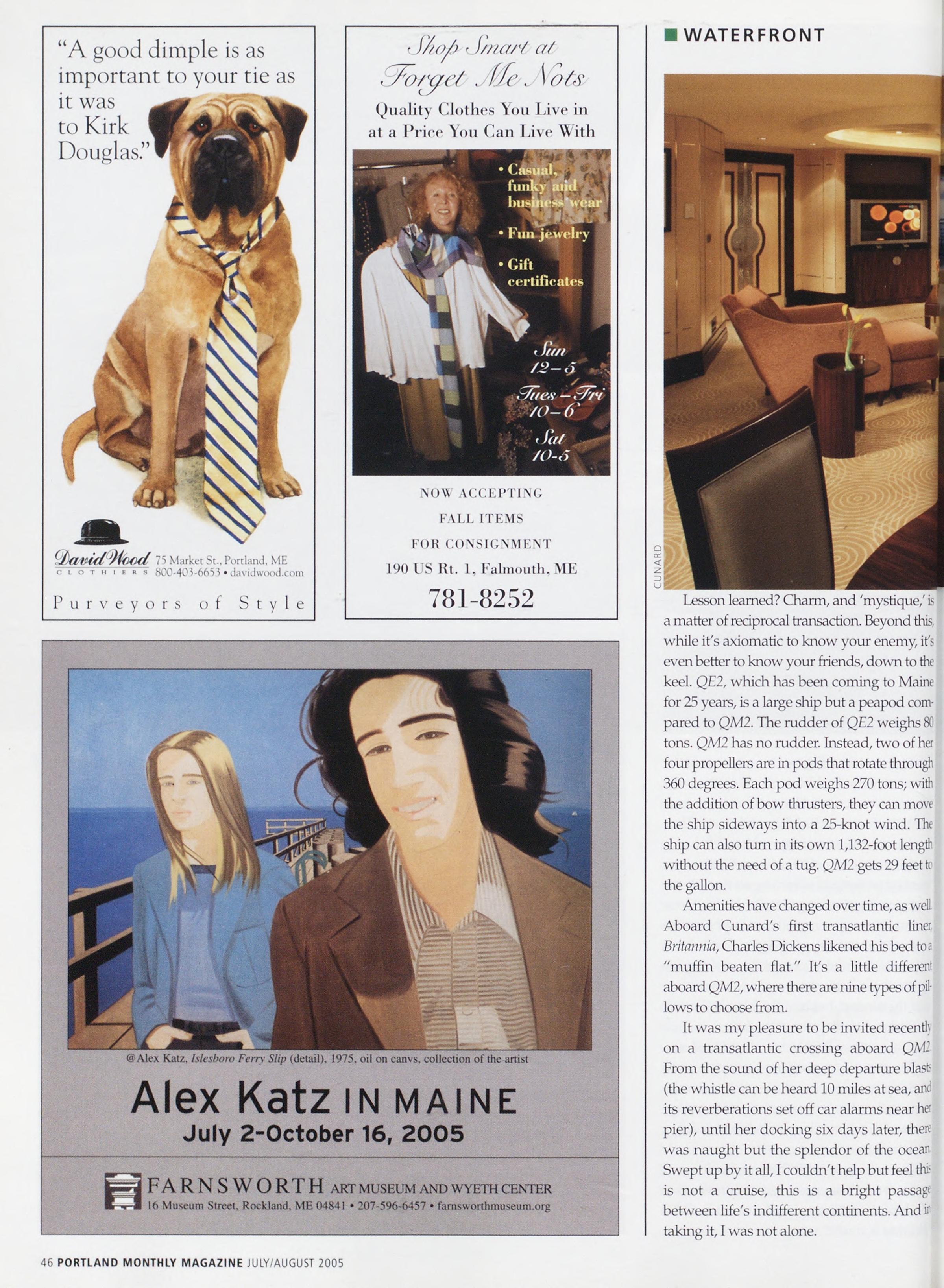 Newsstand Cover Date: July/August 2005, published in June 2005, Vol. 20, No. 5, copyright 2005.Portland Magazine ismailedatthird-class mail rates in Portland, ME 04101 (ISSN: 1073-1857). Opinions expressed in articles are those of authors and do not represent editorial positions ofPortland Magazine. Letters to the editor are welcome and will be treated as unconditionally assigned for publication and copyright pur¬ poses and as subject toPortland Magazine's unrestrictedrighttoedit and comment editorially. Responsible only for that portion of any advertisement which is printed incorrectly. Advertisers are responsible for copyrights of materials they submit. Nothing in this issue may be reprinted in whole or in part without written permission from the pub¬ lishers. Submissions welcome, but we take no responsibility for unso¬ licitedmaterials.