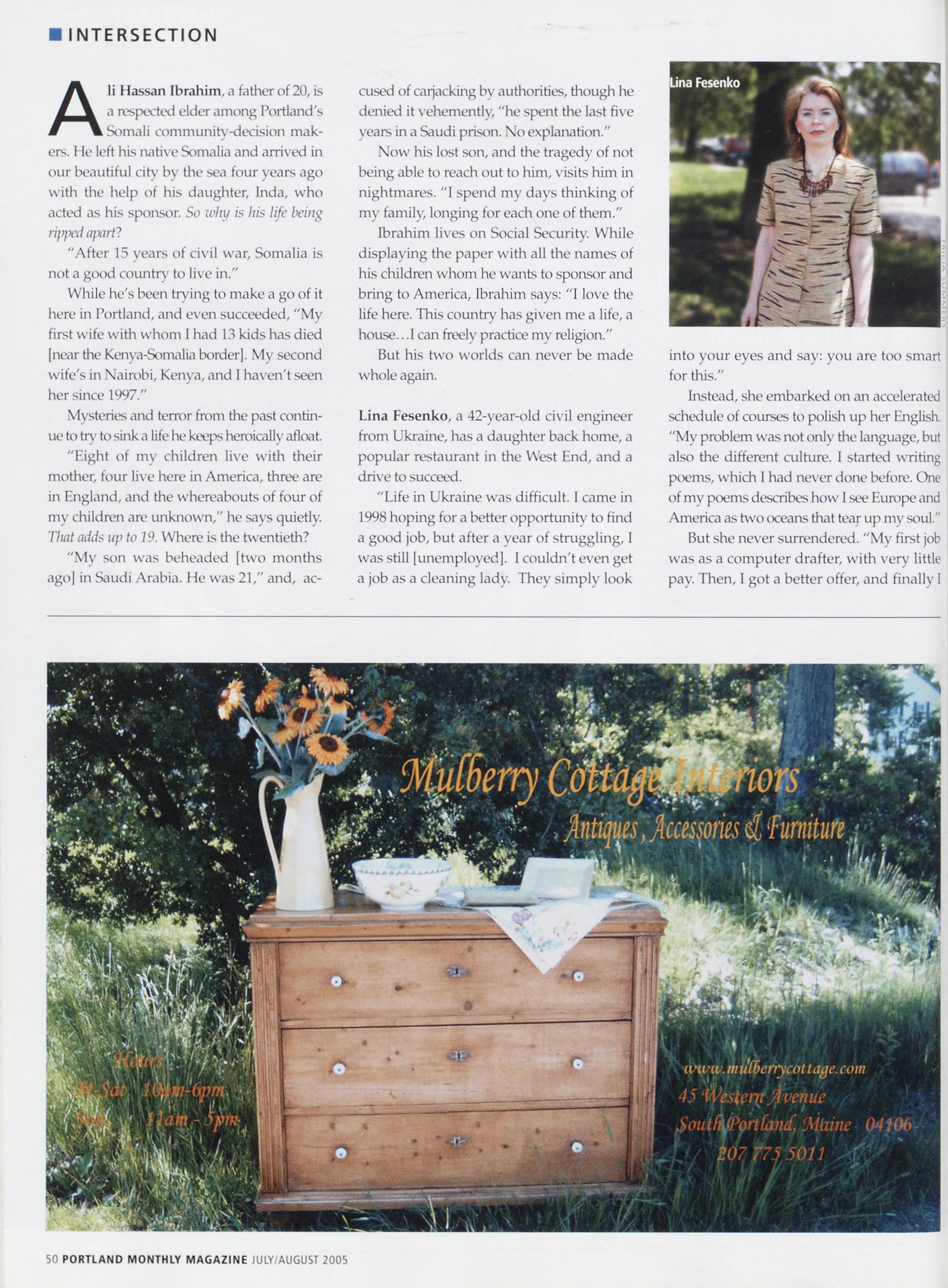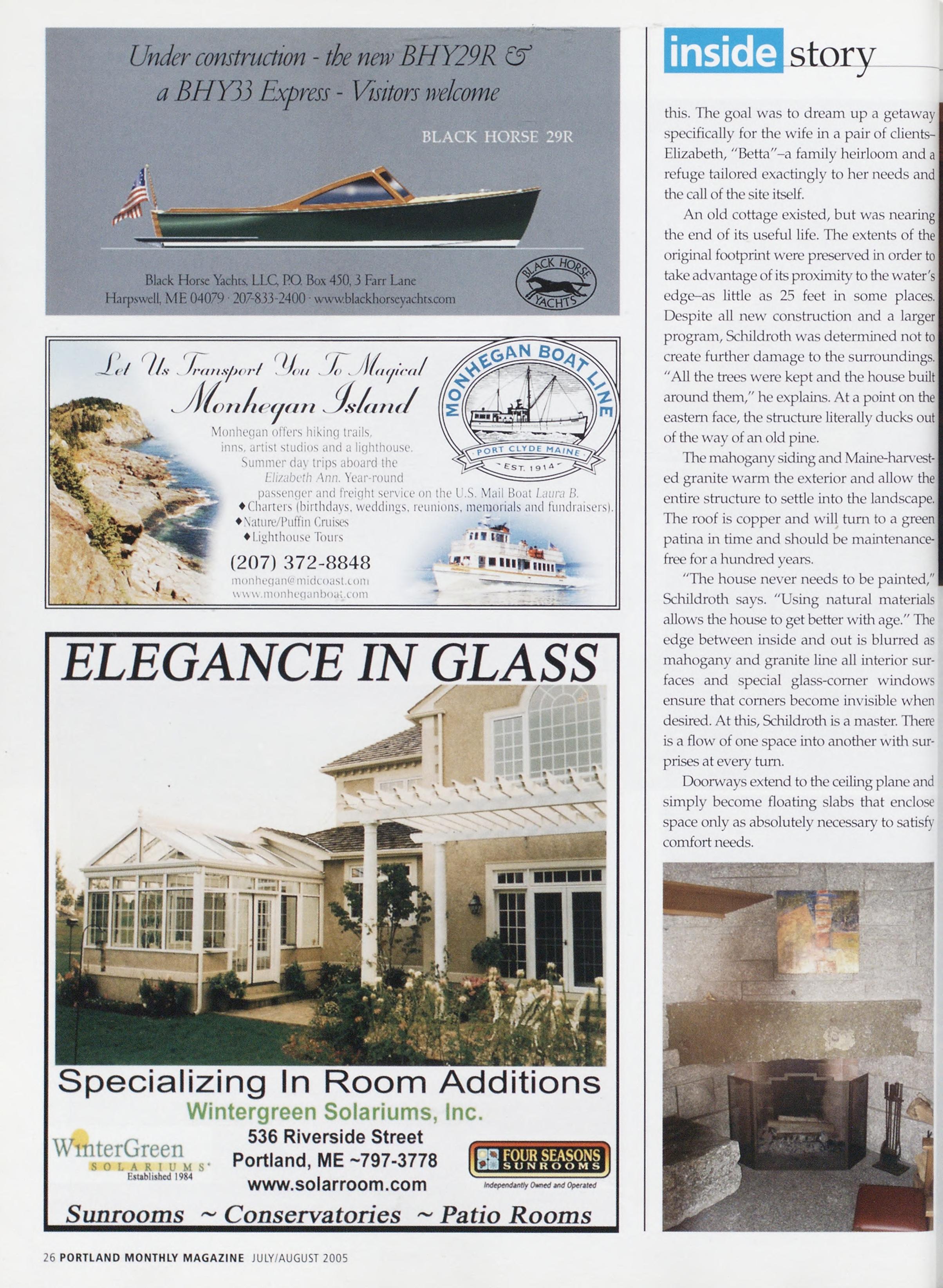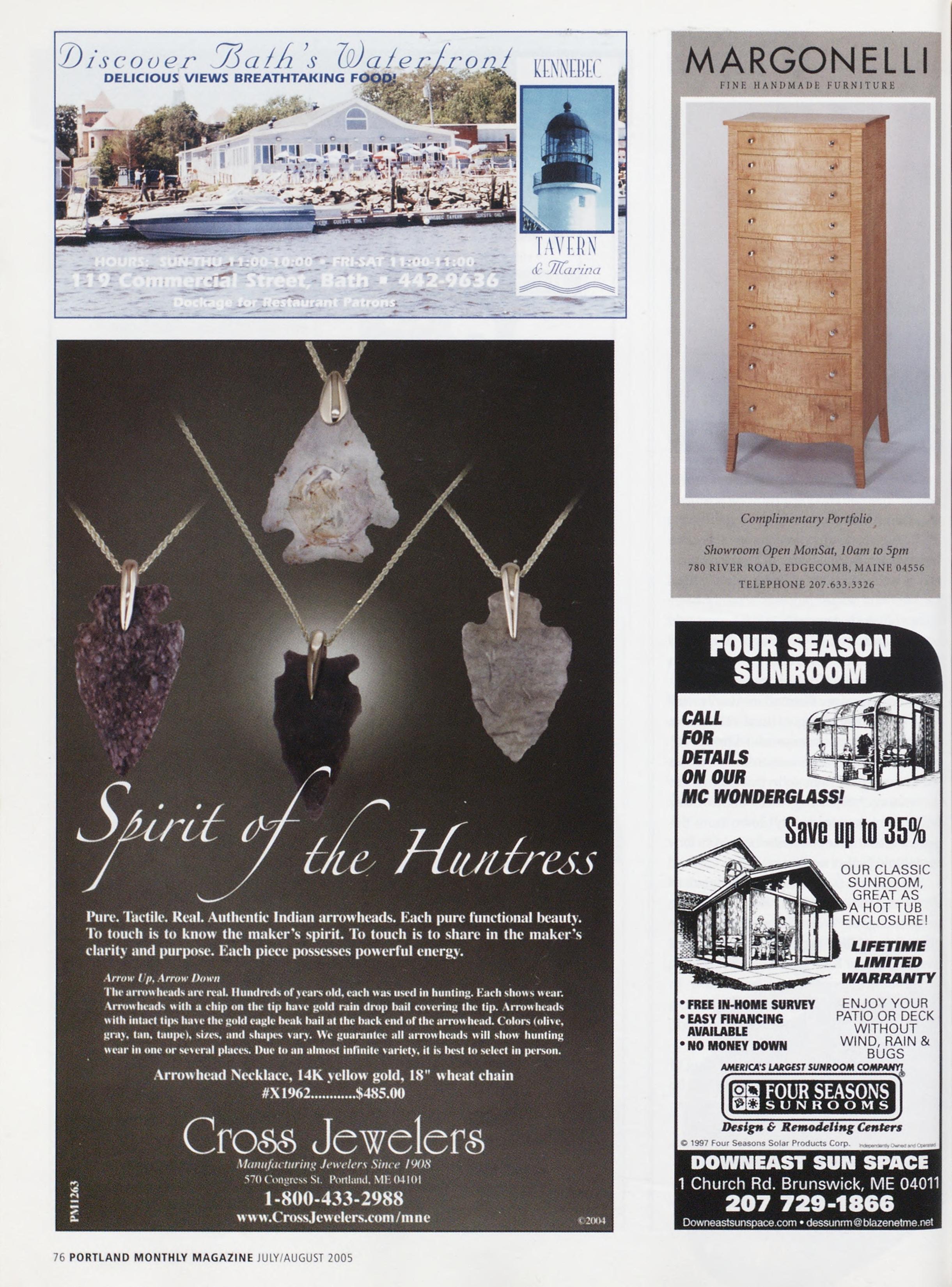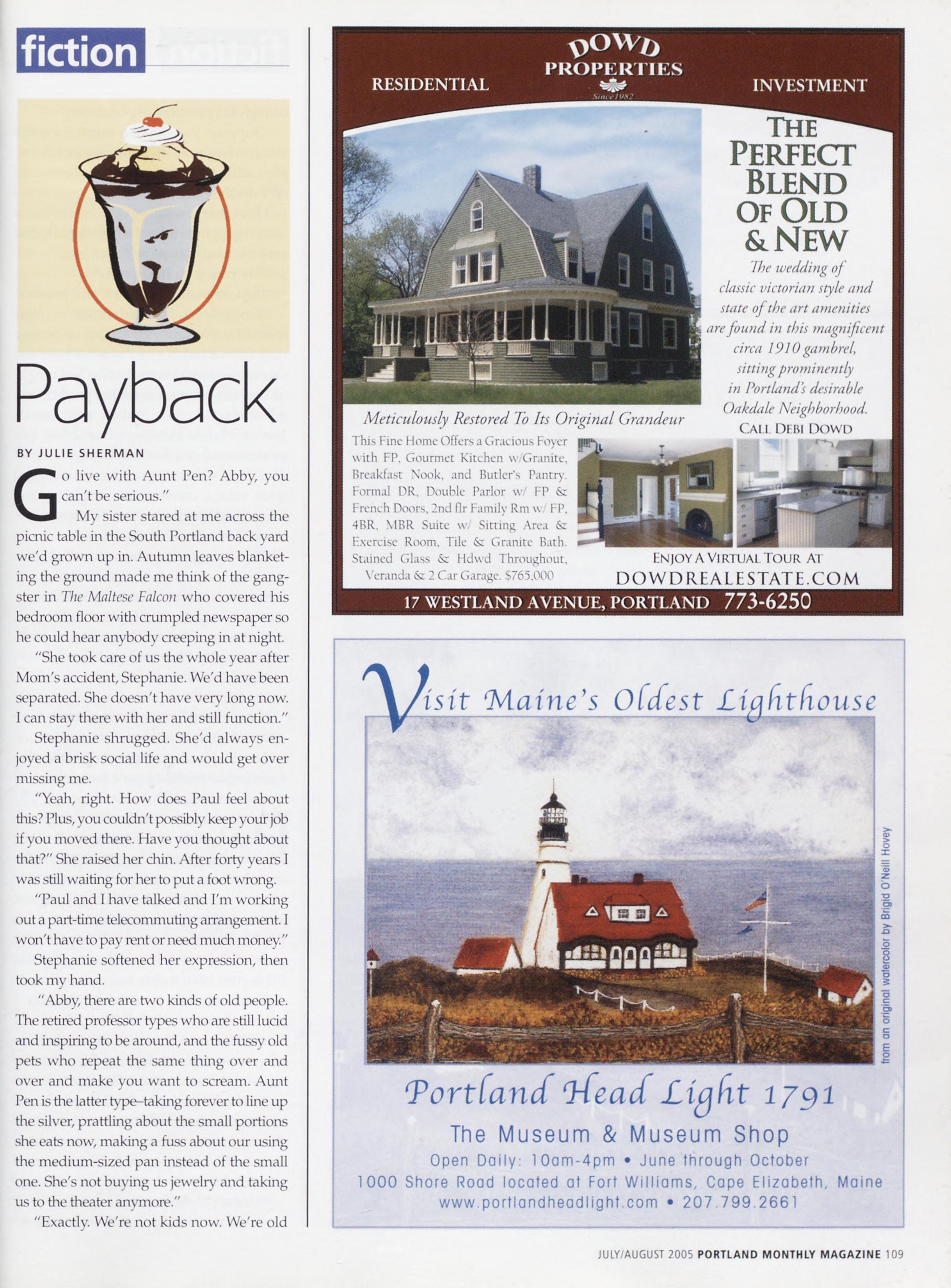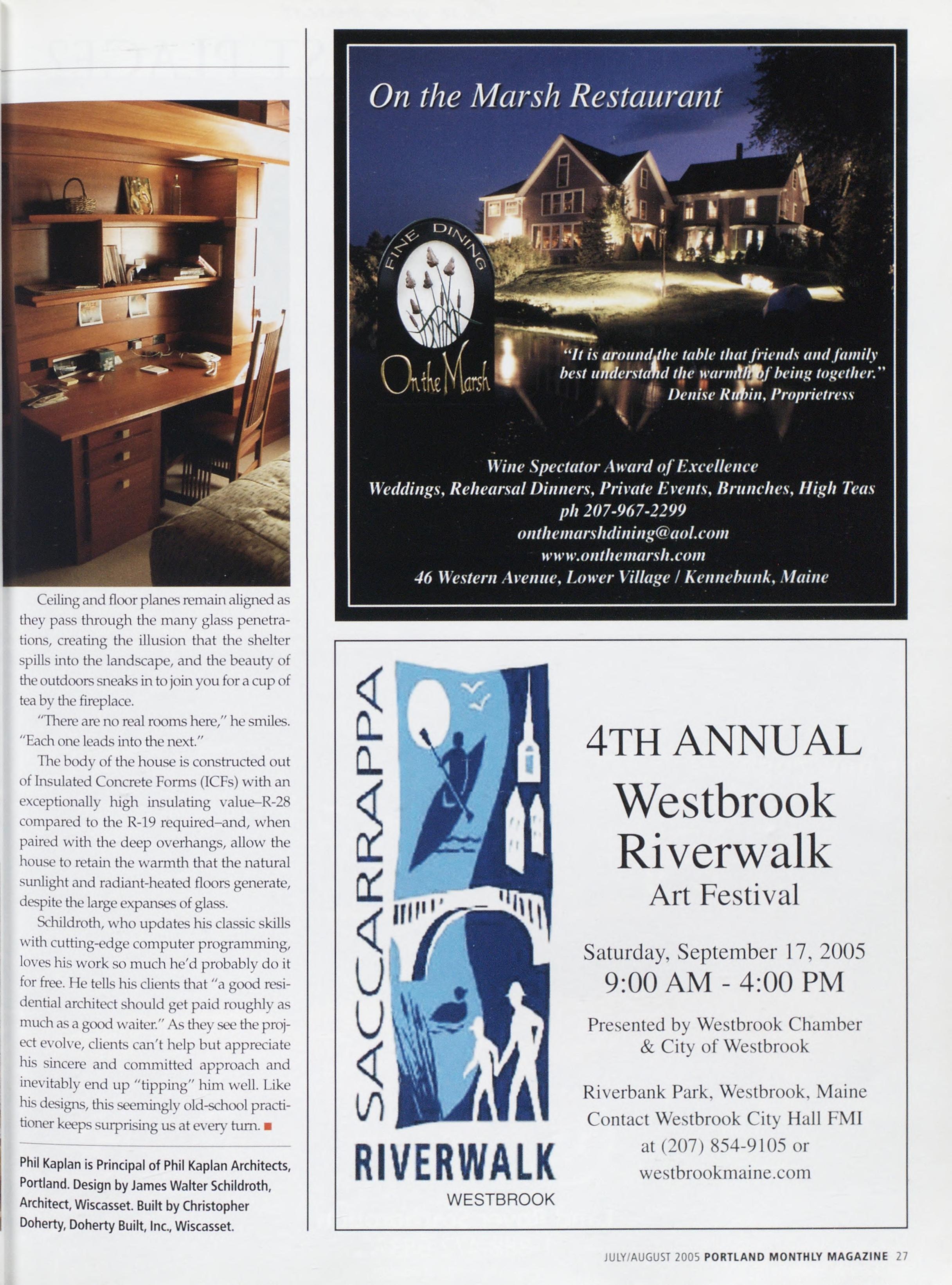 Newsstand Cover Date: July/August 2005, published in June 2005, Vol. 20, No. 5, copyright 2005.Portland Magazine ismailedatthird-class mail rates in Portland, ME 04101 (ISSN: 1073-1857). Opinions expressed in articles are those of authors and do not represent editorial positions ofPortland Magazine. Letters to the editor are welcome and will be treated as unconditionally assigned for publication and copyright pur¬ poses and as subject toPortland Magazine's unrestrictedrighttoedit and comment editorially. Responsible only for that portion of any advertisement which is printed incorrectly. Advertisers are responsible for copyrights of materials they submit. Nothing in this issue may be reprinted in whole or in part without written permission from the pub¬ lishers. Submissions welcome, but we take no responsibility for unso¬ licitedmaterials.