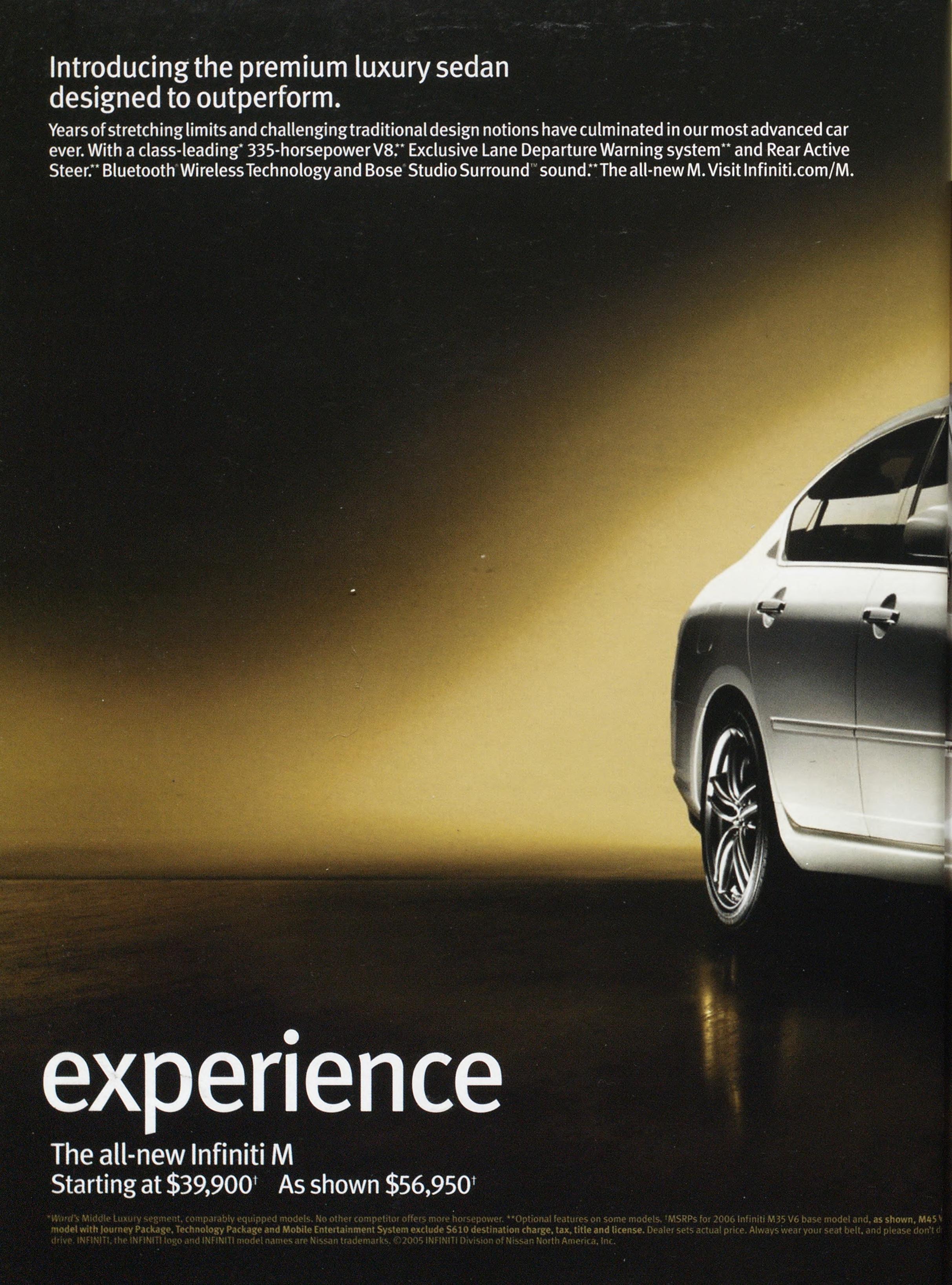 Yearsofstretchinglimitsandchallengingtraditionaldesignnotionshaveculminatedinourmostadvancedcar ever.Withaclass-leading*335-horsepowerV8.**ExclusiveLaneDepartureWarningsystem**andRearActive Steer.**Bluetooth'WirelessTechnologyandBose’StudioSurround™sound.**Theall-newM.VisitInfiniti.com/M.