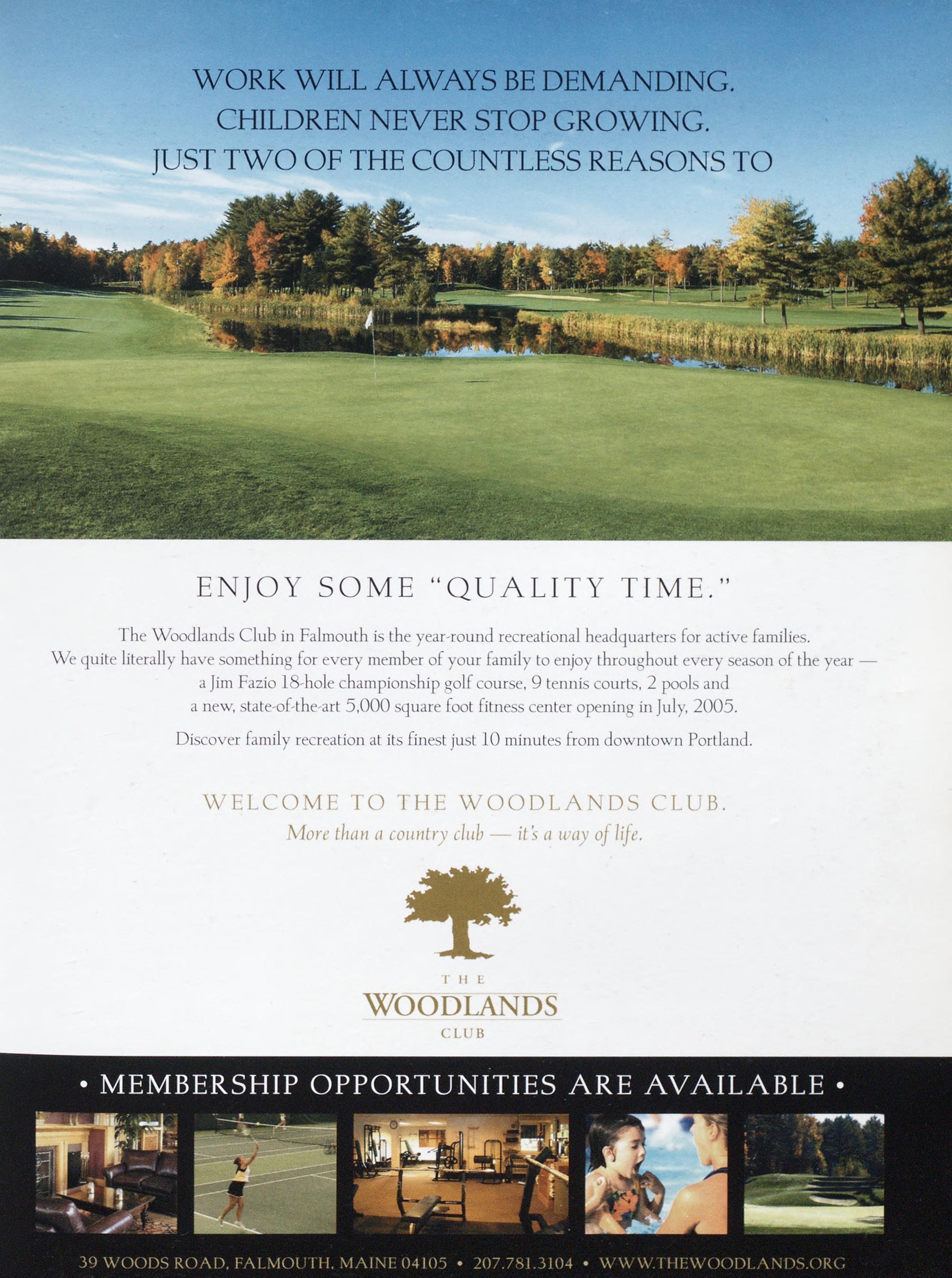 REASONS TO ENJOY SOME "QUALITY TIME.” TheWoodlandsClubinFalmouthistheyear-roundrecreationalheadquartersforactivefamilies. Wequiteliterallyhavesomethingforeverymemberofyourfamilytoenjoythroughouteveryseasonoftheyear— aJimFazio18-holechampionshipgolfcourse,9tenniscourts,2poolsand anew,state-of-the-art5,000squarefootfitnesscenteropeninginJuly,2005.