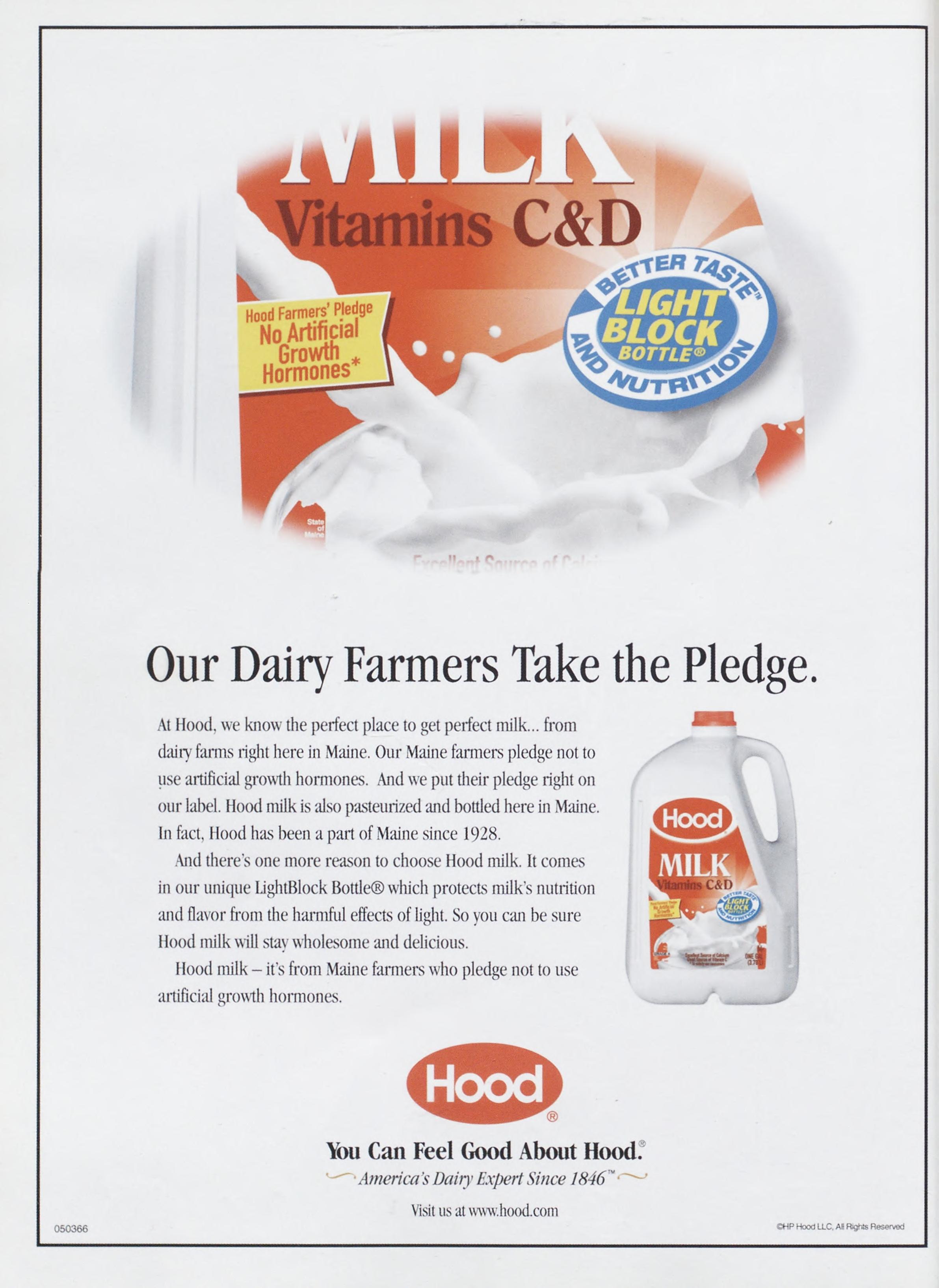 OurDairyFarmersTakethePledge. AtHood,weknowtheperfectplacetogetperfectmilk...from dailyfarmslighthereinMaine.OurMainefarmerspledgenotto useartificialgrowthhormones.Andweputtheirpledgerighton ourlabel,floodmilkisalsopasteurizedandbottledhereinMaine. Infact.HoodhasbeenapartofMainesince1928.