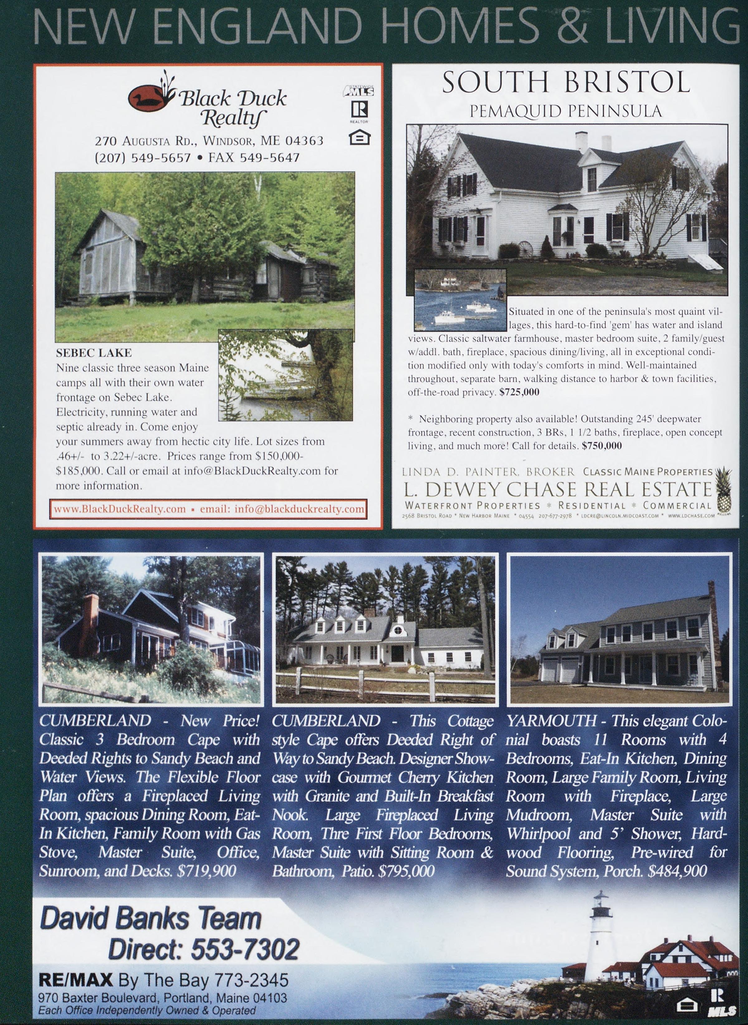 HIGH LEDGE AT SPRUCE POINT: Spectacular location at the en¬ trance of Linekin Boy and Boothbay Harbor. View Squirrel Island & open ocean. Spacious 5 bedroom log home features expansive glass, a stone fireplace & garage $1,980,000. Call Scott Christopher 207-947-7841.