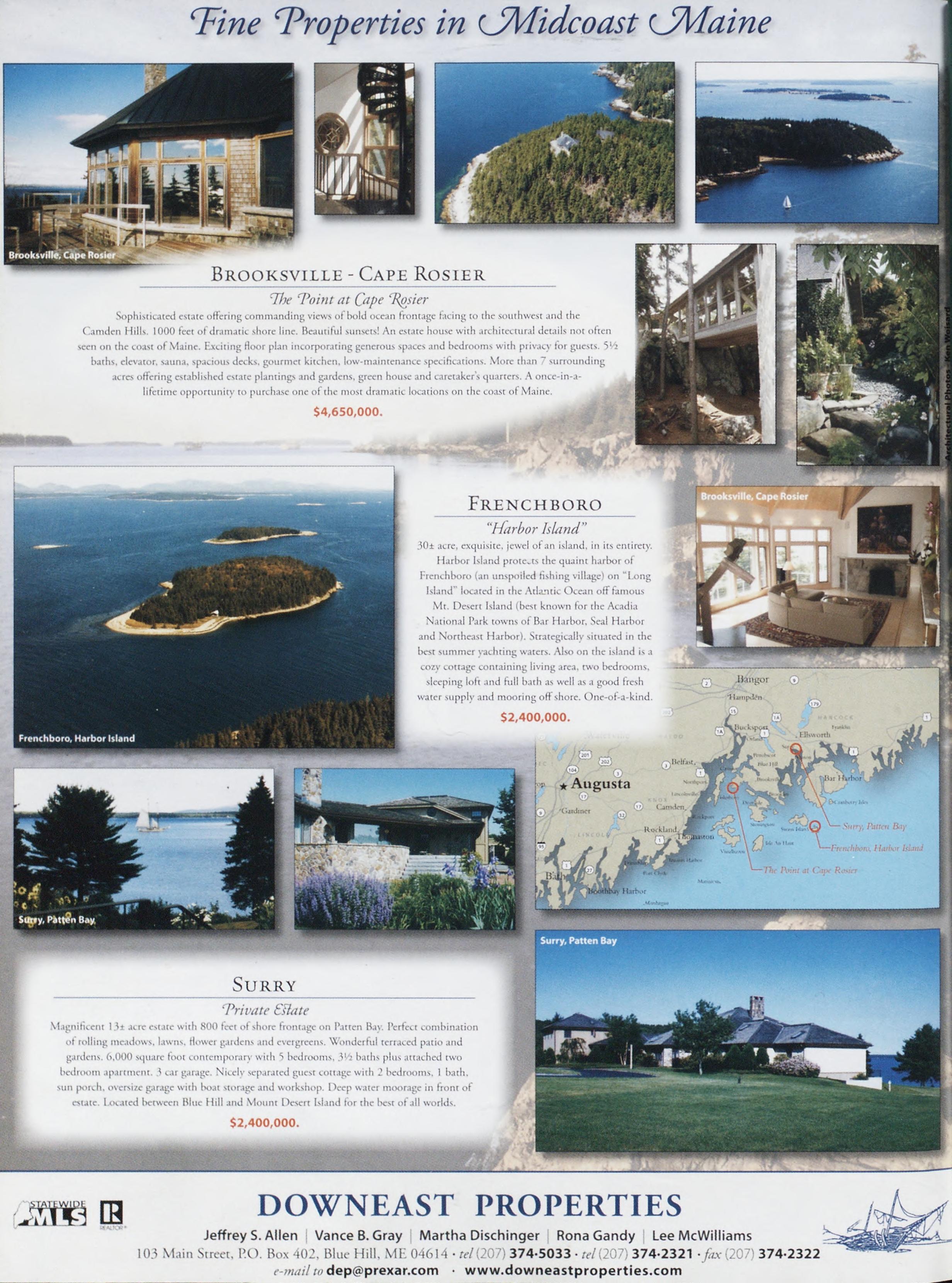 Brooksville - Cape Rosier Tlx Taint at Tester Sophisticated estate offering commanding views of bold ocean frontage facing to the southwest and the CamdenHills.1000feetofdramaticshoreline.Beautifulsunsets!?\nestatehousewitharchitecturaldetailsnotoften seen on the coast of Maine. Exciting Hoor plan incorporating generous spaces and bedrooms with privacy for guests. 5 l/i baths, elevator, sauna, spacious decks, gourmet kitchen, low-maintenance specifications. More than 7 surrounding acresofferingestablishedestateplantingsandgardens,greenhouseandcaretaker'squarters.Aonce-in-alifetime opportunity to purchase one of the most dramatic locations on the coast of Maine. $4,650,000.